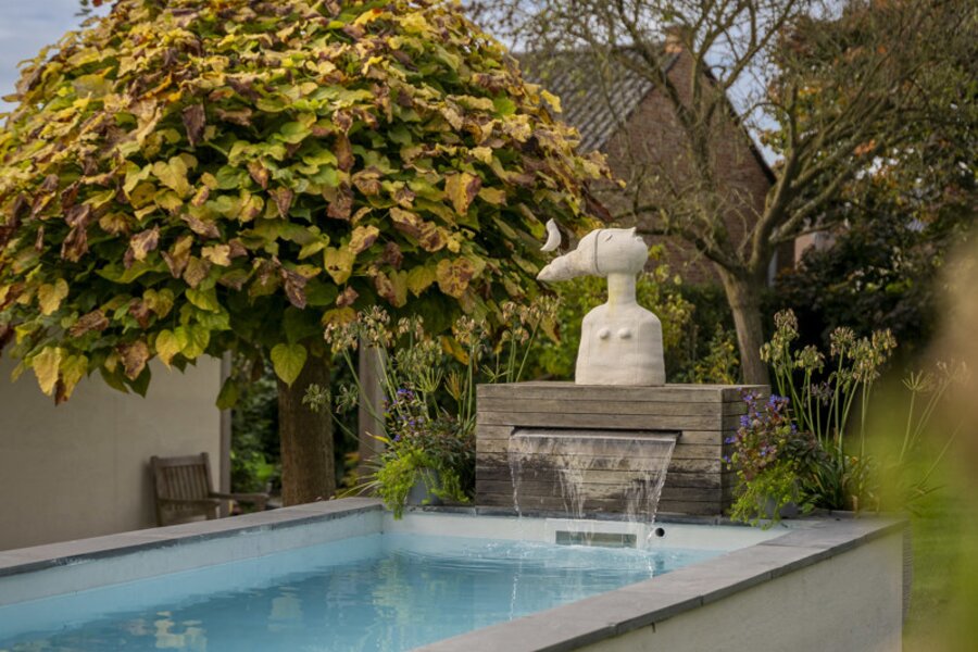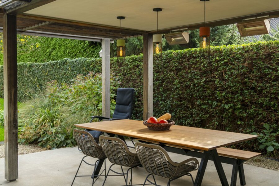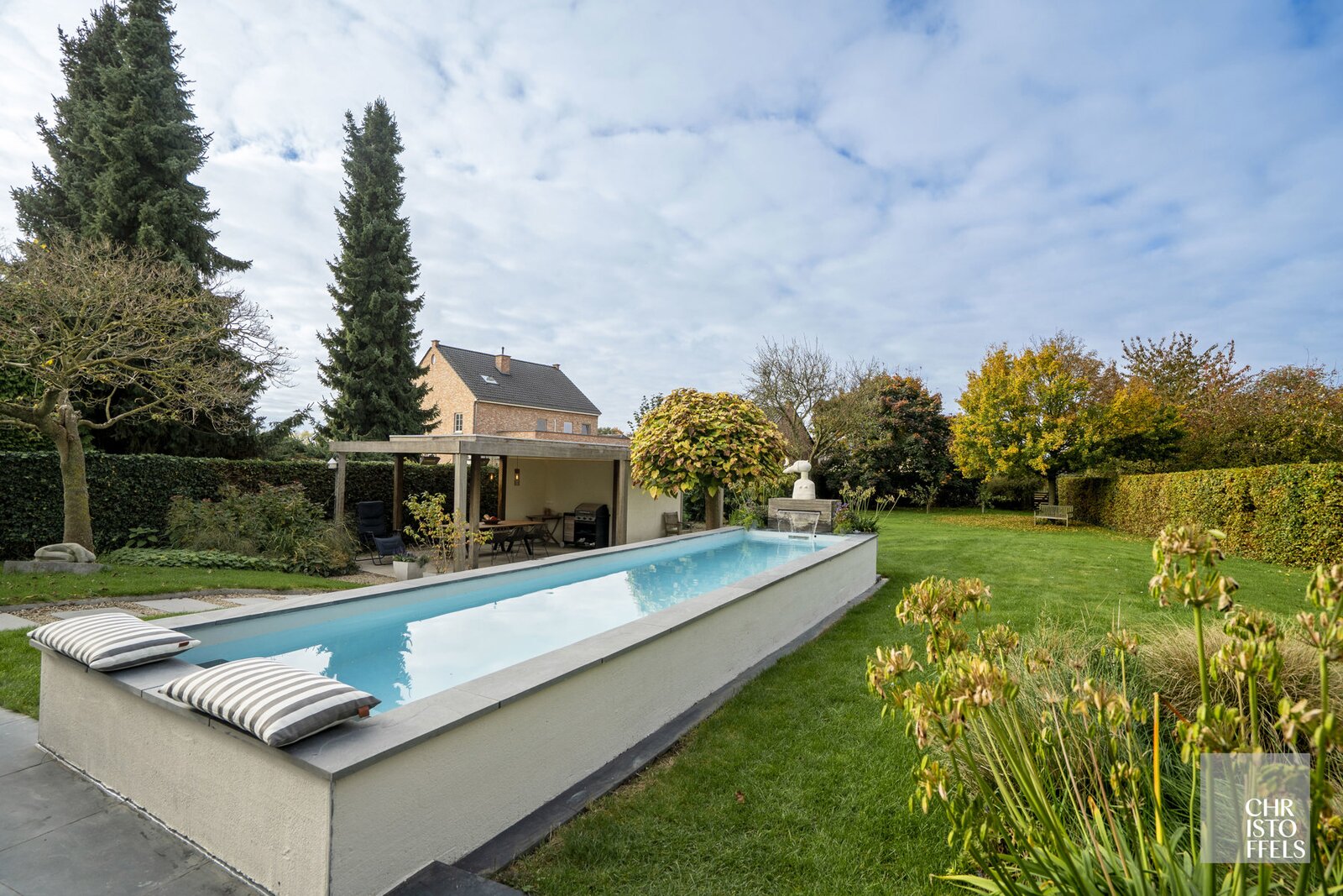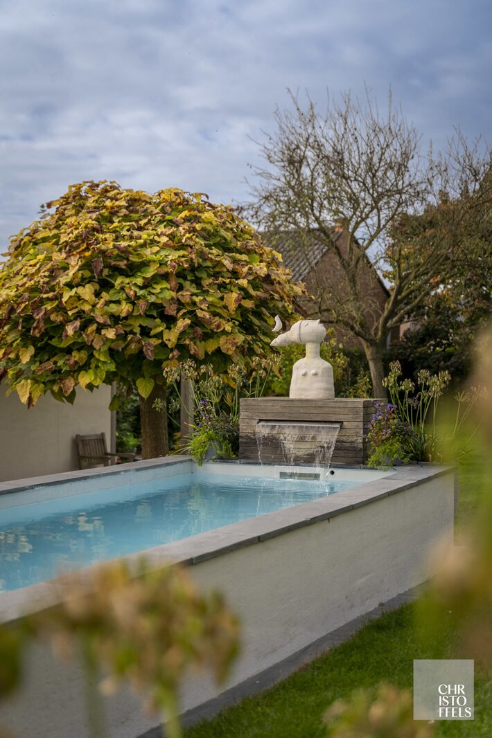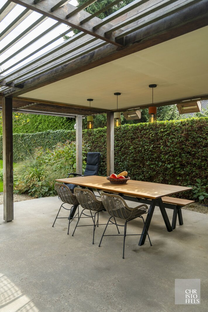 The west-facing, fully landscaped garden is completely fenced and designed with tranquility and privacy in mind. It includes a raised terrace adjacent to the living area, a heated swimming pool with a filtration system, and a garden shed with an additional covered terrace equipped with heating elements.