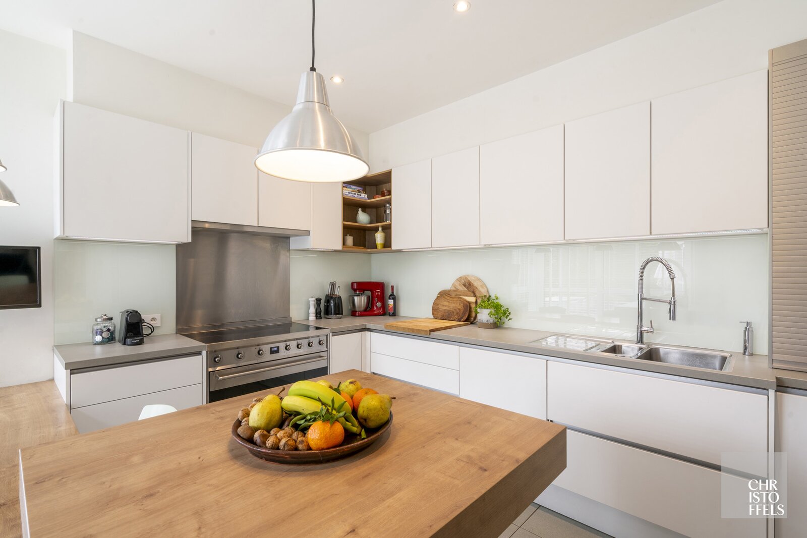 The renovated custom kitchen (2016) has a ceramic countertop and premium appliances, including an American-style fridge, a Smeg stove with induction cooktop and integrated oven, extractor hood, dishwasher, double sink, and a practical coffee corner.