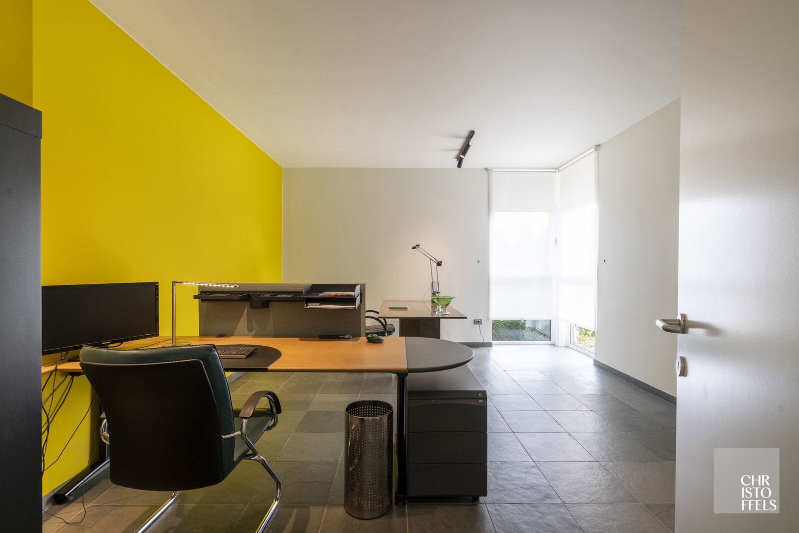 Further on the ground floor, there is a utility room with built-in cupboards and connections for a washing machine and dryer, a second separate toilet, and a large office — ideal for working from home or running a professional practice.