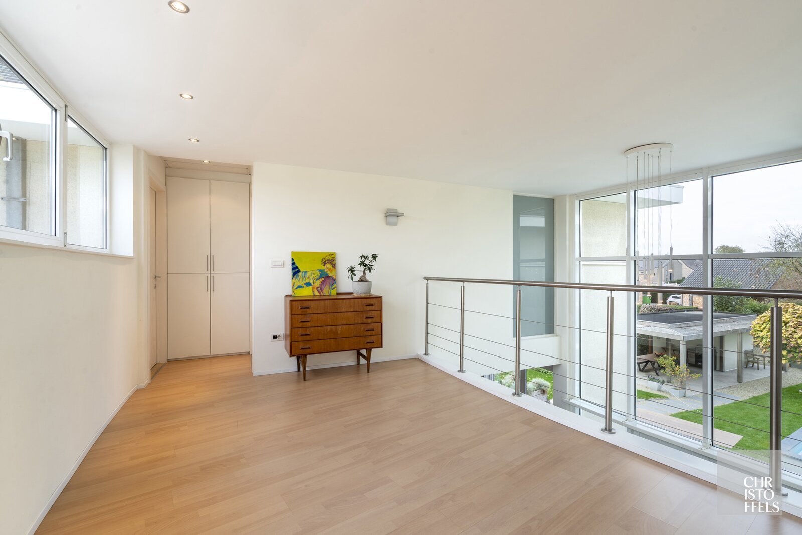 On the first floor, a generous landing with a double-height ceiling connects all spaces, creating an open and airy atmosphere. Here, you will find the master bedroom with a private dressing room and ensuite bathroom. On the other side of the landing are three additional full-sized bedrooms and a second bathroom.