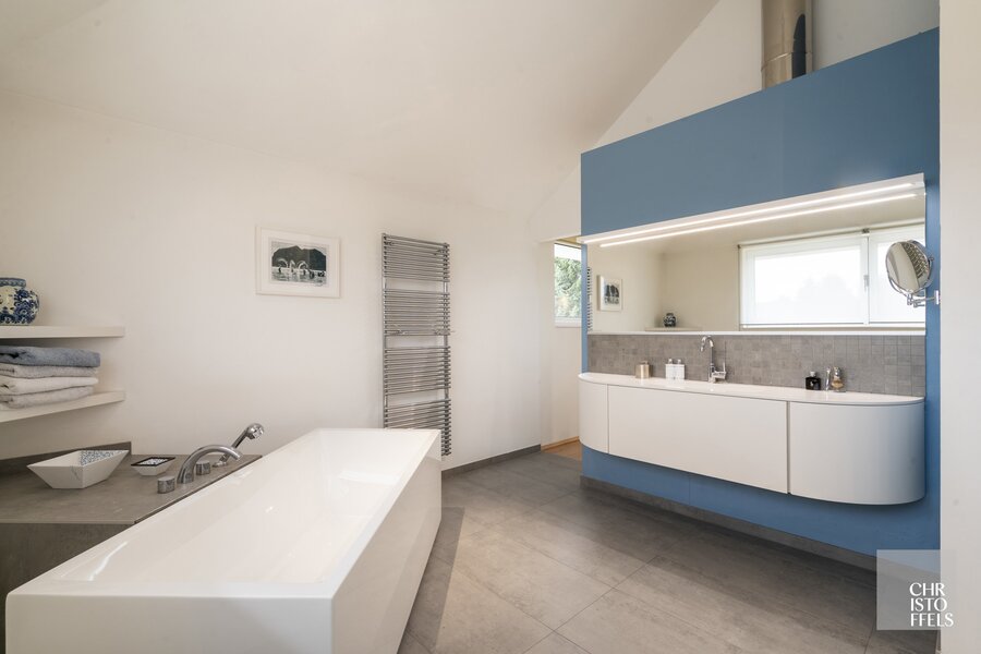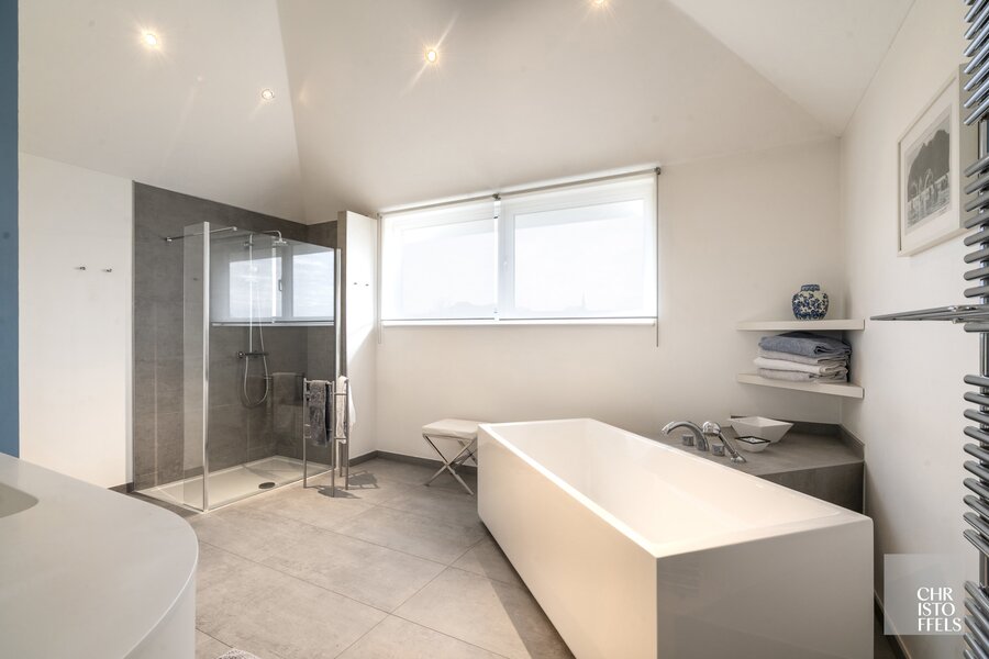 The ensuite master bathroom has been luxuriously renovated and includes a freestanding bathtub, a walk-in shower, and a sleek vanity unit with washbasin.