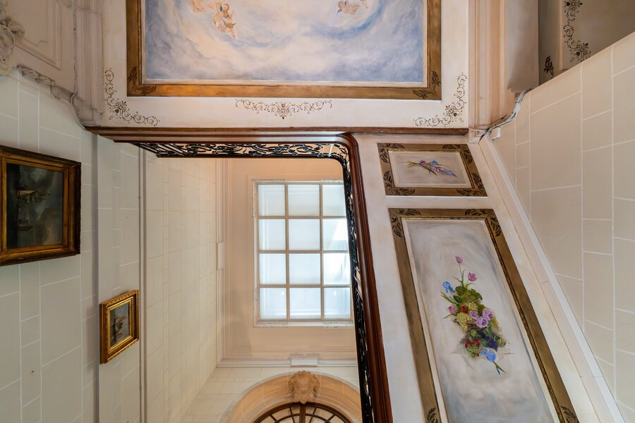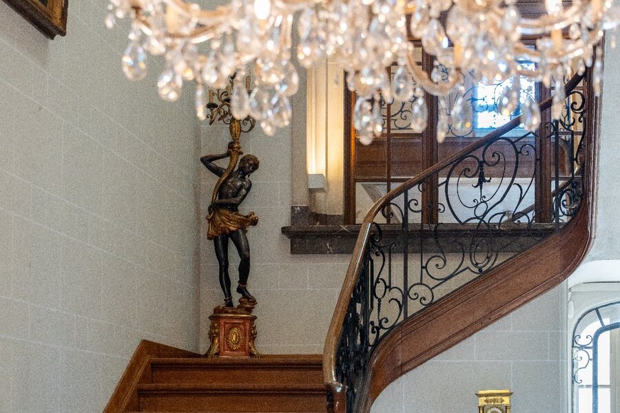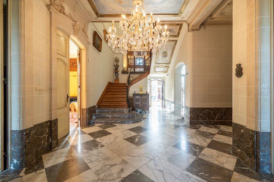 De gelijkvloerse verdieping bestaat uit een ruime inkomhal die leidt naar meerdere ontvangstruimtes en een eetkamer, evenals een hedendaagse keuken. Op de eerste verdieping bevinden zich vier slaapkamers, een salon, een dressing, een badkamer en kantoorruimtes. De tweede verdieping omvat vier bijkomende slaapkamers en een badkamer. Het souterrain op tuinniveau (ca. 374 m²) beschikt over een conciërgewoning met twee slaapkamers, atelier, koelruimte, kelders, stookruimte en sanitaire voorzieningen. Een inrichtbare zolder van ongeveer 200 m² vervolledigt het geheel.