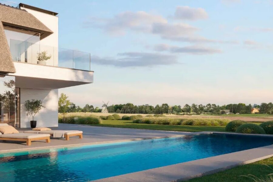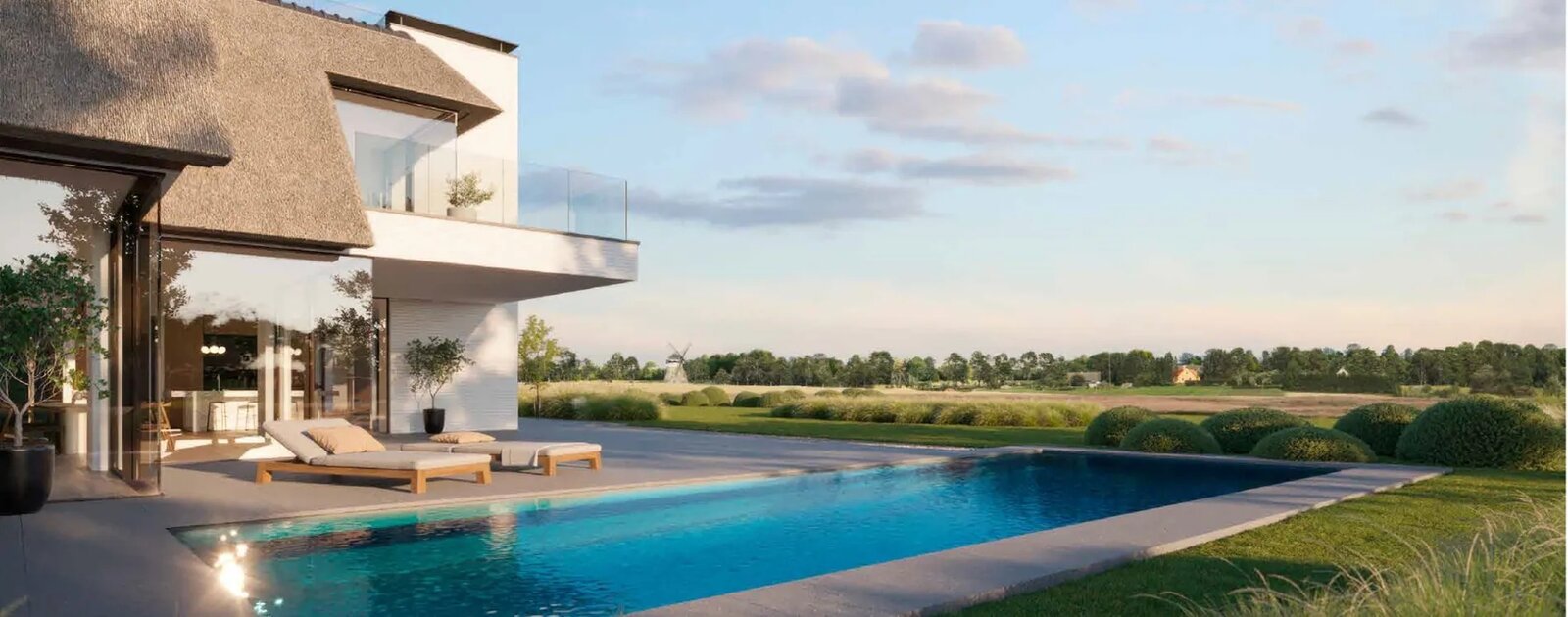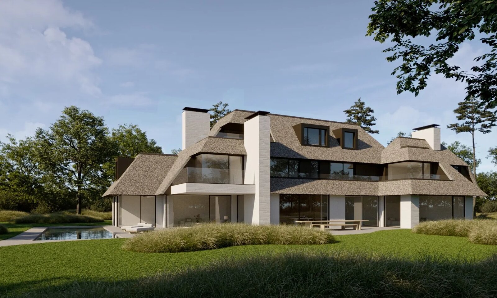 Bij het betreden van de woning vallen de royale volumes meteen op. Twee lichtrijke salons en een eetruimte sluiten harmonisch aan op de open keuken, die uitkijkt op de omliggende weilanden. De leefruimtes zijn ontworpen met aandacht voor comfort en ontvangst, aangevuld met een bureau voor thuiswerk, een TV-kamer voor kinderen en een praktische bijkeuken. Grote raampartijen verbinden binnen met buiten en leiden naar ruime terrassen, een verwarmd zwembad met luxueuze poolhouse en een prachtig aangelegde tuin in duinstijl, zuidgericht en met open zichten tot 180°.