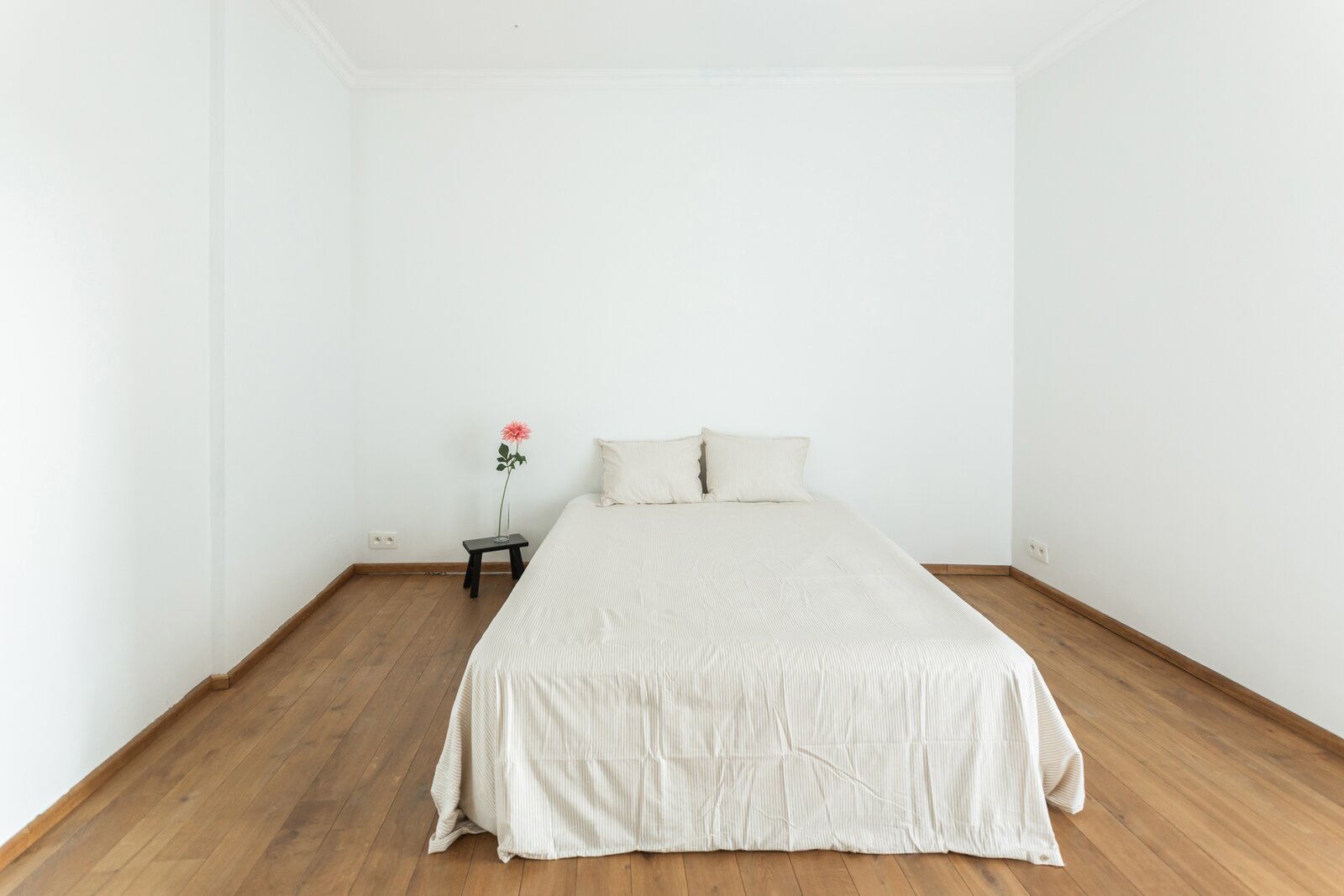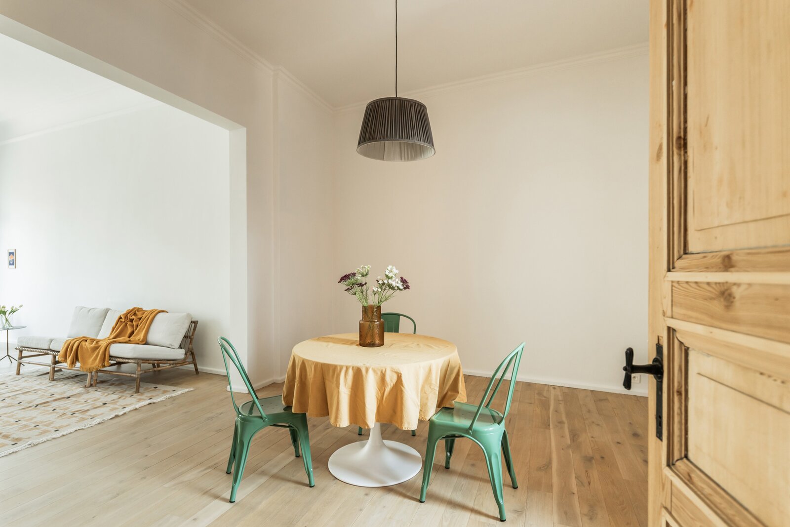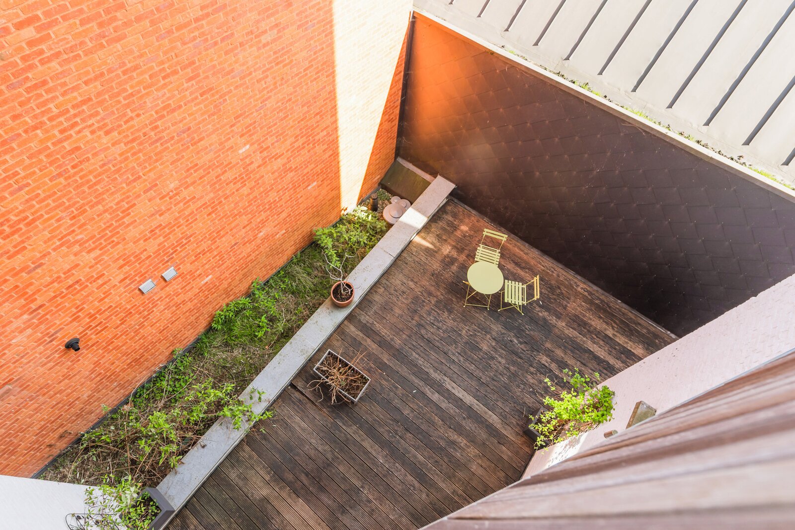 Stairs to the triplex: on +1 a laundry room, office space and terrace. One floor up you reach the living room, a beautiful open kitchen with island and a large stylish bathroom with bath and shower. High ceilings and large windows bring in plenty of light. The bay window in the living room is perfect for enjoying the sun and the square’s activity. Or enjoy an aperitif on the terrace by the kitchen. One level higher are the bedrooms and a second, smaller bathroom.