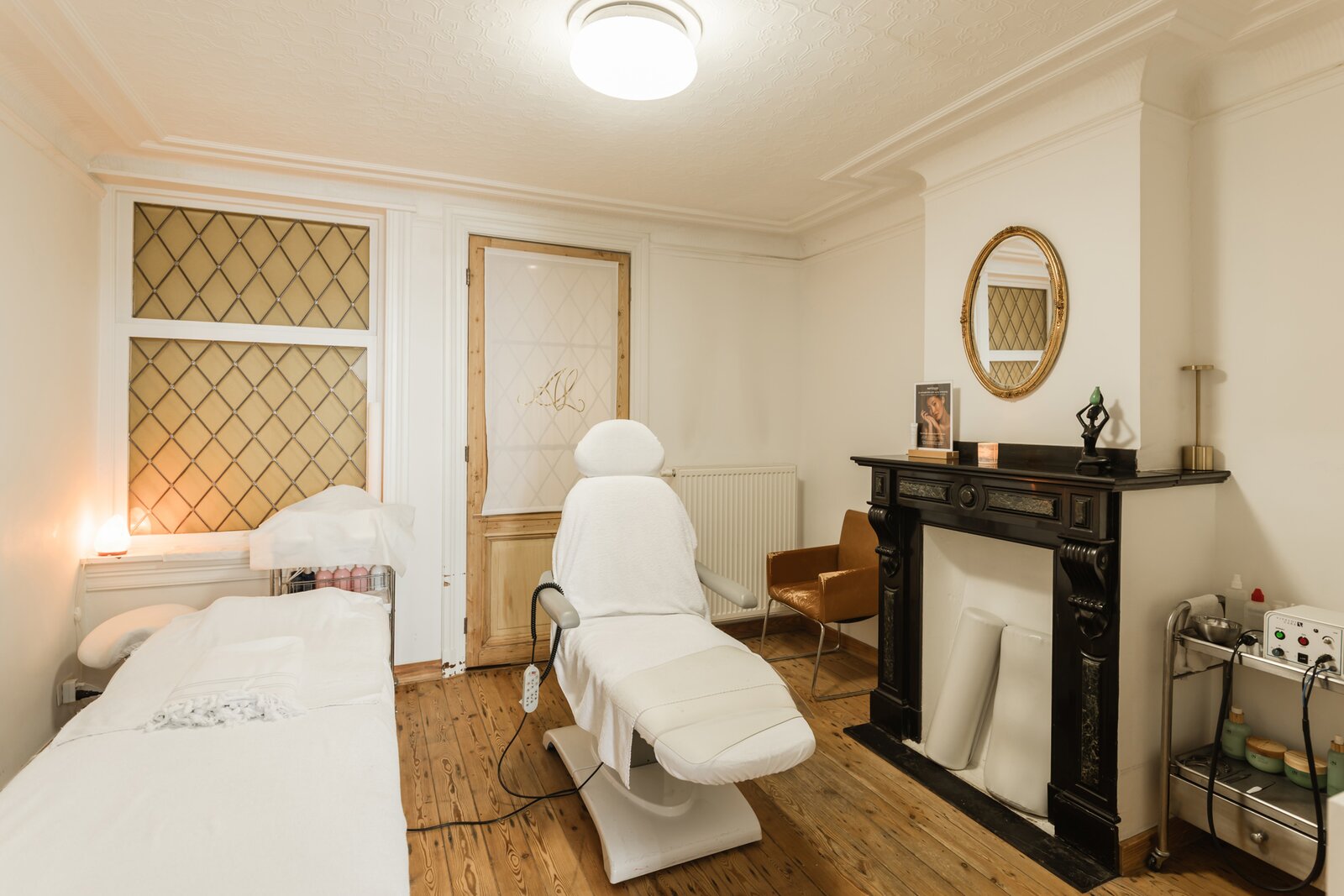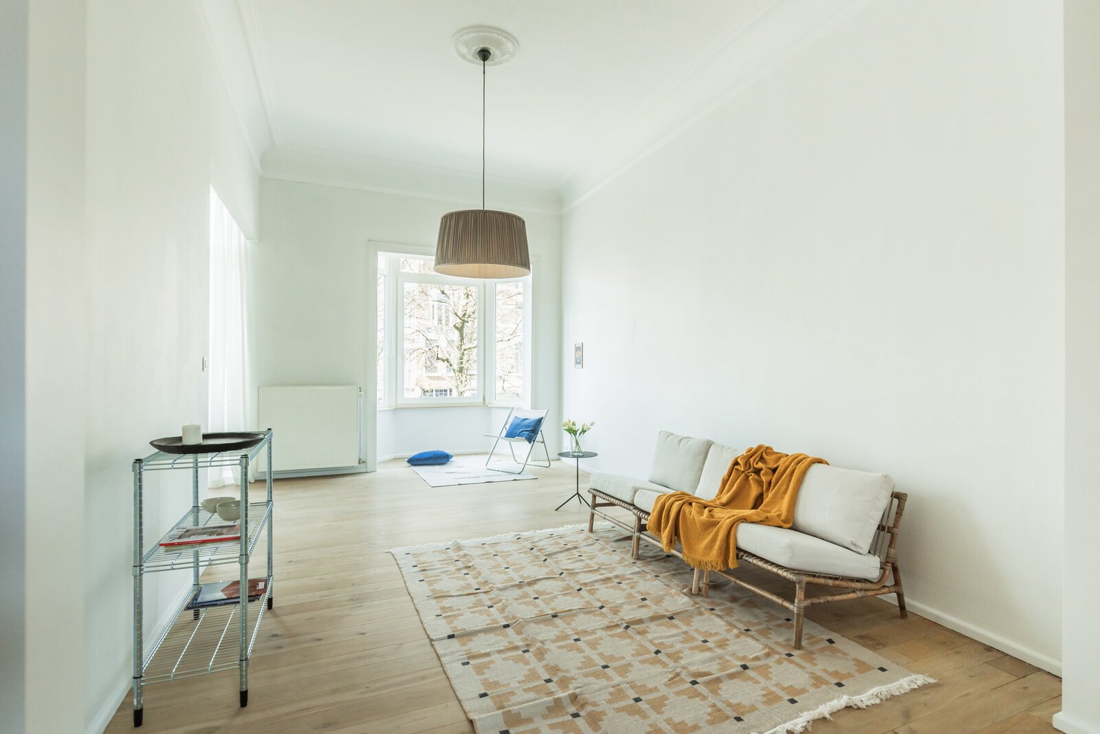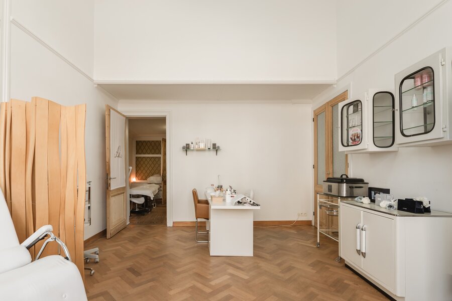 The first entrance leads to the separately licensed commercial space with front and rear areas on the ground floor, beautiful herringbone parquet and marble fireplace. Separate toilet. Rear space can be extended. Previously rented as a beauty salon.
