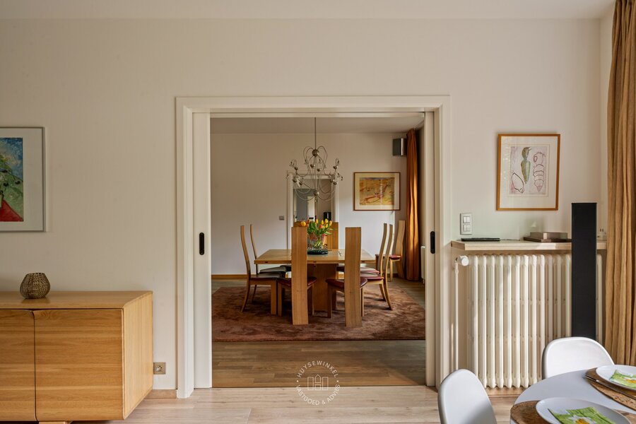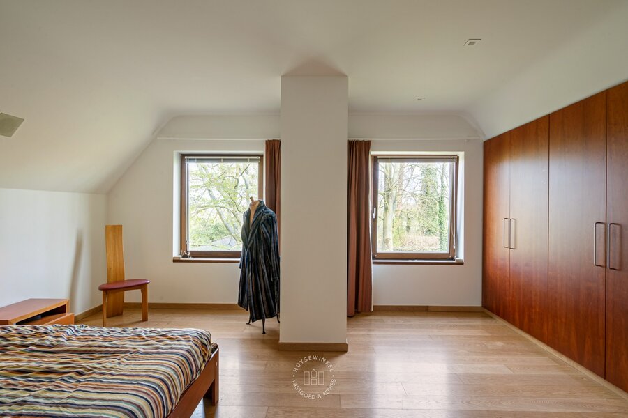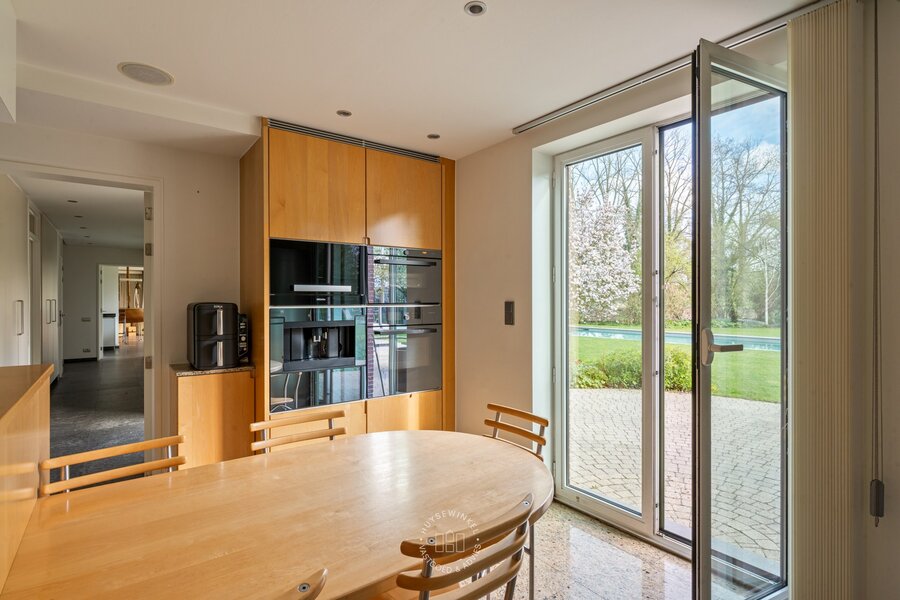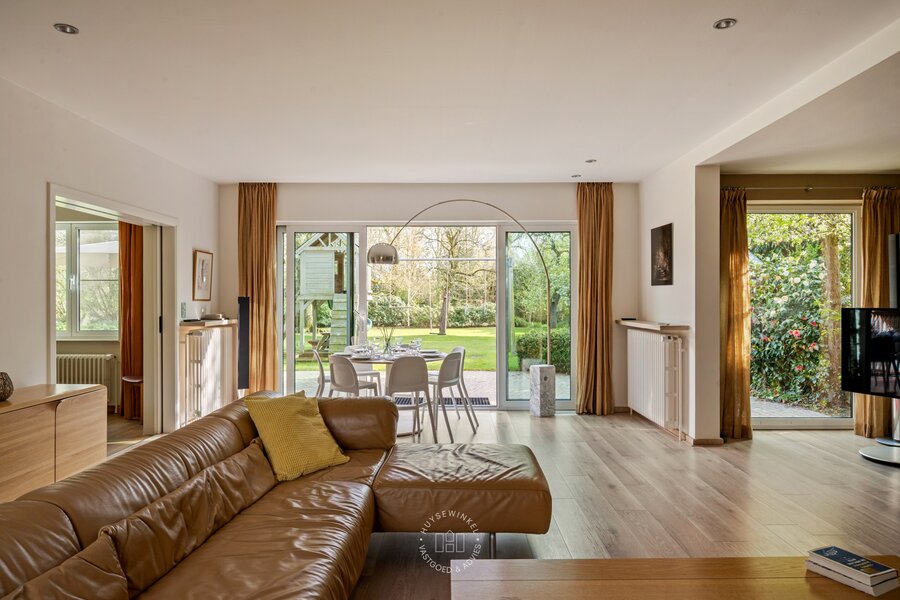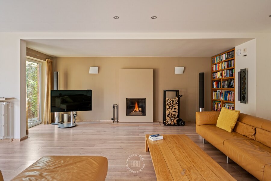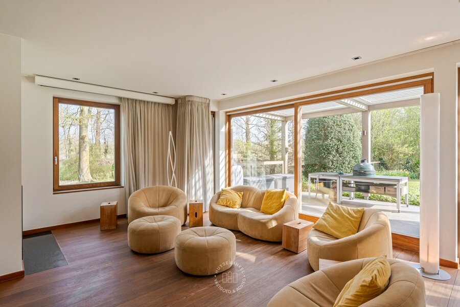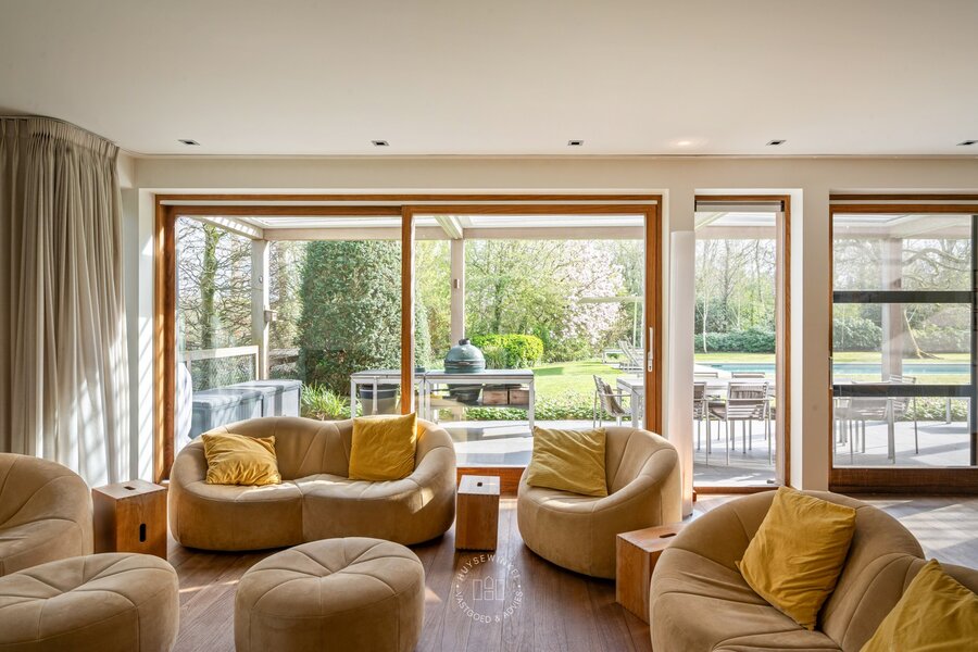 Op het gelijkvloers werd bijzonder veel aandacht besteed aan een warme en gezellige aankleding, met het gebruik van duurzame en kwalitatieve materialen. De leefruimtes genieten van een prachtig zicht op de Leie en de omliggende tuin. Een stijlvolle doorkijkhaard vormt een elegante verbinding tussen de leefruimte en de bureauruimte. Grote raampartijen zorgen voor een overvloed aan natuurlijk licht en creëren een mooie relatie met buiten. Vanuit elke ruimte ervaart men een rustgevend zicht op het groen. Daarbovenop beschikt de woning over een sauna, douche & kleedruimte met rechtstreekse doorgang naar het zwembad toe. Op de eerste verdieping bevinden er zich maar liefst 6 slaapkamers en 2 badkamers.