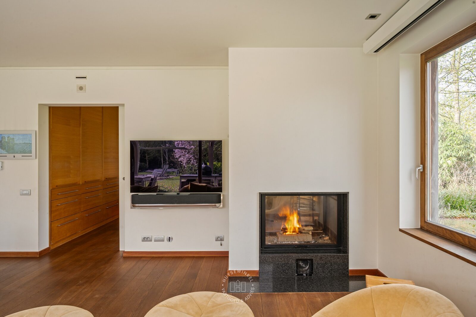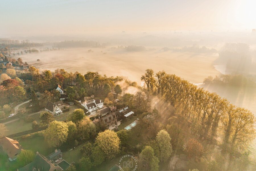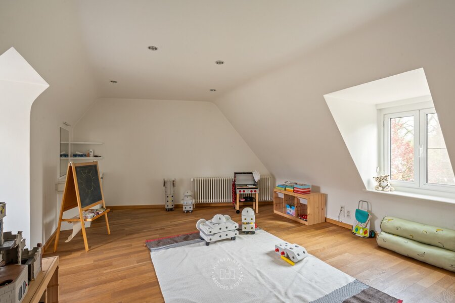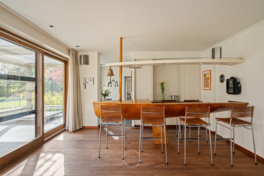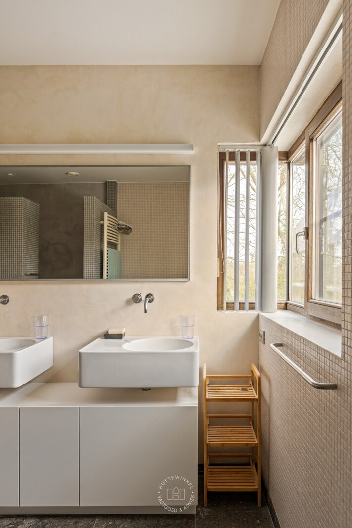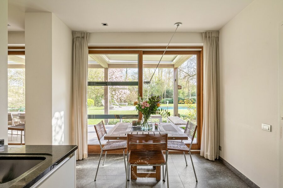 Op het gelijkvloers werd bijzonder veel aandacht besteed aan een warme en gezellige aankleding, met het gebruik van duurzame en kwalitatieve materialen. De leefruimtes genieten van een prachtig zicht op de Leie en de omliggende tuin. Een stijlvolle doorkijkhaard vormt een elegante verbinding tussen de leefruimte en de bureauruimte. Grote raampartijen zorgen voor een overvloed aan natuurlijk licht en creëren een mooie relatie met buiten. Vanuit elke ruimte ervaart men een rustgevend zicht op het groen. Daarbovenop beschikt de woning over een sauna, douche & kleedruimte met rechtstreekse doorgang naar het zwembad toe. Op de eerste verdieping bevinden er zich maar liefst 6 slaapkamers en 2 badkamers.