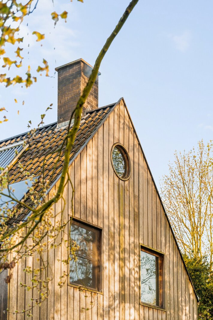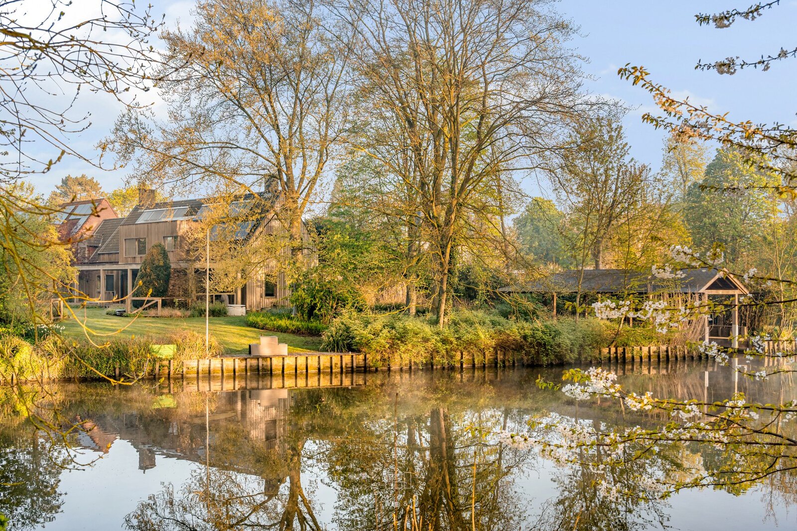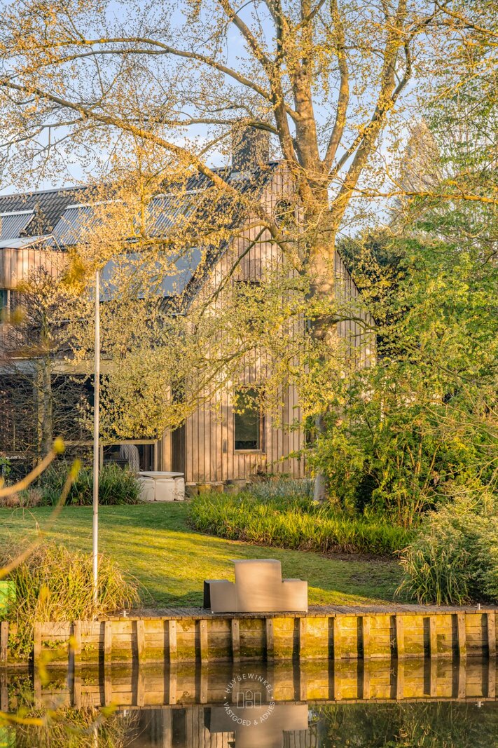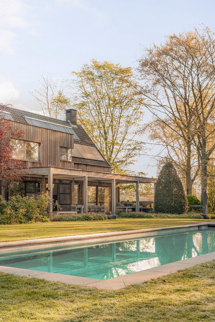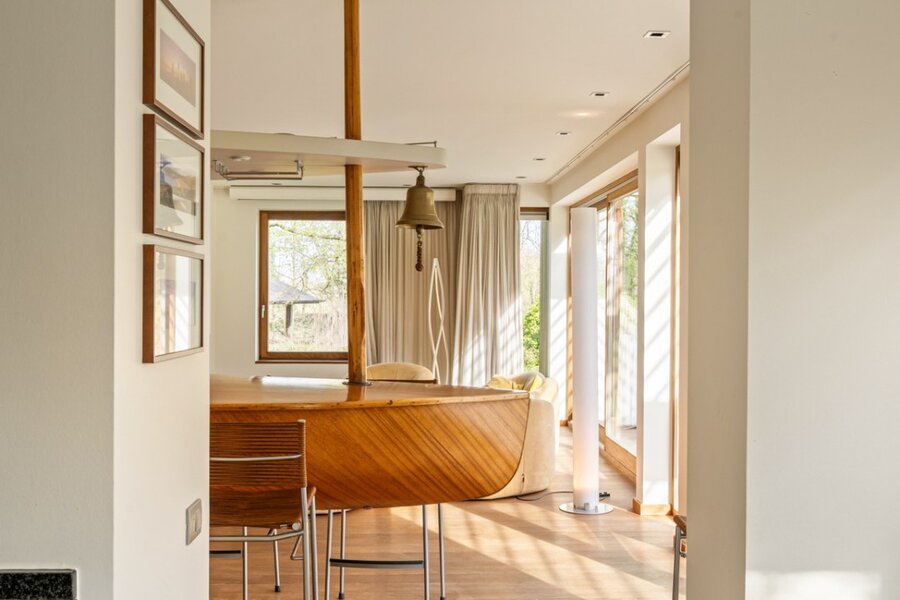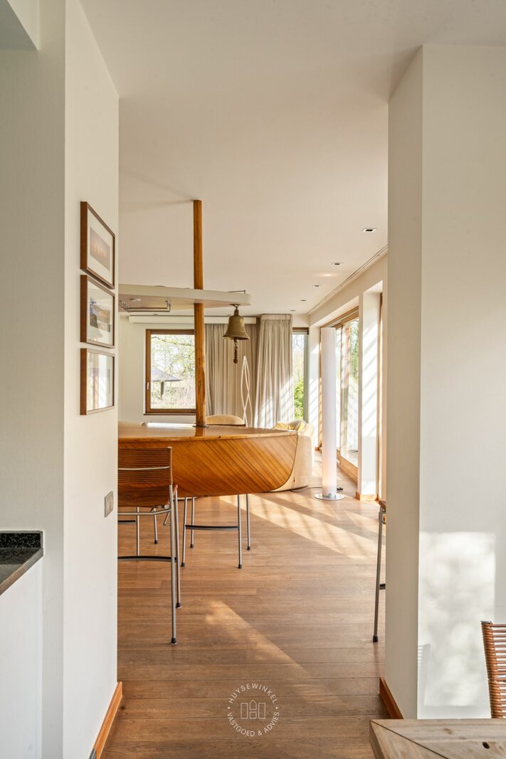 De oorspronkelijke woning, daterend uit de jaren ’70, werd in 2001 uitgebreid met een aanbouw in elegante Long Island-stijl, aangevuld met een ruim zwembad. Nadien werden nog een overdekt terras en een stijlvol boathouse aan de Leie gerealiseerd, waar een prachtige Hollandse sloep haar vaste ligplaats heeft.