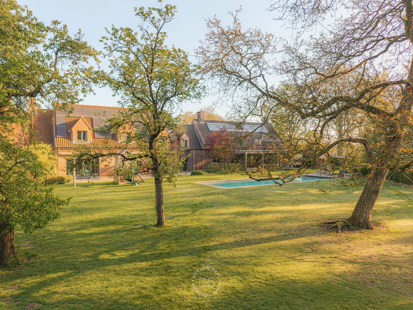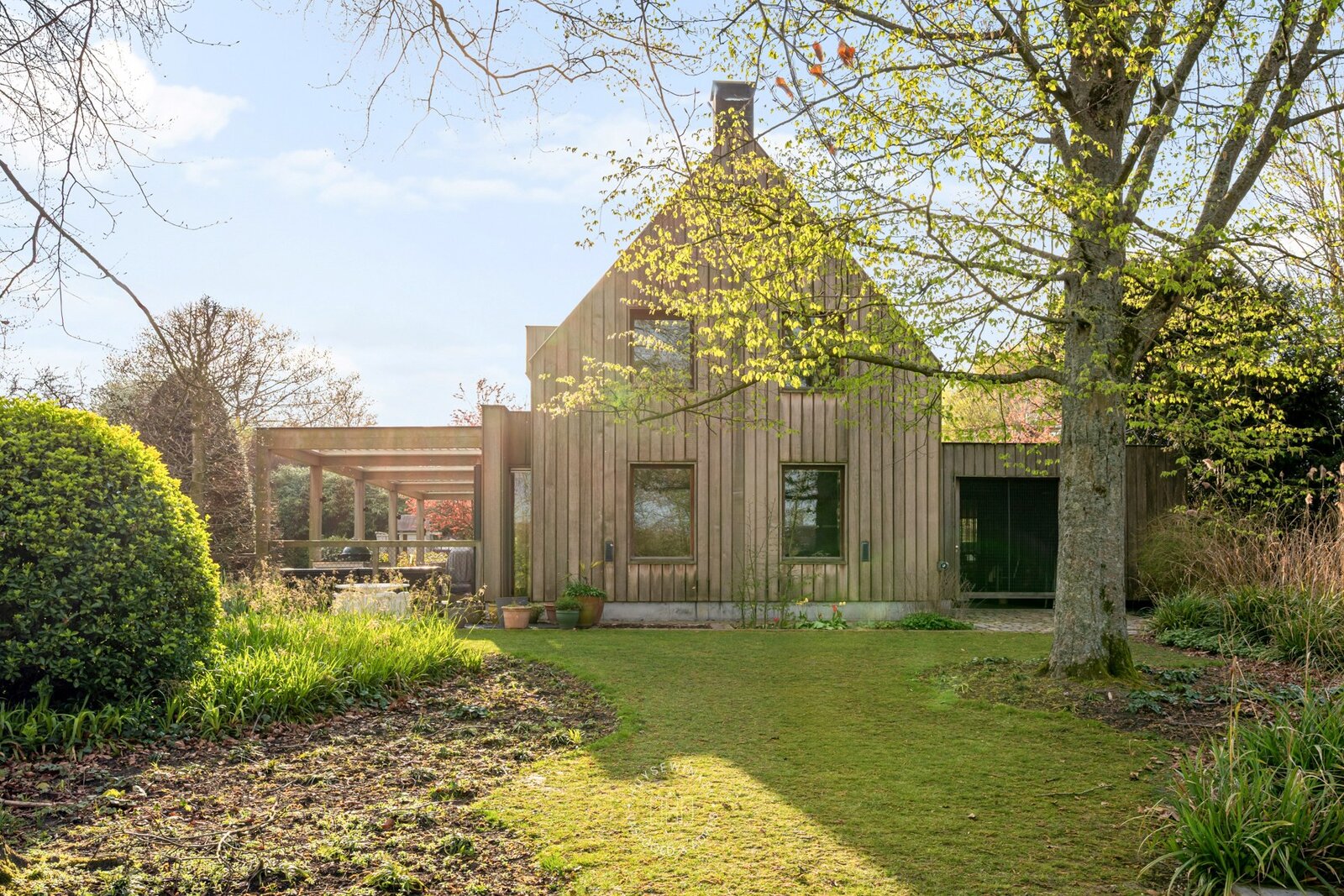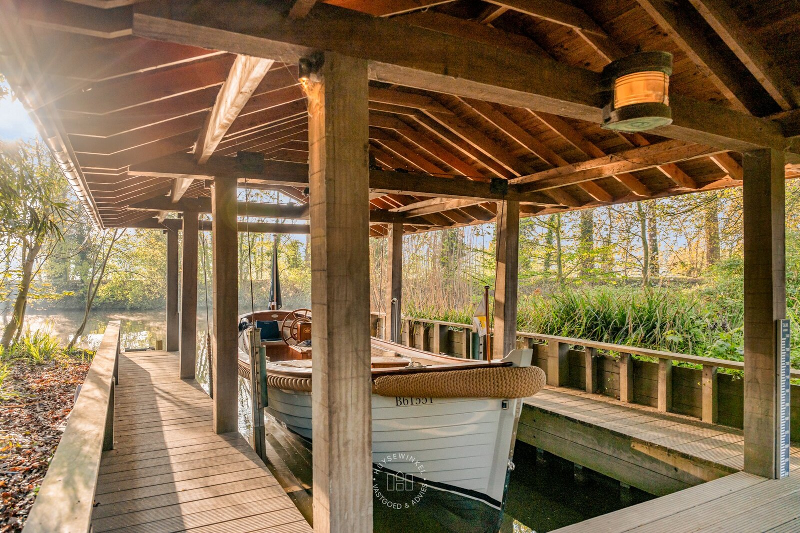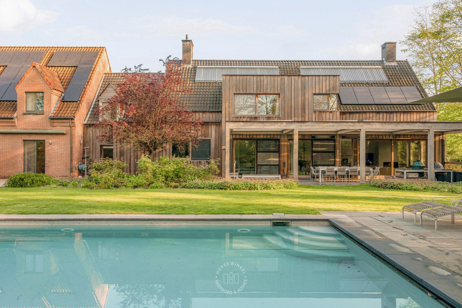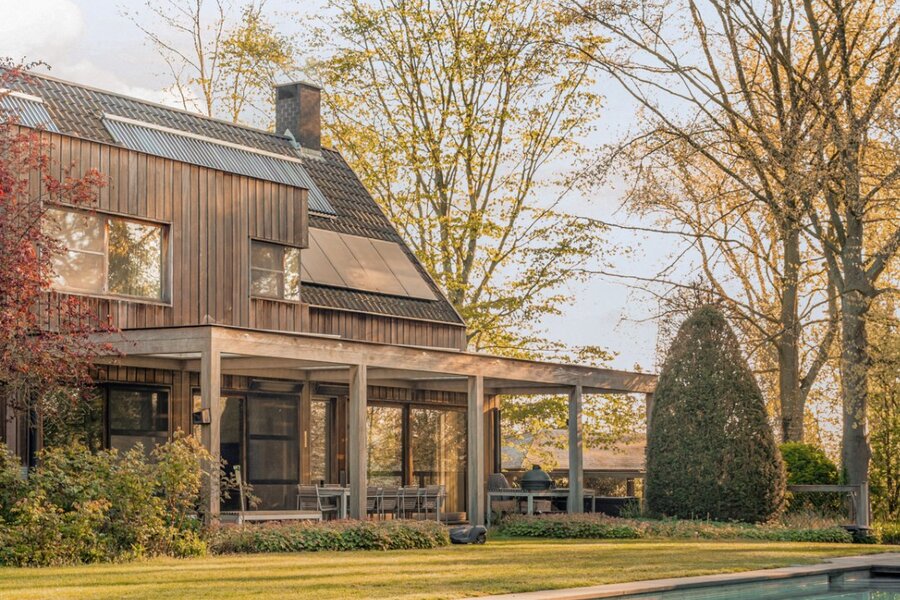 De oorspronkelijke woning, daterend uit de jaren ’70, werd in 2001 uitgebreid met een aanbouw in elegante Long Island-stijl, aangevuld met een ruim zwembad. Nadien werden nog een overdekt terras en een stijlvol boathouse aan de Leie gerealiseerd, waar een prachtige Hollandse sloep haar vaste ligplaats heeft.
