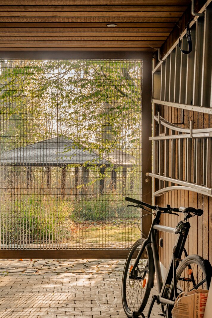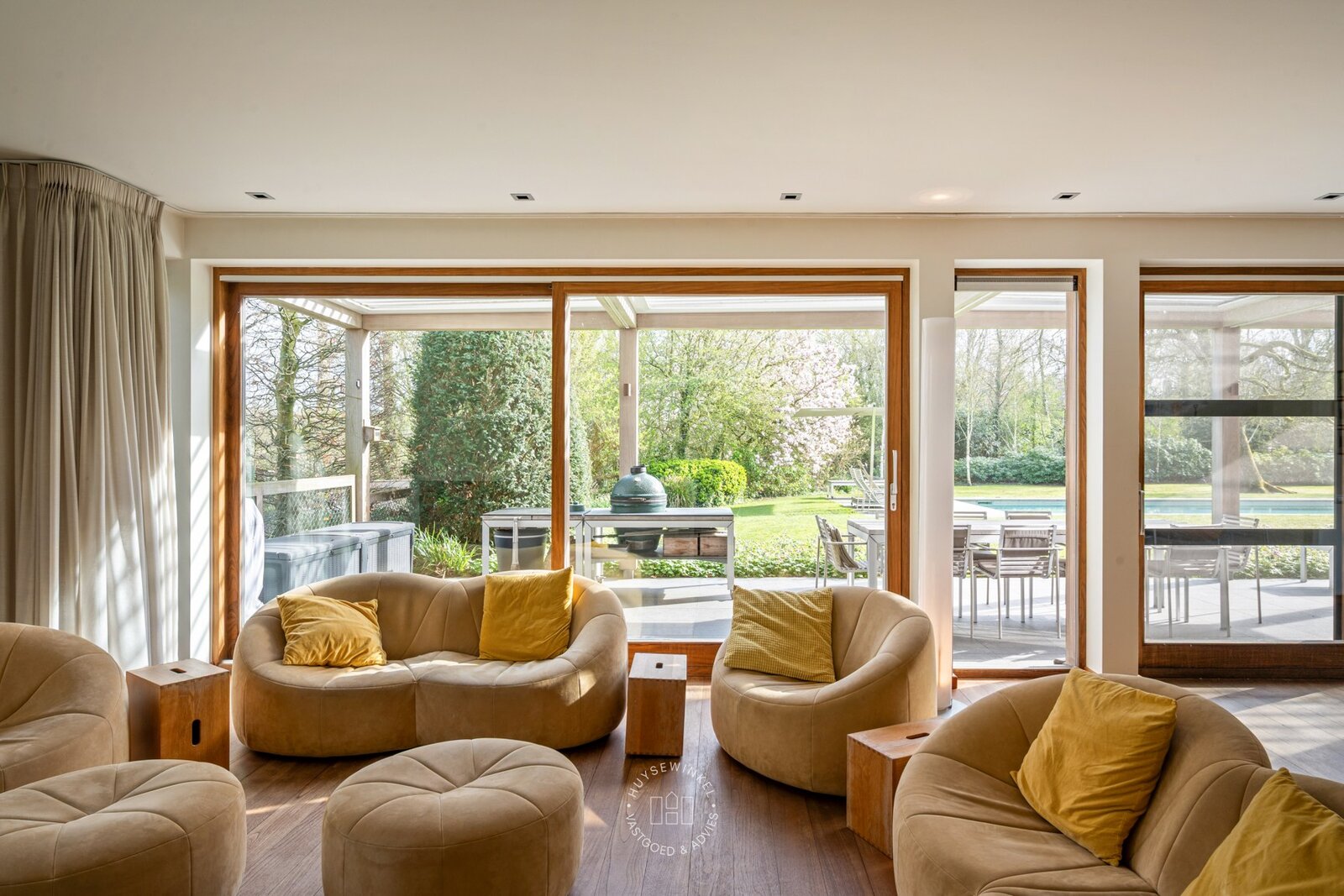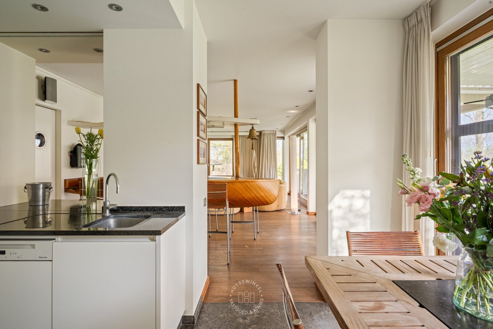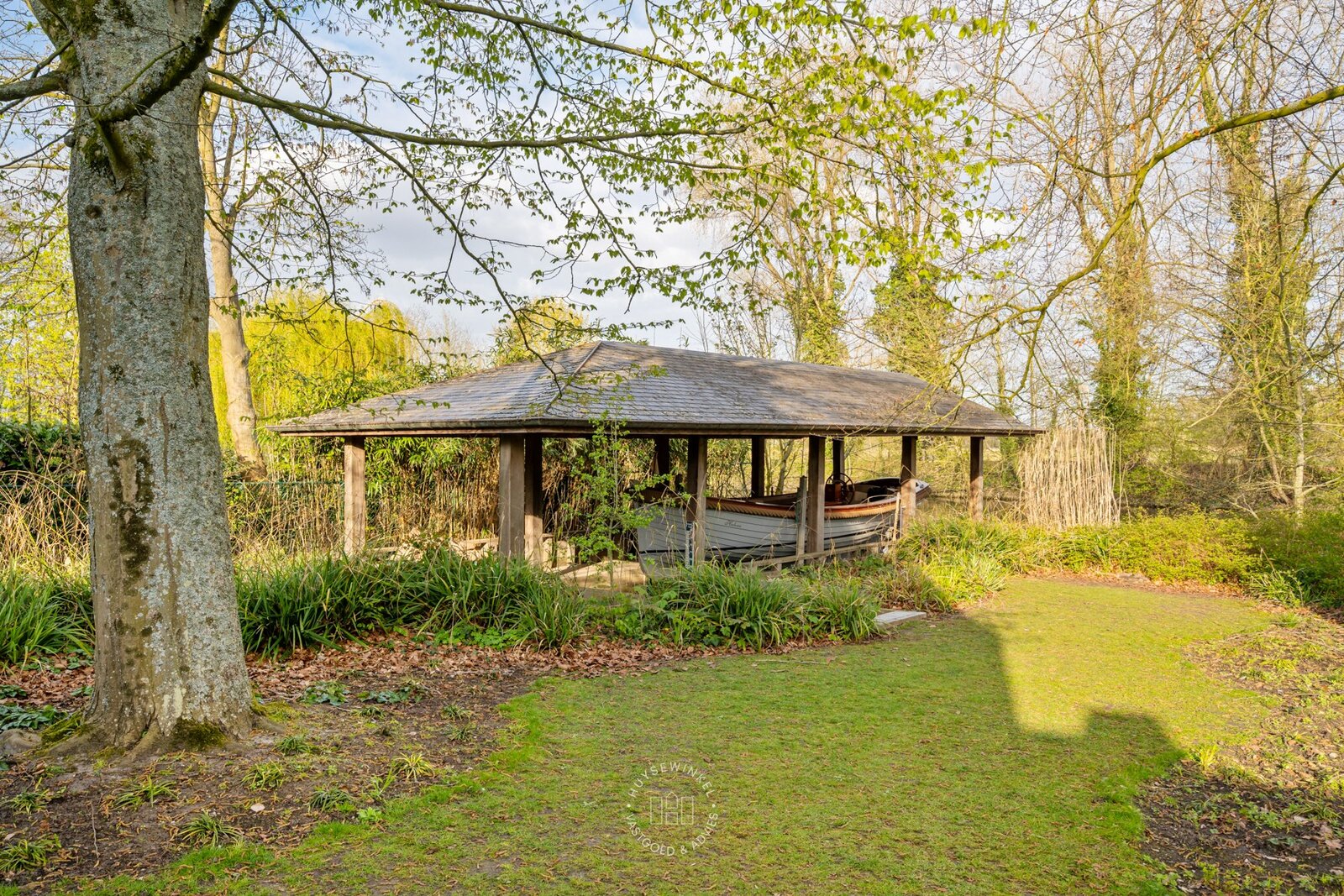 De oorspronkelijke woning, daterend uit de jaren ’70, werd in 2001 uitgebreid met een aanbouw in elegante Long Island-stijl, aangevuld met een ruim zwembad. Nadien werden nog een overdekt terras en een stijlvol boathouse aan de Leie gerealiseerd, waar een prachtige Hollandse sloep haar vaste ligplaats heeft.
