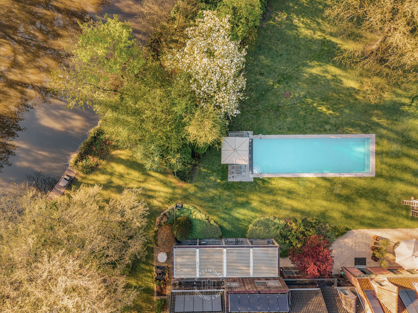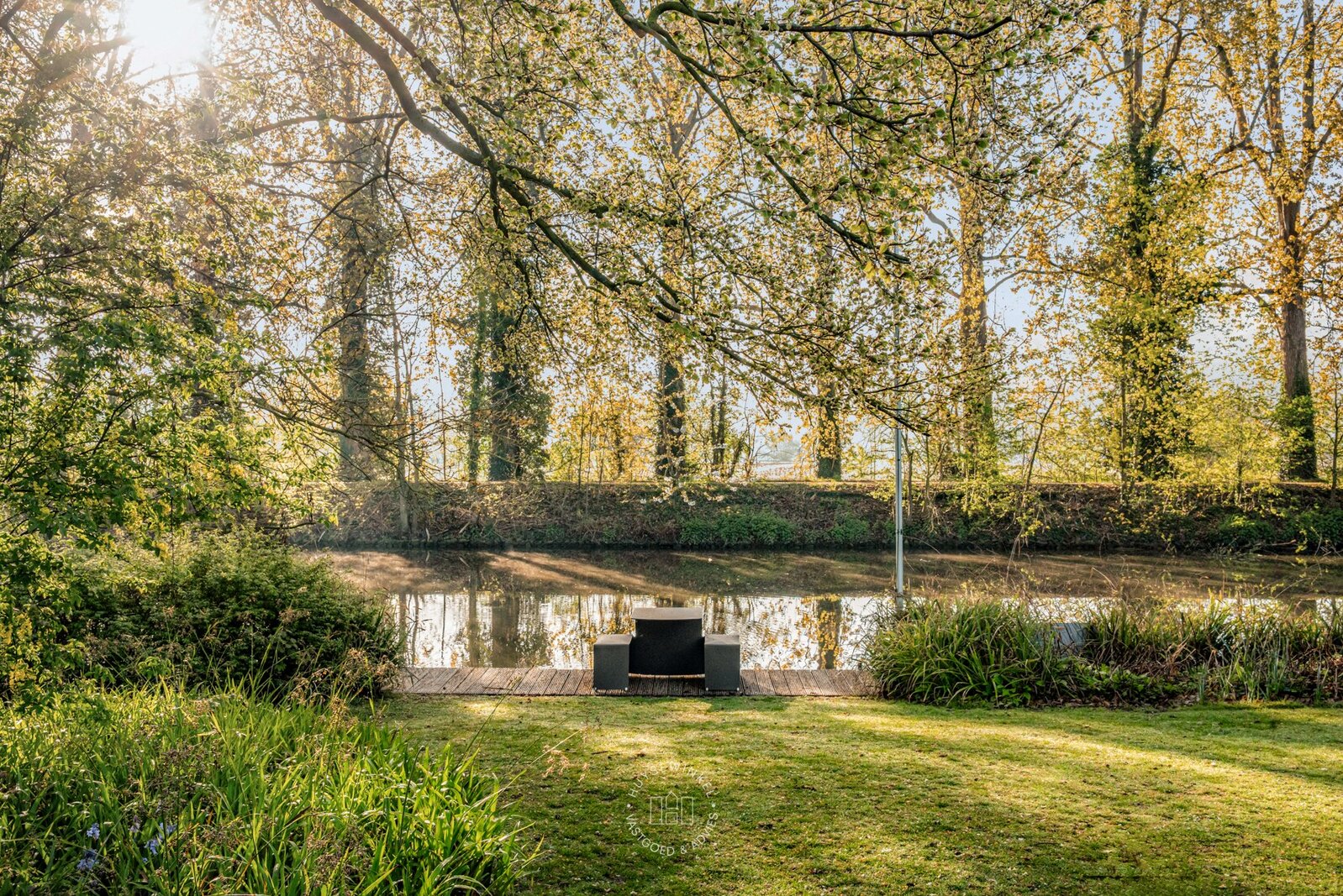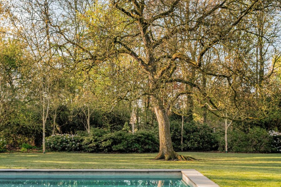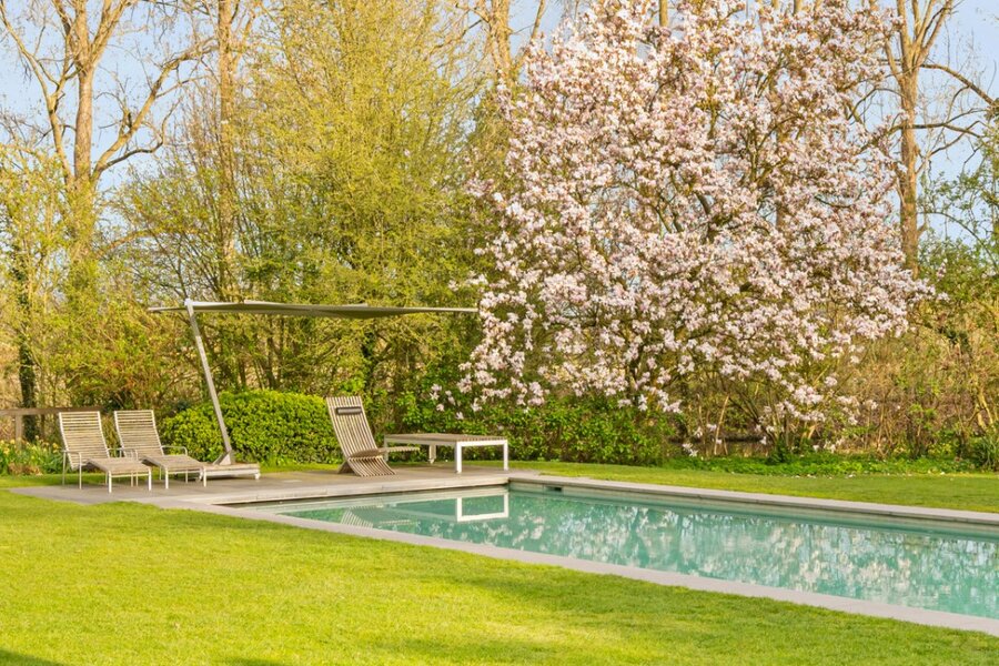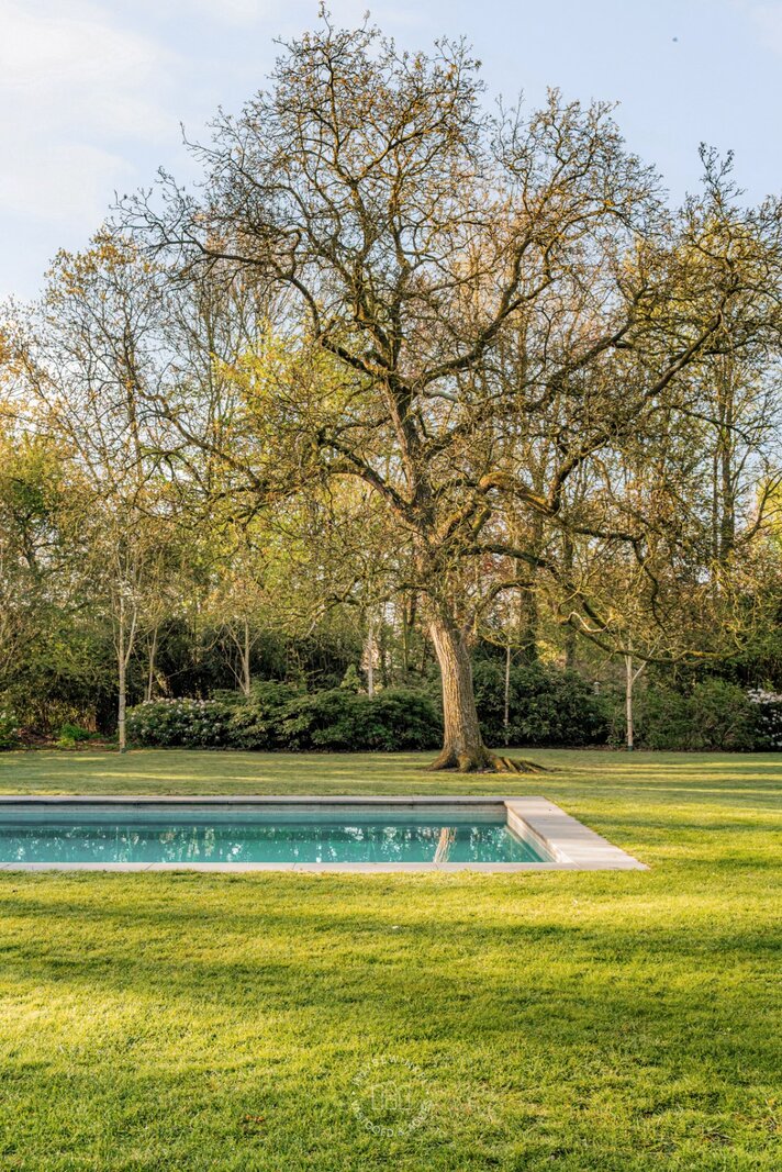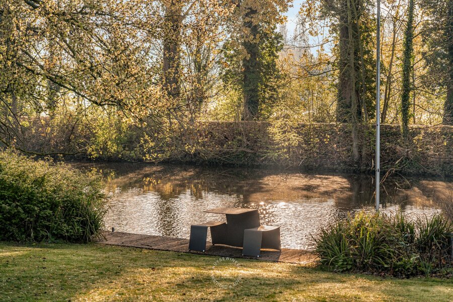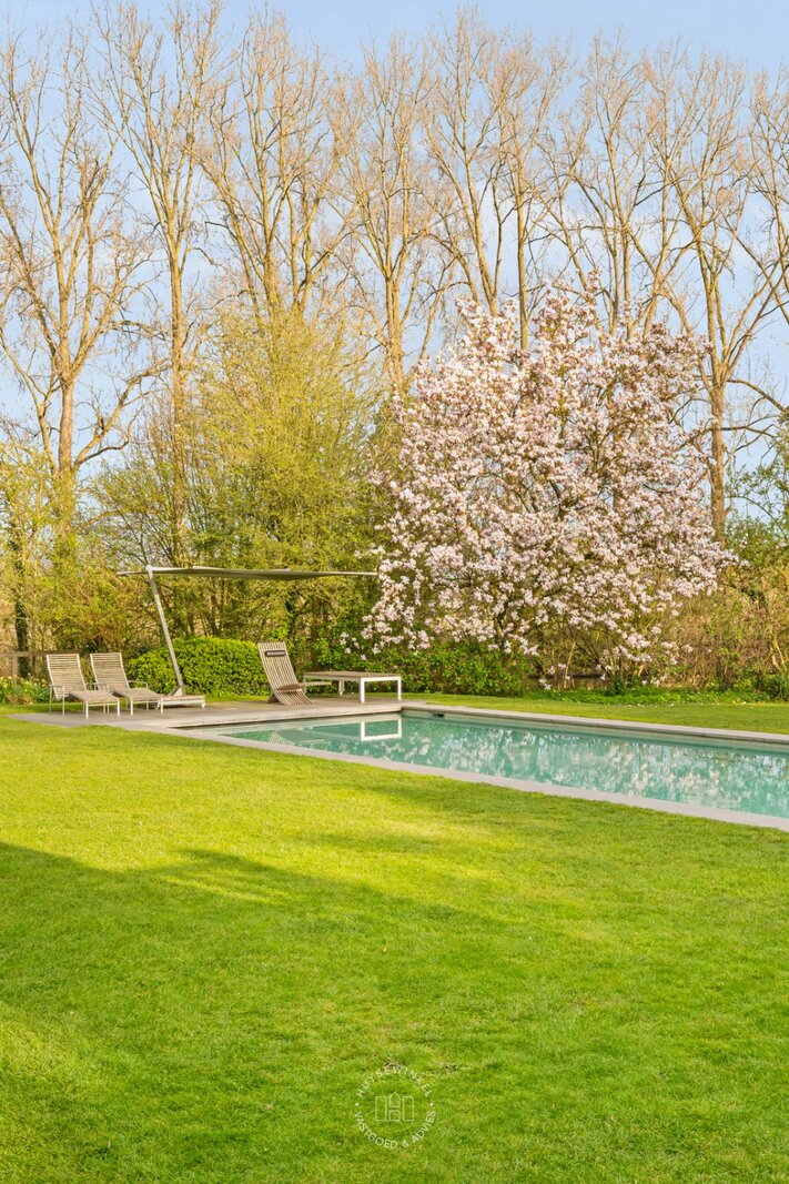 De schitterend aangelegde tuin van meer dan 3.500 m² vormt een uitzonderlijk groen decor dat naadloos overvloeit in de oevers van de Leie. Het centraal gelegen zwembad wordt omringd door statige, volgroeide bomen en creëert een uniek gevoel van rust, privacy en verfijning. De directe waterligging versterkt het karakter van deze eigendom en zorgt voor een permanent vakantiegevoel, met adembenemende zichten op het omliggende landschap.