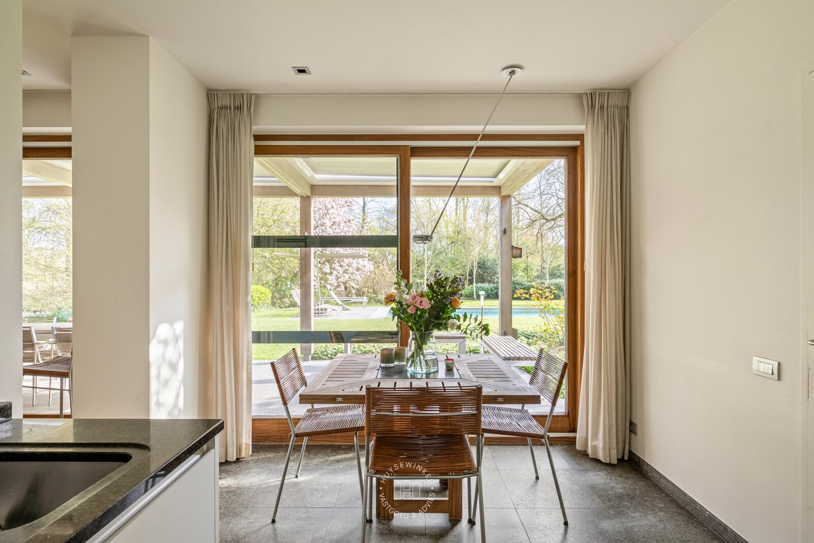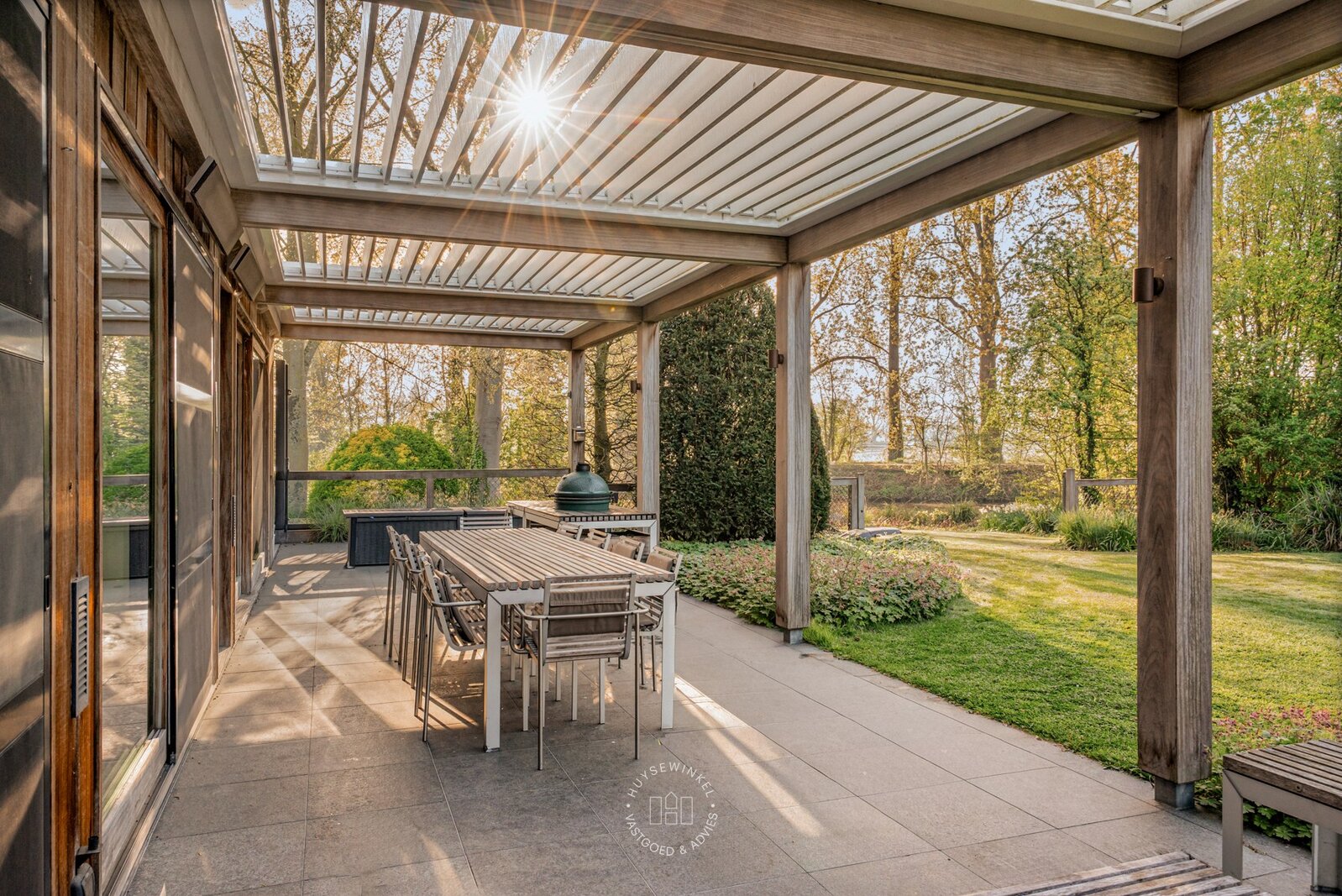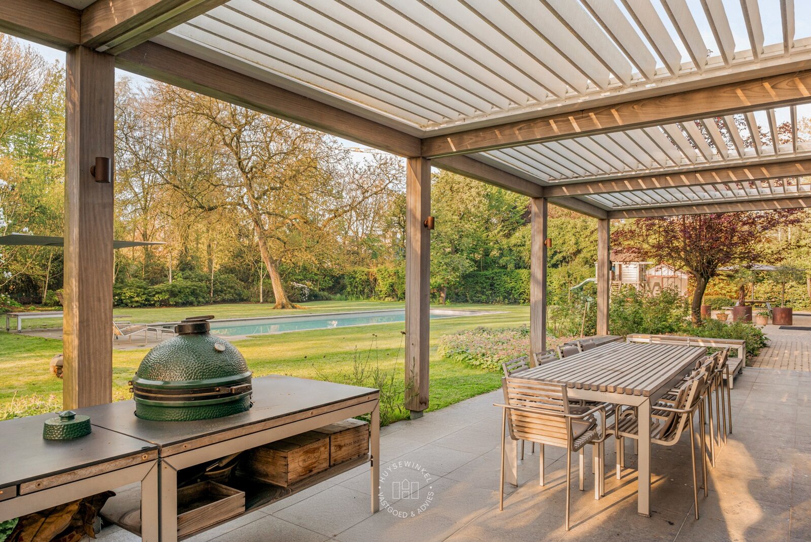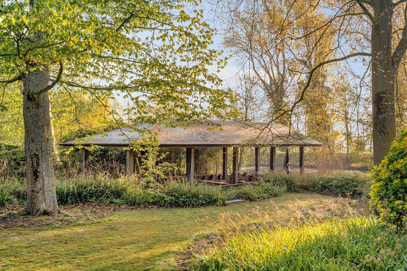 De schitterend aangelegde tuin van meer dan 3.500 m² vormt een uitzonderlijk groen decor dat naadloos overvloeit in de oevers van de Leie. Het centraal gelegen zwembad wordt omringd door statige, volgroeide bomen en creëert een uniek gevoel van rust, privacy en verfijning. De directe waterligging versterkt het karakter van deze eigendom en zorgt voor een permanent vakantiegevoel, met adembenemende zichten op het omliggende landschap.
