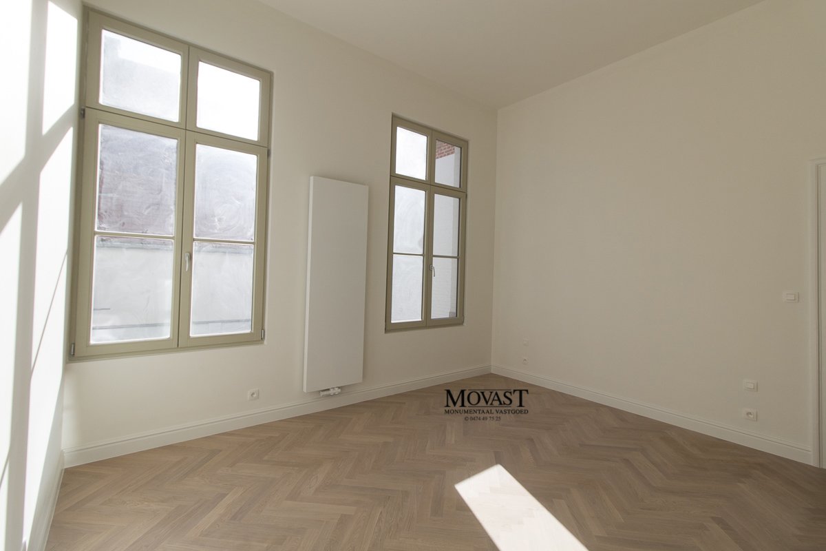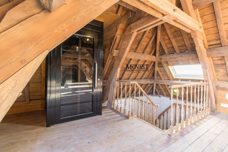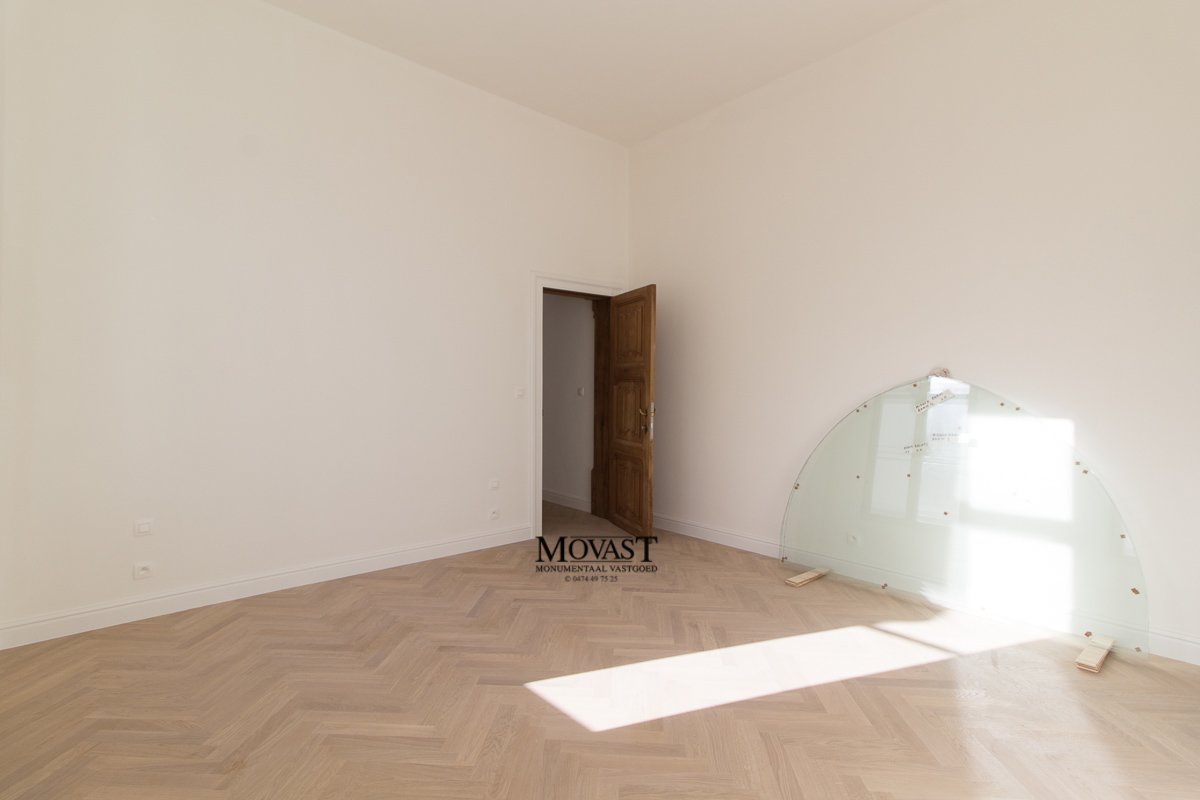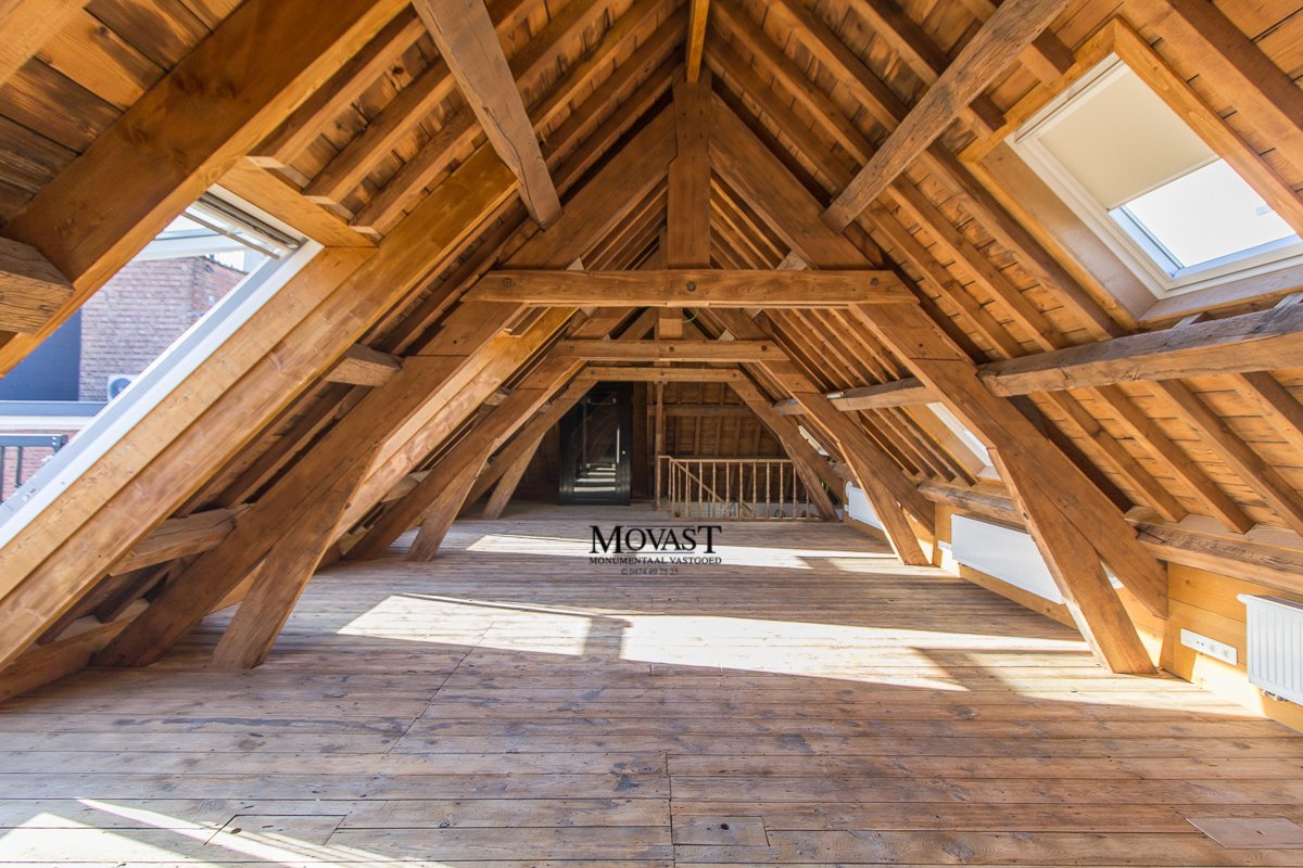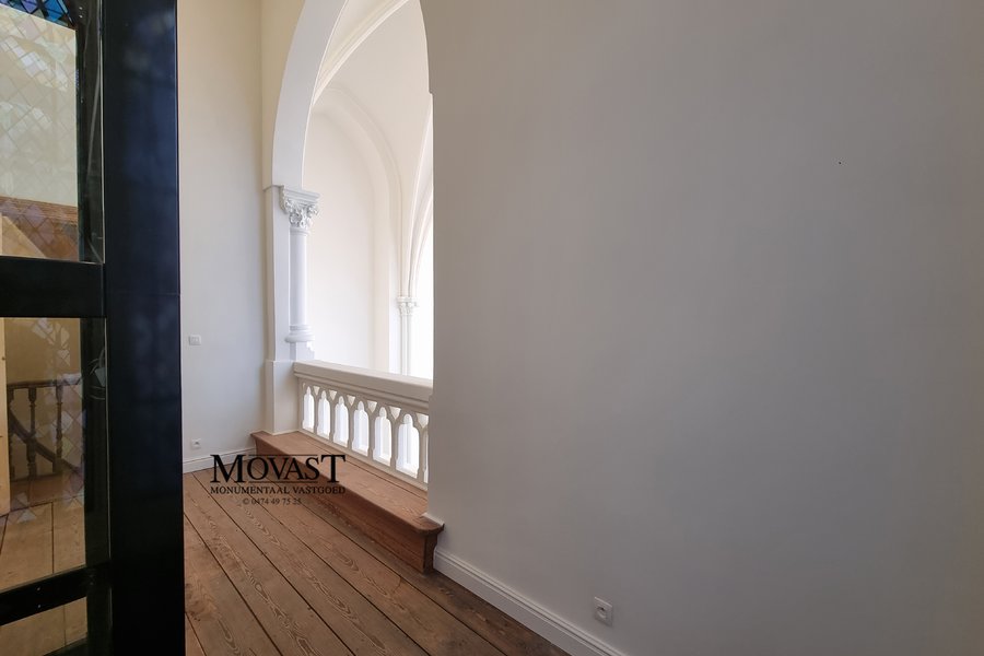 We komen binnen in de ruime inkomhal met vestiaire, we nemen de lift of de mooi gerestaureerde trap naar de eerste verdieping, hier is een apart gastentoilet, via de dubbele deuren betreden we de imposante (leef)ruimte met een prachtige natuurlijke lichtinval. Op dit verdiep is er nog een slaapkamer met en suite een badkamer met ligbad, inloopdouche, meubel met dubbele lavabo en een toilet. We nemen de lift een verdiep hoger, hier komen we in een open ruimte waar u een prachtig uitzicht op de (leef)ruimte. Nog een verdiep hoger komen we in de bovenste verdieping van dit prachtige object: een multifunctionele ruimte met een warme look dankzij de prachtige gerestaureerde houtconstructie.
