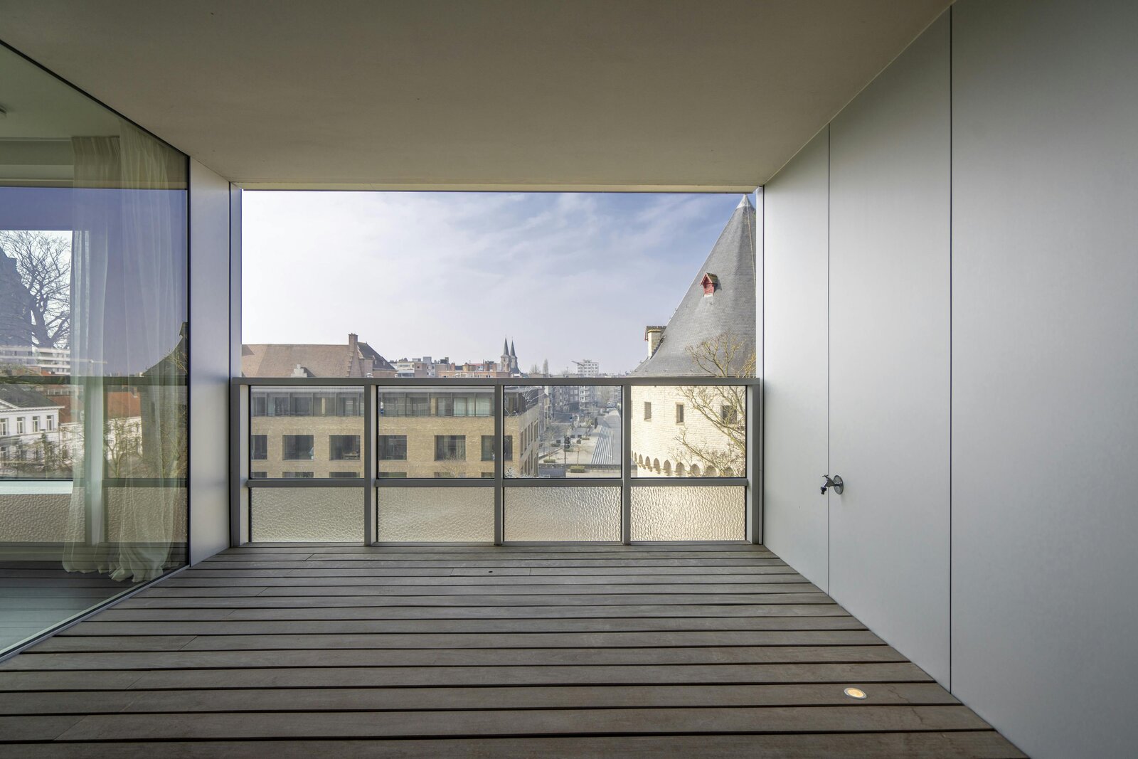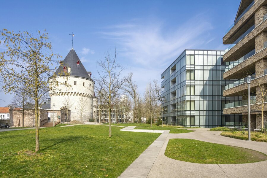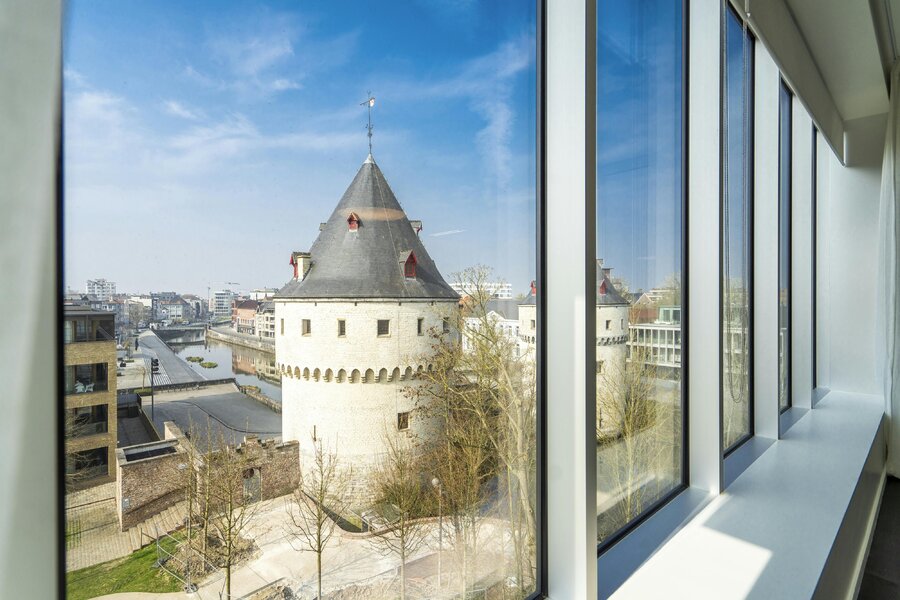 In addition, there is a covered terrace with a view of the Leie and an underground car park.