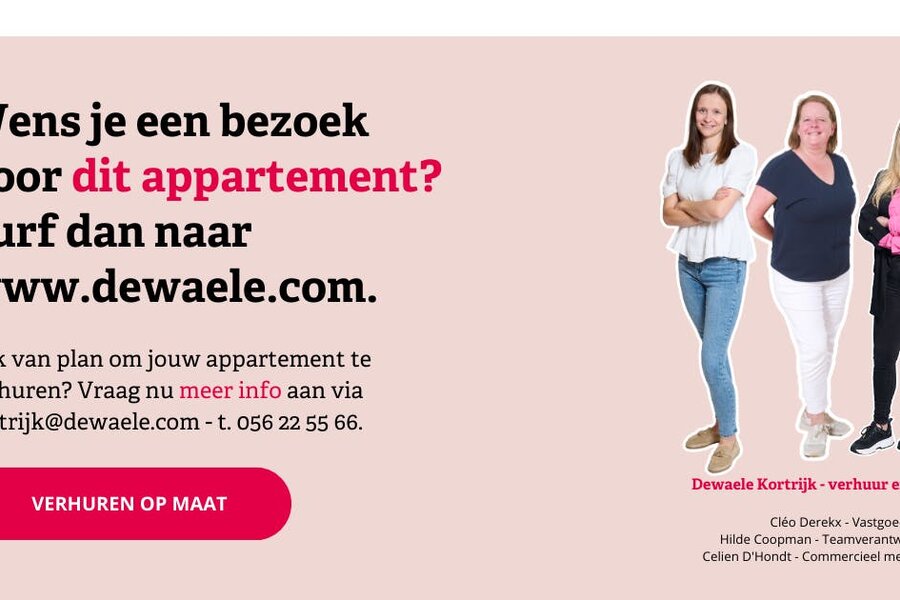 This apartment offers you a unique opportunity to stay luxuriously on the Leie. So request a quick visit at www.dewaele.com or call 056 26 56 33!