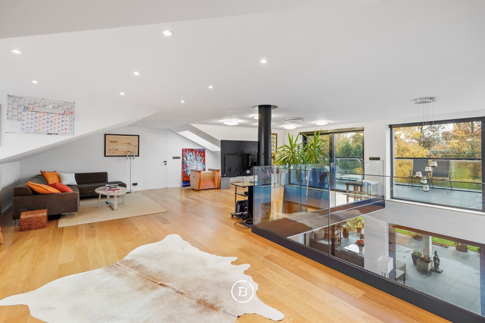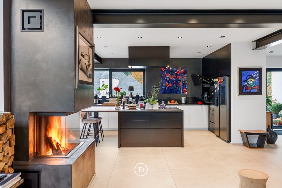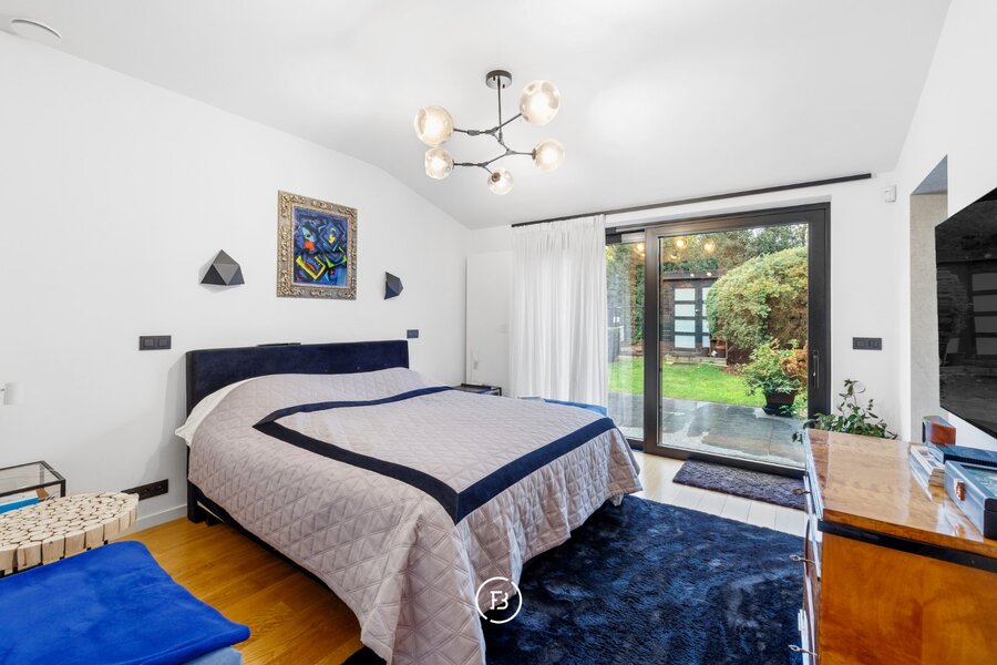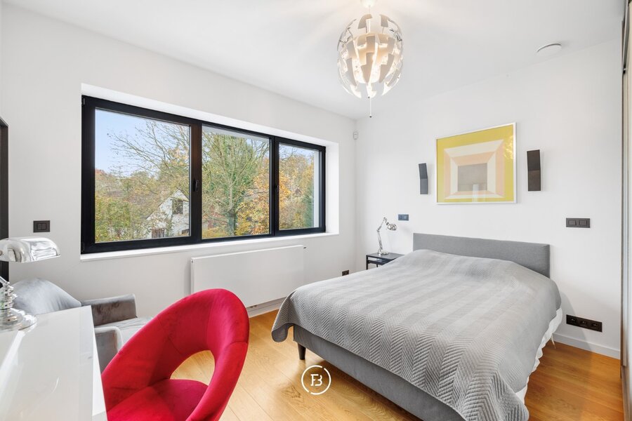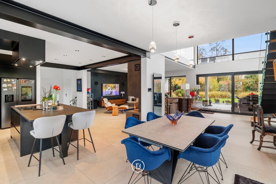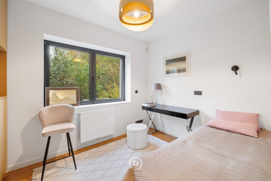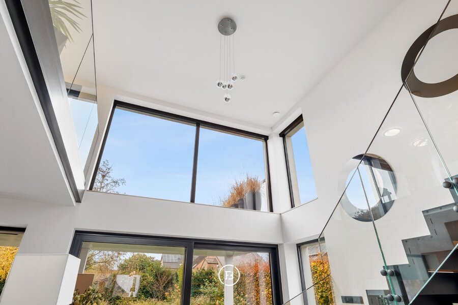 0: Inkomhal met gastentoilet, ruime woon- en eetkamer voorzien van open haard en onmiddellijke toegang tot het overdekte terras, volledig uitgeruste open keuken. Drie slaapkamers (16, 9 en 9 m²) met badkamer voorzien van wastafel, toilet en douche, en een mastersuite (18 m²) voorzien van dressing en badkamer met dubbele wastafel, douche en ligbad.