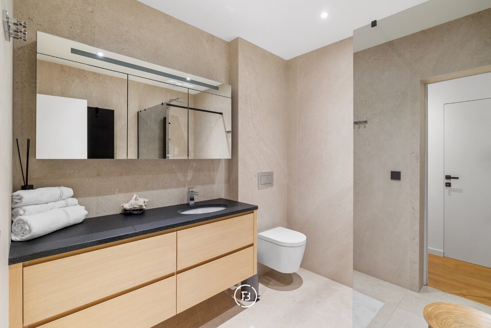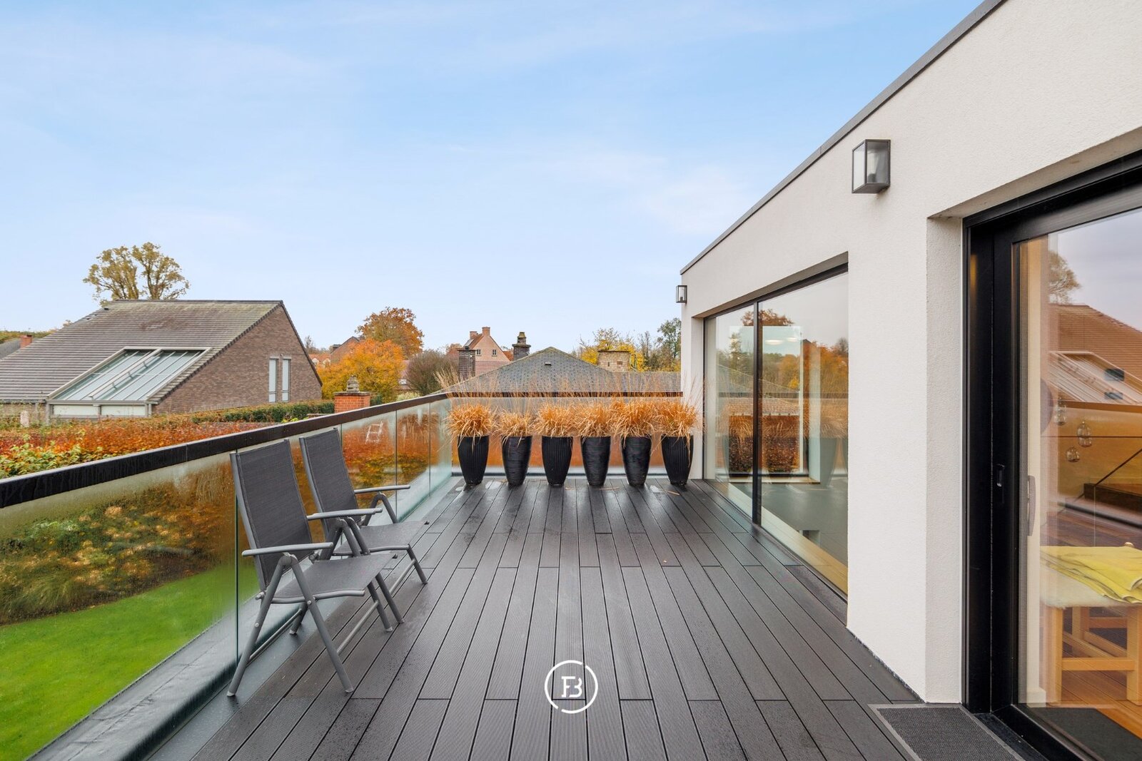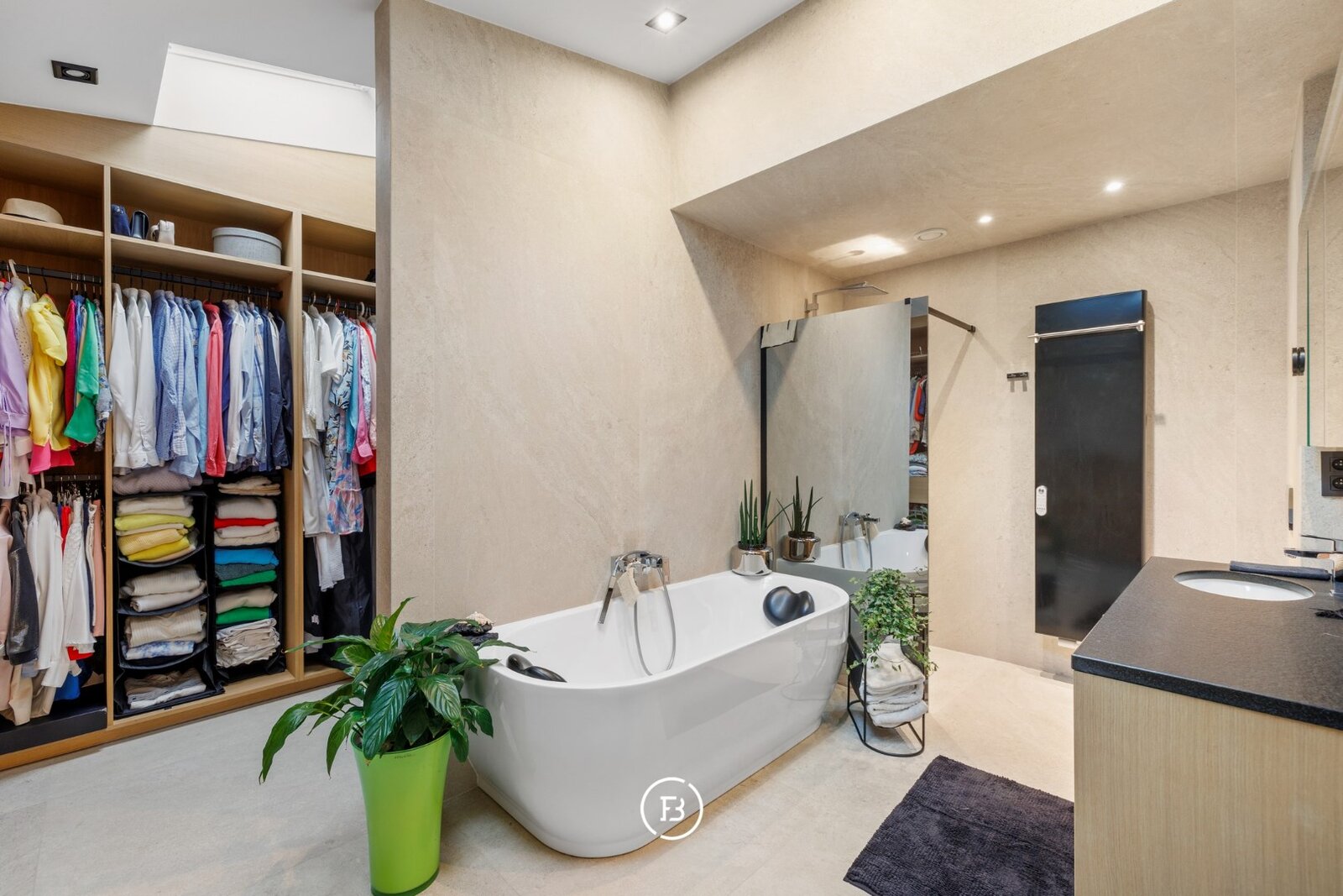 0: Inkomhal met gastentoilet, ruime woon- en eetkamer voorzien van open haard en onmiddellijke toegang tot het overdekte terras, volledig uitgeruste open keuken. Drie slaapkamers (16, 9 en 9 m²) met badkamer voorzien van wastafel, toilet en douche, en een mastersuite (18 m²) voorzien van dressing en badkamer met dubbele wastafel, douche en ligbad.