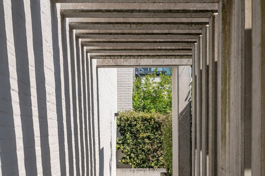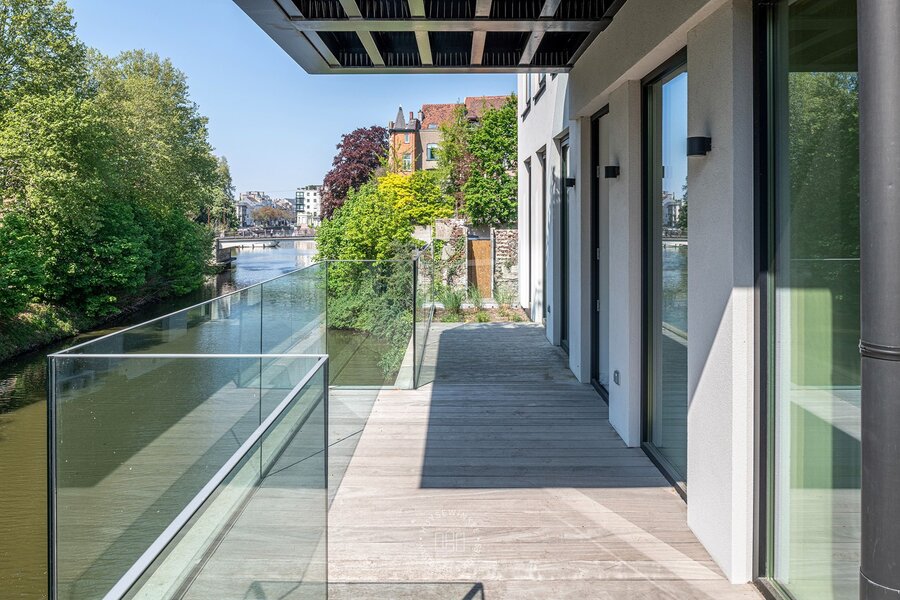 Kenmerkend voor alle ruimtes zijn de diverse grote raampartijen die allen uitgeven op een terras langs de Leie van maar liefst 21 m². Dit terras loopt over de volledige breedte van het appartement.