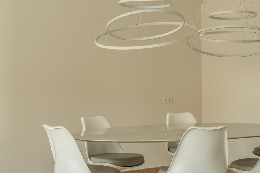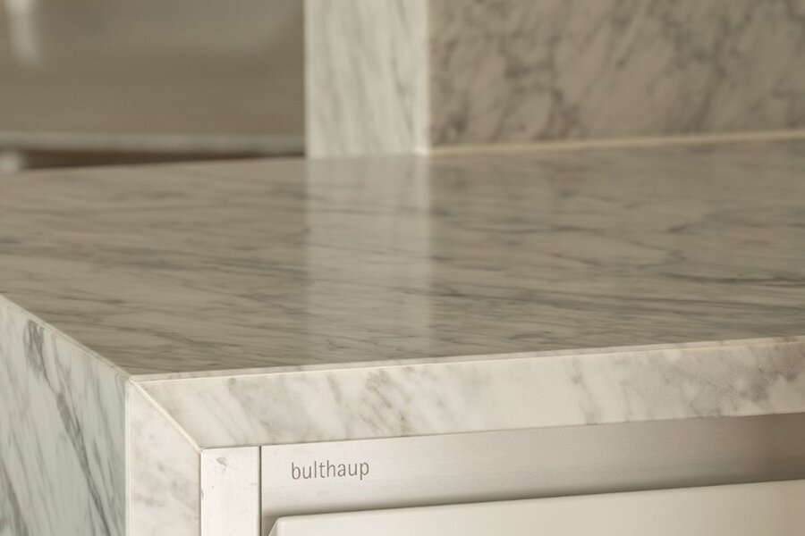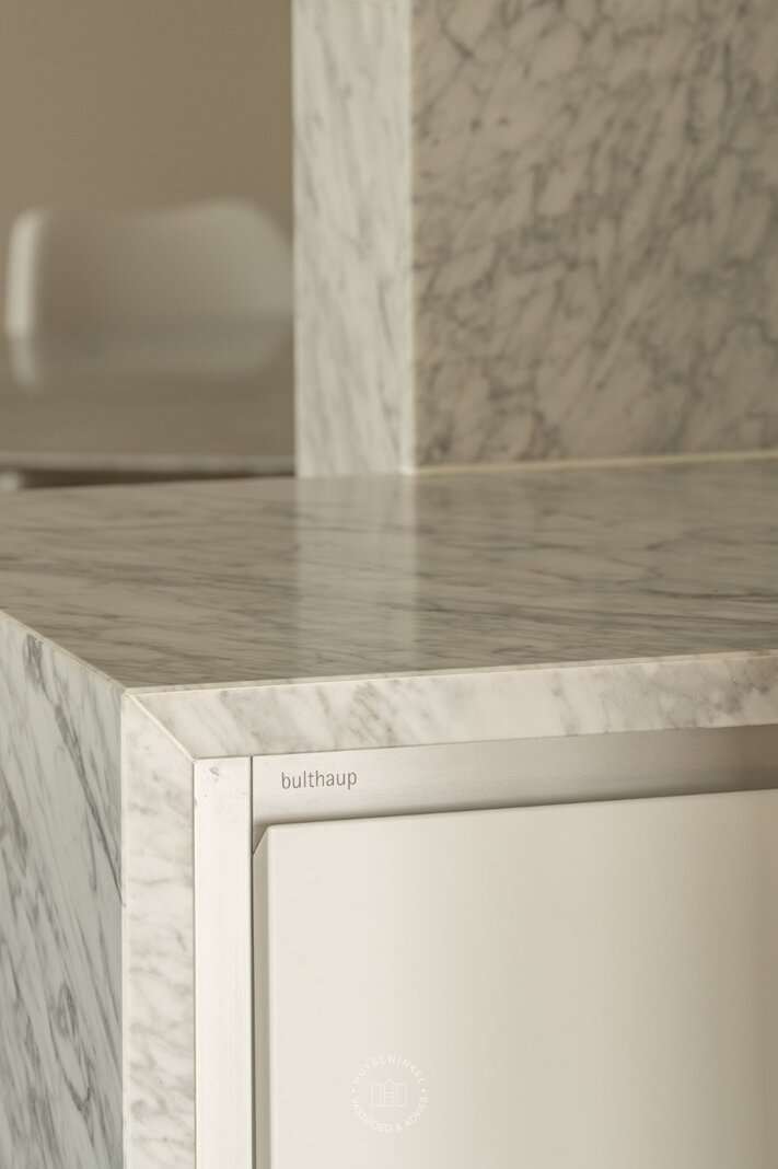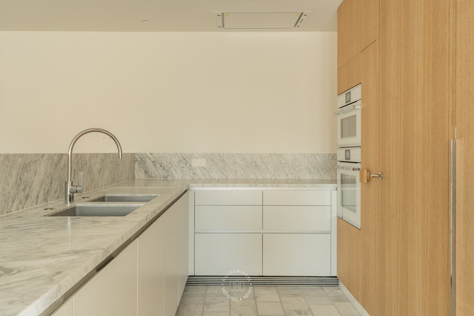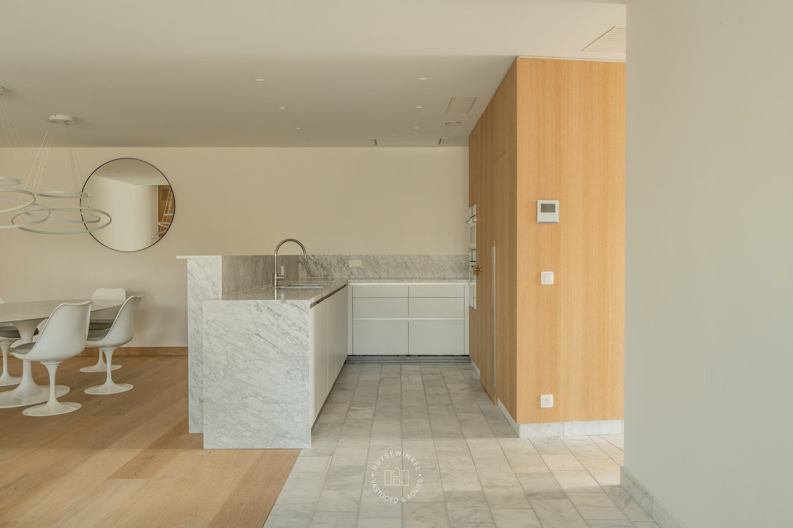 Bij het binnenkomen van het appartement springt de royale videruimte direct in het oog. Dit is het hart van deze woonst waarrond de verschillende woonfuncties ook samenkomen. Zo treft u als eerste de bureauruimte met ingemaakte bibliotheekkast. De marmeren bevloering leidt u verder tot in de leefkeuken. Deze is voorzien van een luxueus afgewerkte Bulthaup keuken met marmeren werkblad alsook praktische berging. Deze sluit direct aan op de gezellige eetplaats alsook eerste zithoek met gashaard.