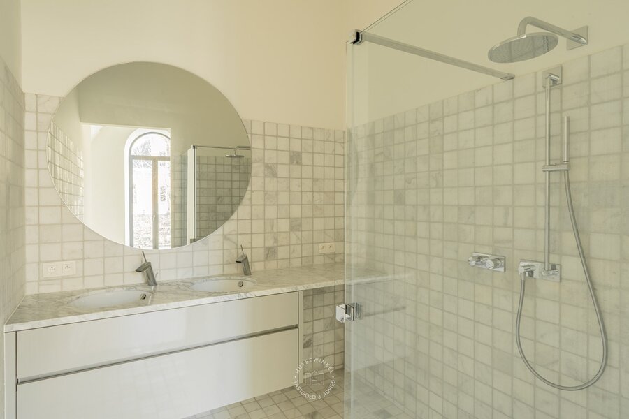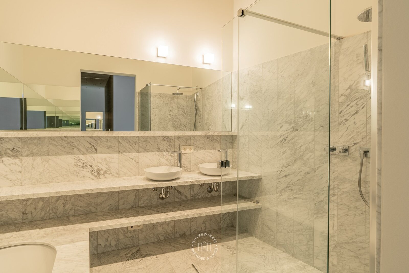 Beide slaapkamers zijn voorzien van een ensuite badkamer waar de marmeren afwerking smaakvol terugkomt. En als surplus heeft de masterbedroom een eigen dressing met ingemaakte kasten.