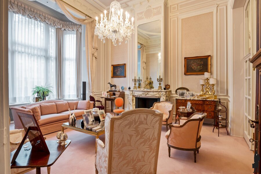 De volledige gelijkvloerse verdieping is voorzien van hoge plafonds en ingedeeld als volgt: een eerste living voorzien van prachtige moulures en sierschouw, tweede leefruimte op sierparket welke dienst doet als eetkamer en achteraan de woning een extra woonkamer met eethoek en de gesloten keuken met uitgang naar het terras en de tuin; een luxueus gastentoilet.