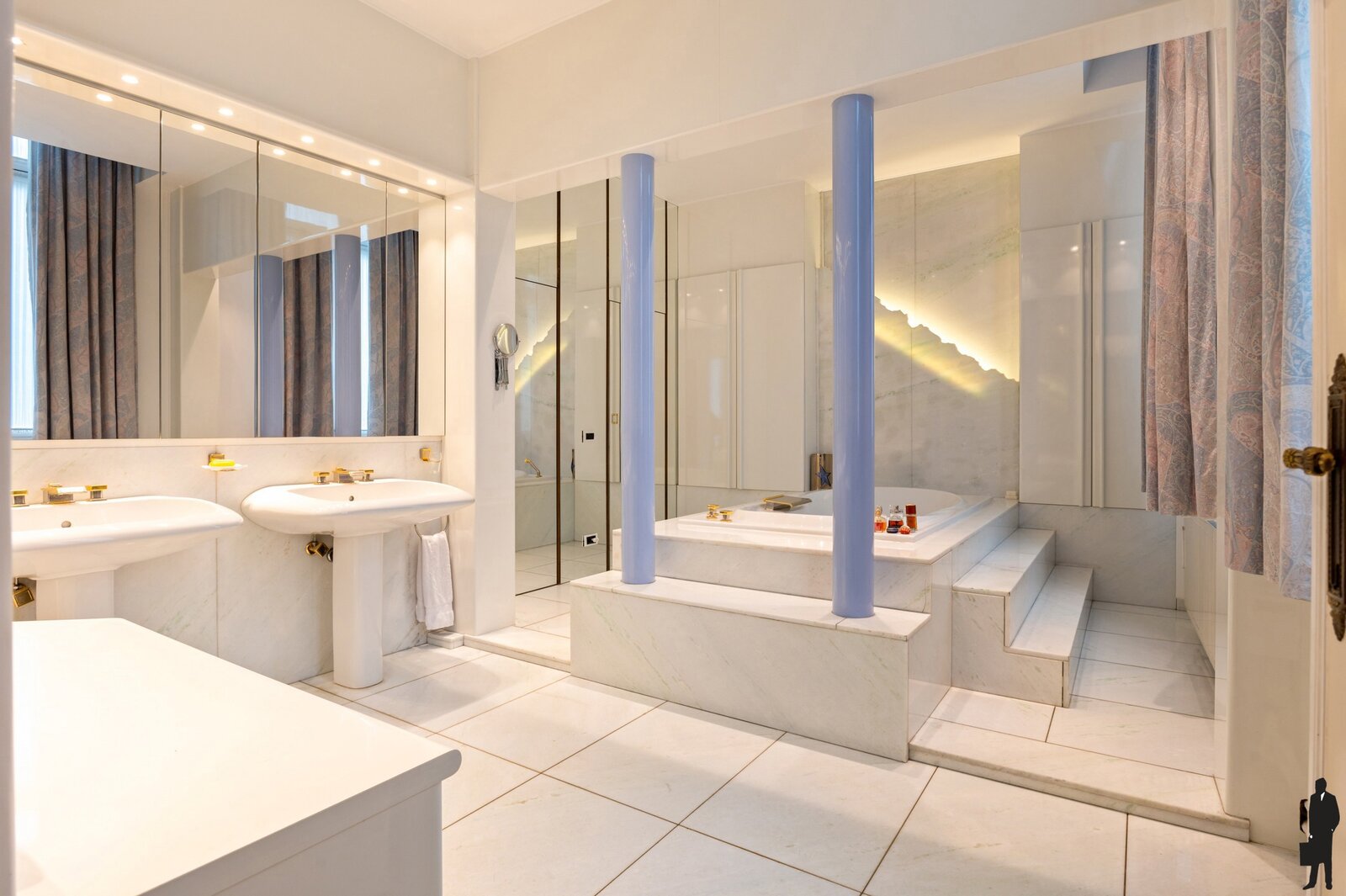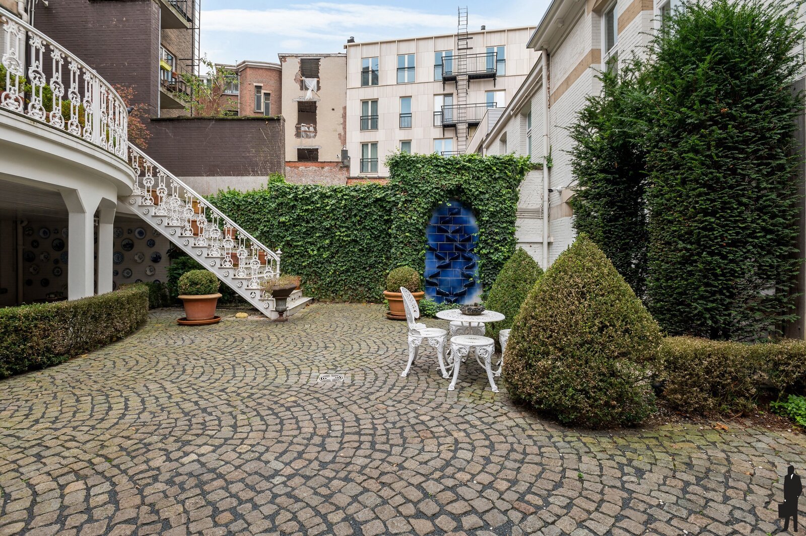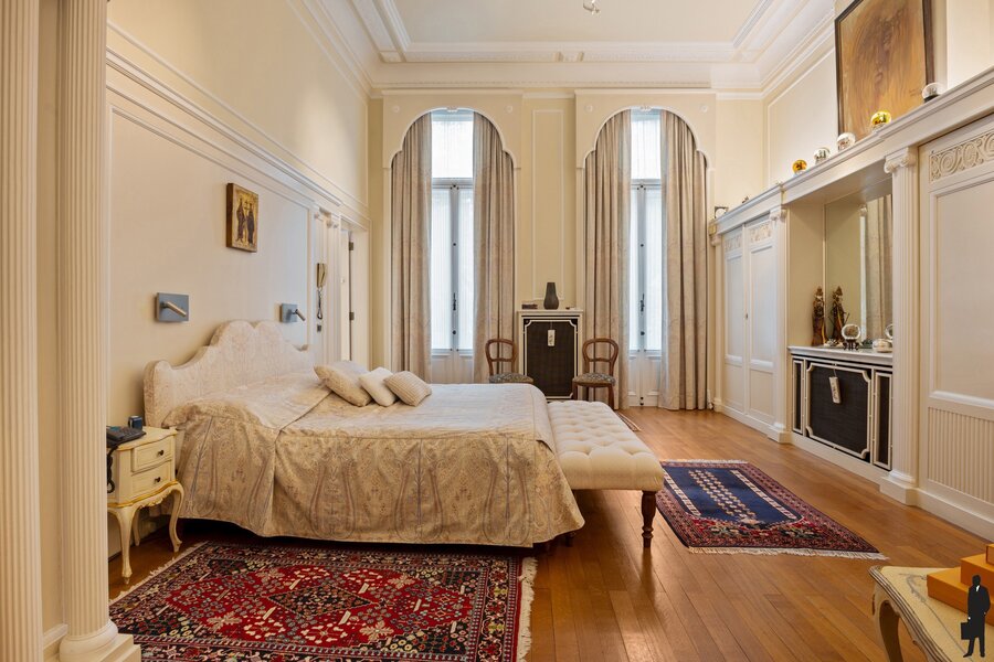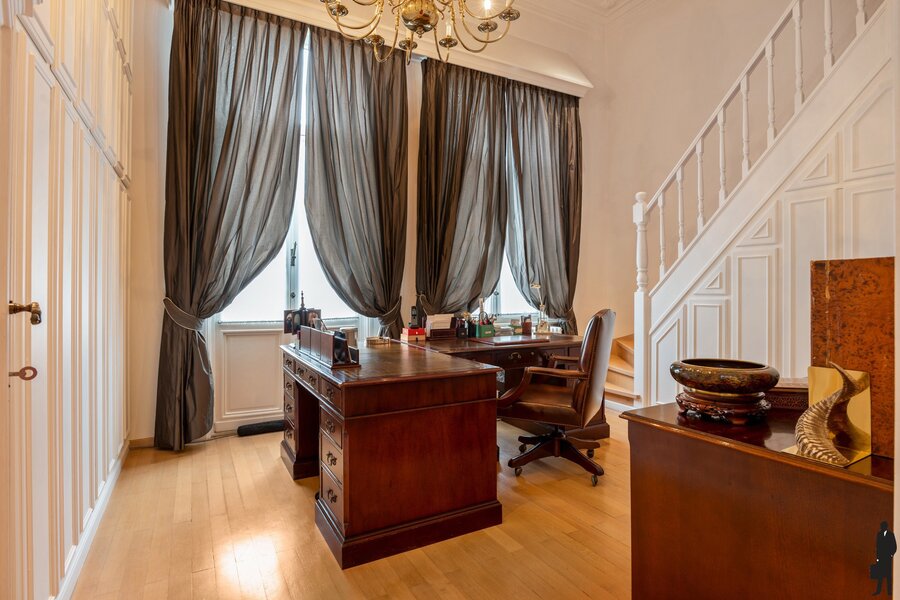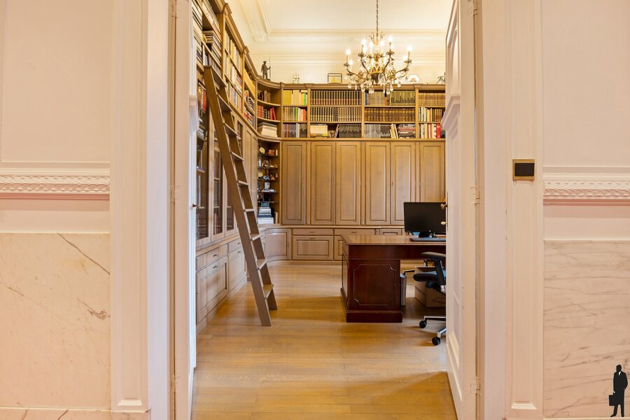 1e verdieping: een zeer ruime overloop met zicht op de prachtige vide, een eerste buereauruimte op parket met parket met authentieke maatkasten, een schitterende werkkamer/bibliotheek met ingebouwde boekenkasten. Aan de voorzijde van dit verdiep bevindt zich de royale masterbedroom met eigen dressing en ensuite luxebadkamer met twee wastafels, erg groot bad, douche, toilet, etc..