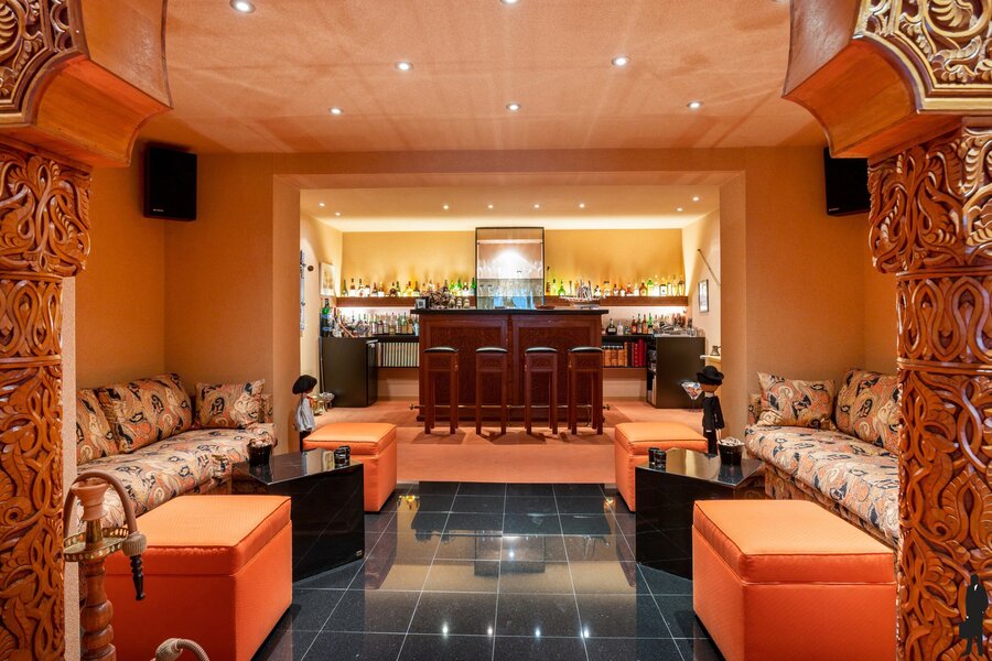 Souterrain: via een aparte trap of via de lift te bereiken verdieping ingedeeld in verschillende grote ruimtes (ingerichte bar in Marokkaanse stijl met poolkamer, fitnessruimte, waskamer, wijnkelder en technische ruimte waar zich de high-end CV-installatie bevindt.