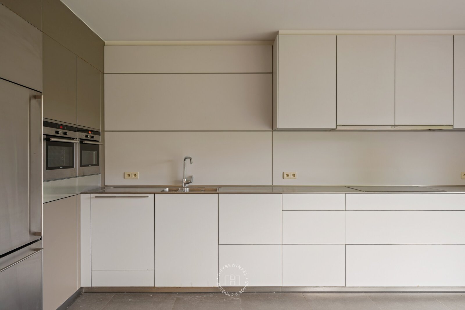 Bij binnenkomst treft u een ruime inkomhal met bureau en gastentoilet. De ruime leefruimte met open haard loopt naadloos over in de eetkamer, beide met zicht op de tuin. De hoogwaardige Bulthaup-keuken sluit hierop aan en biedt directe toegang tot de inpandige garage.