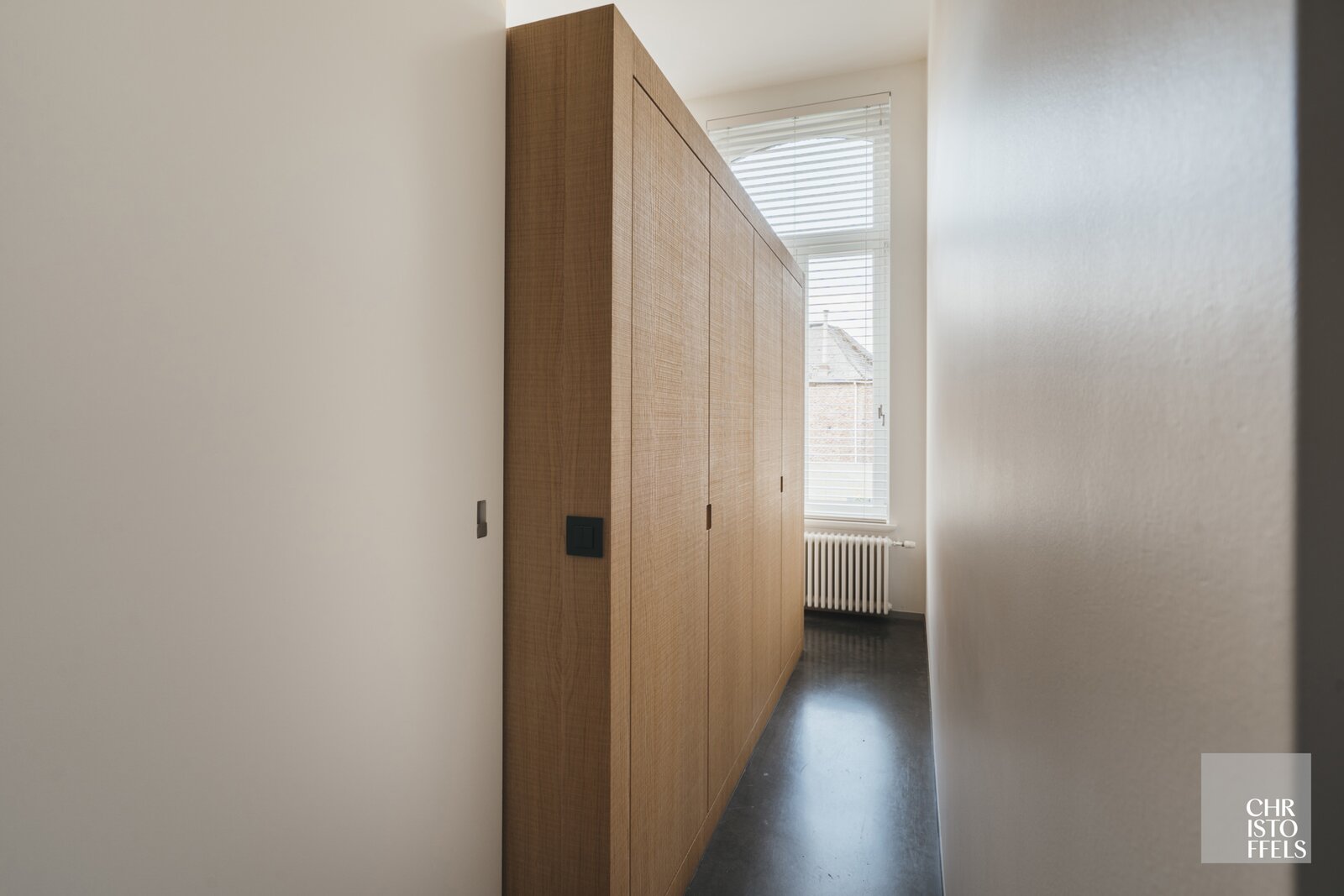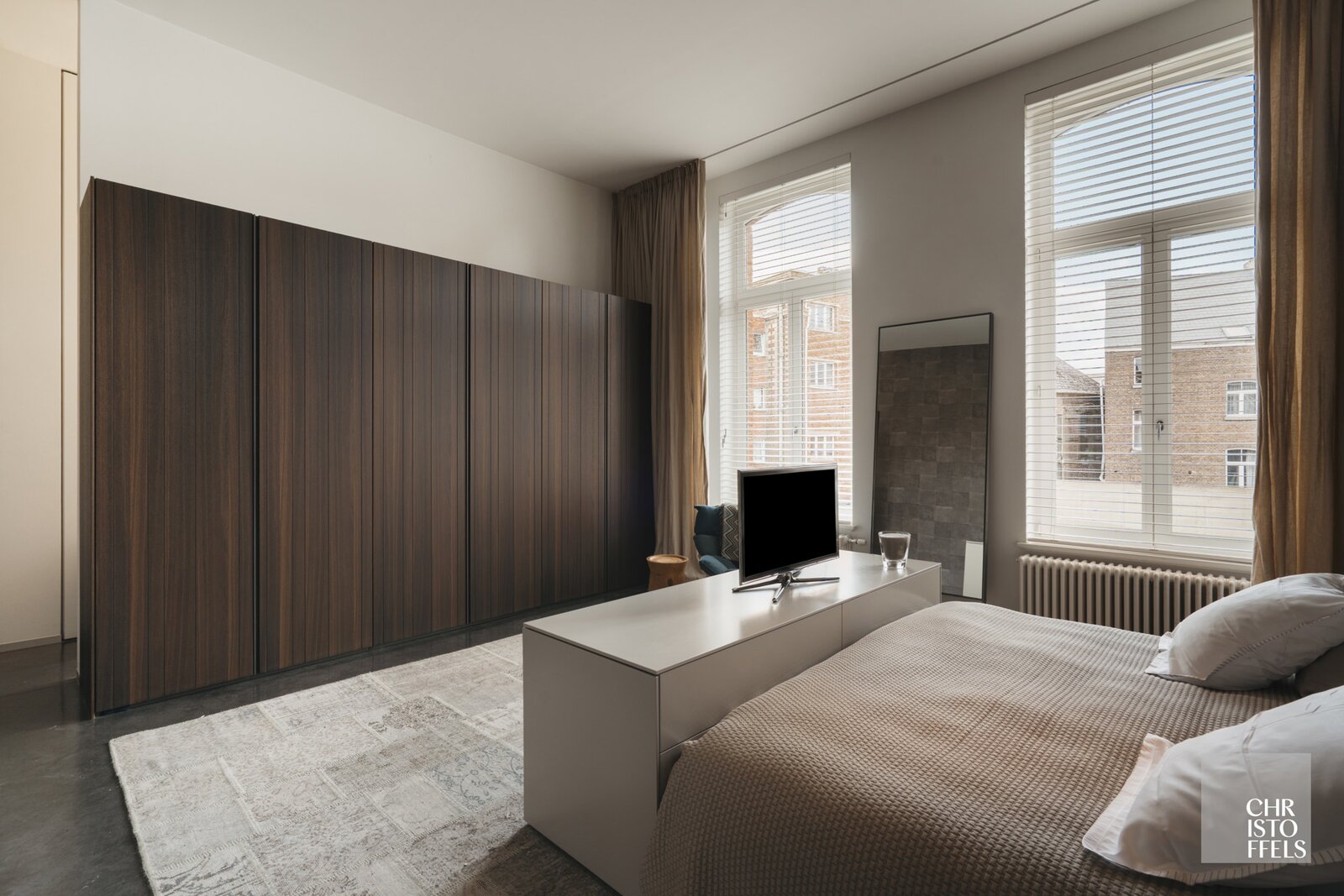 The two spacious bedrooms, designed by RR Interieur, exude refinement and comfort. Adjacent to the master bedroom is a generous oak custom-made walk-in closet, equipped with a built-in foldaway bed for occasional guests.