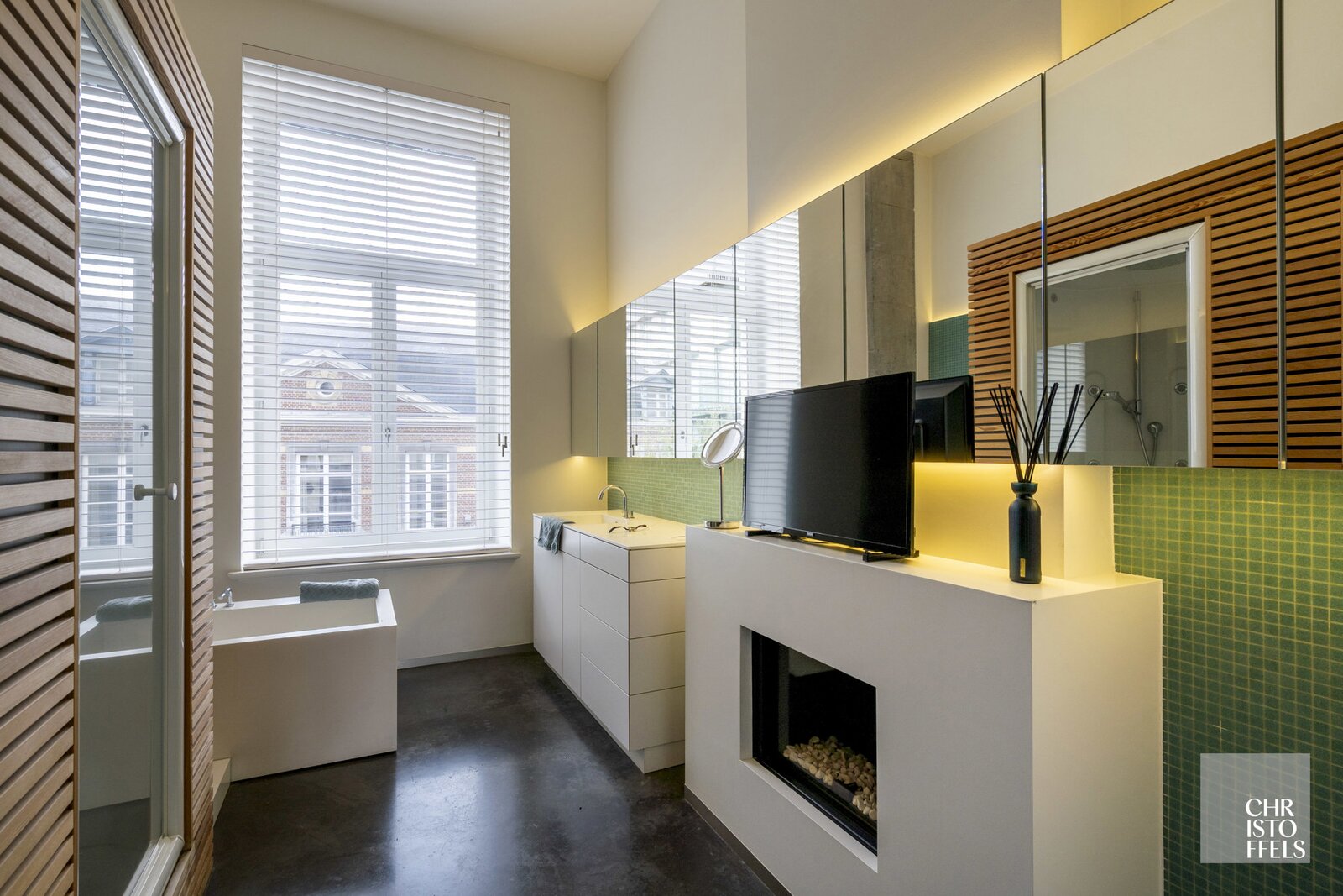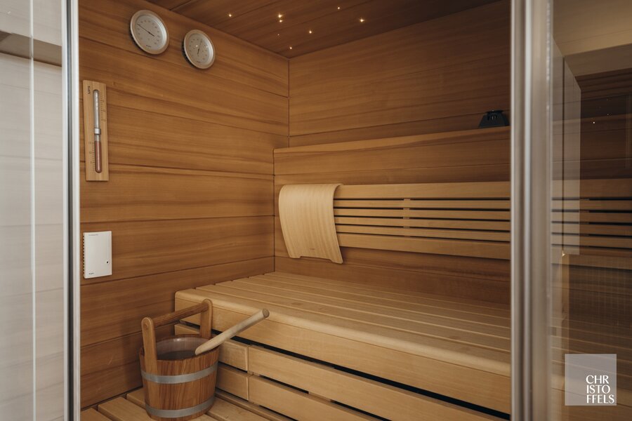 The luxurious bathroom (fully renovated in 2012) includes a custom-made vanity unit, bathtub, Corian steam shower, Antonio Lupi toilet, gas fireplace, and a Klafs sauna.