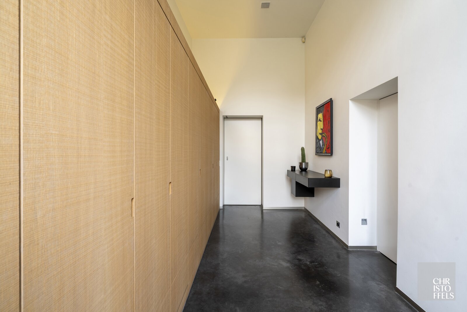 Through the imposing entrance door, you step into the spacious entrance hall. The exceptional ceiling height and large windows provide abundant natural light in every room, creating a magnificent sense of space. The continuous concrete floor with underfloor heating contributes to the stylish unity of the interior.