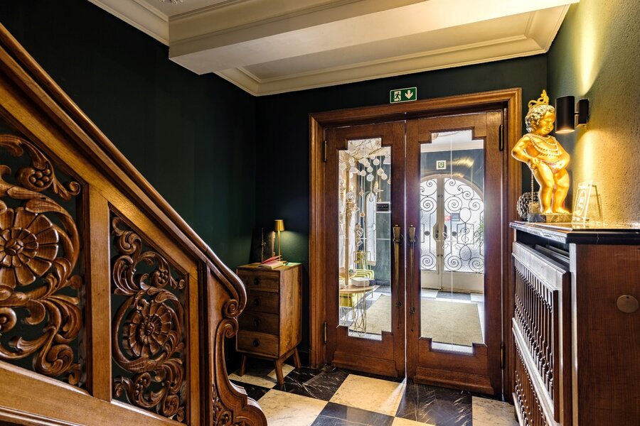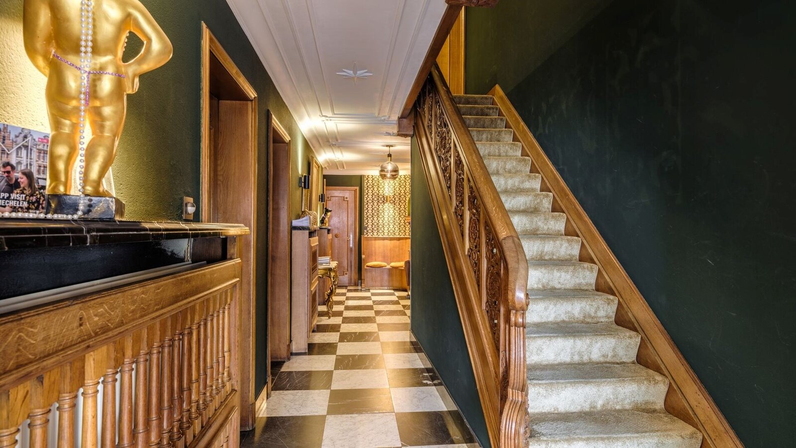 Bij binnenkomst word je verwelkomd in een indrukwekkende inkomhal die de grandeur van het pand meteen voelbaar maakt. Op het gelijkvloers bevinden zich een inpandige garage, een stijlvolle eetruimte, een keuken, een toilet en een bureauruimte. Vanuit de eetruimte heb je toegang tot een prachtige stadstuin, een oase van rust midden in de stad.