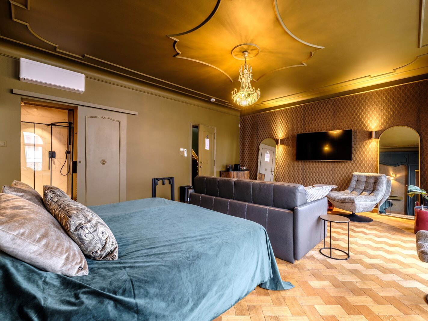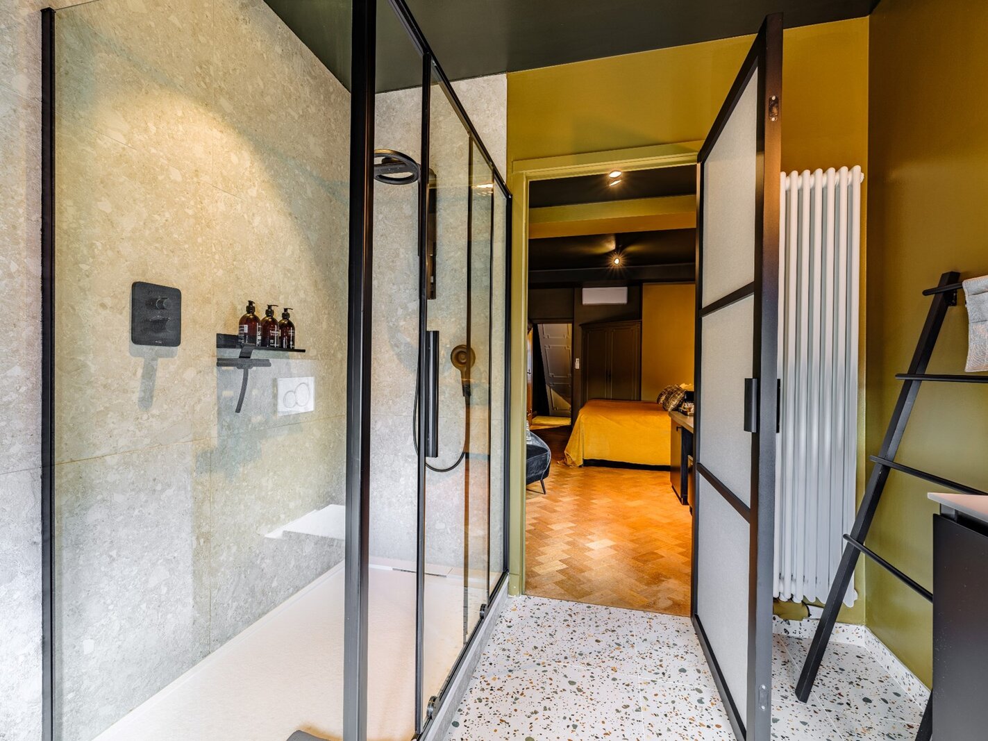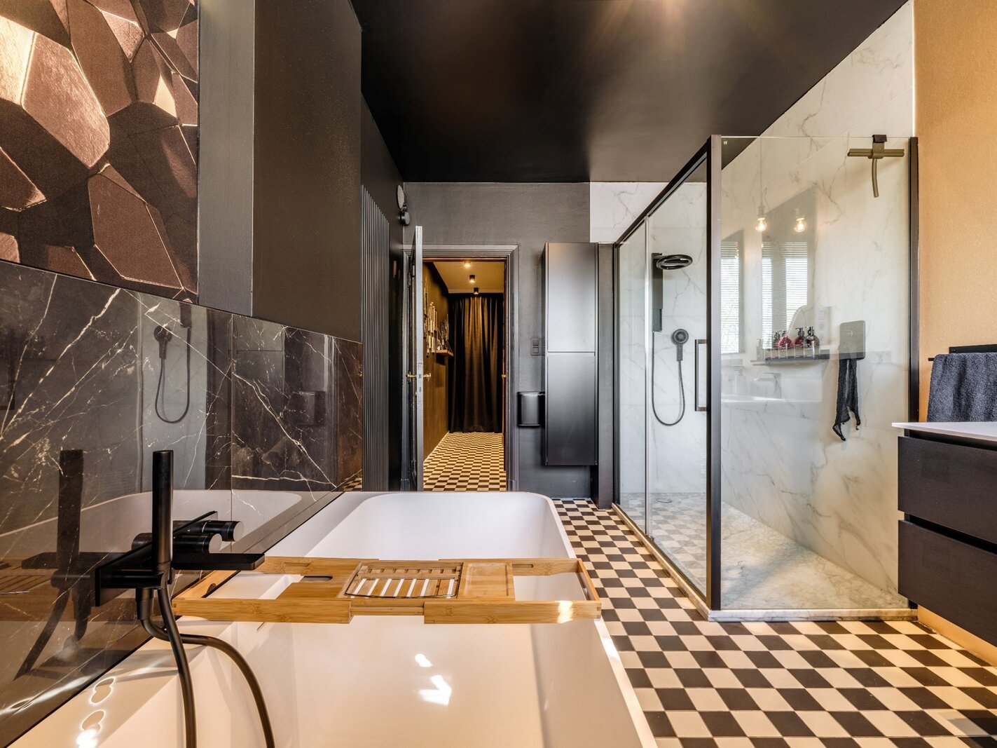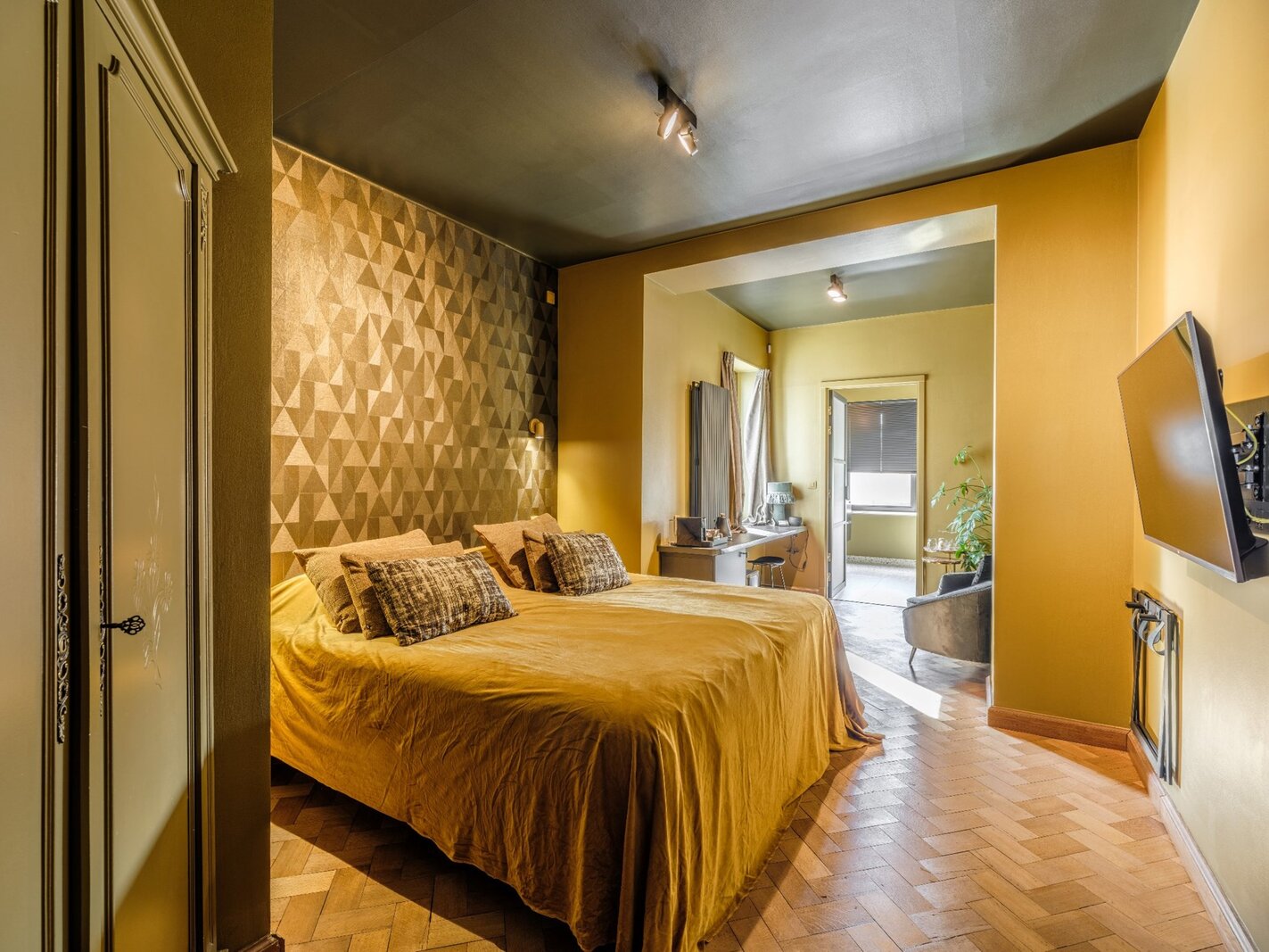 Via de majestueuze trap bereik je de eerste verdieping, waar een ruim woongedeelte met open keuken zich bevindt. Aansluitend vind je een royale slaapkamer met een terras en toegang tot de tuin, een ruime inloopdressing en een luxueuze badkamer.