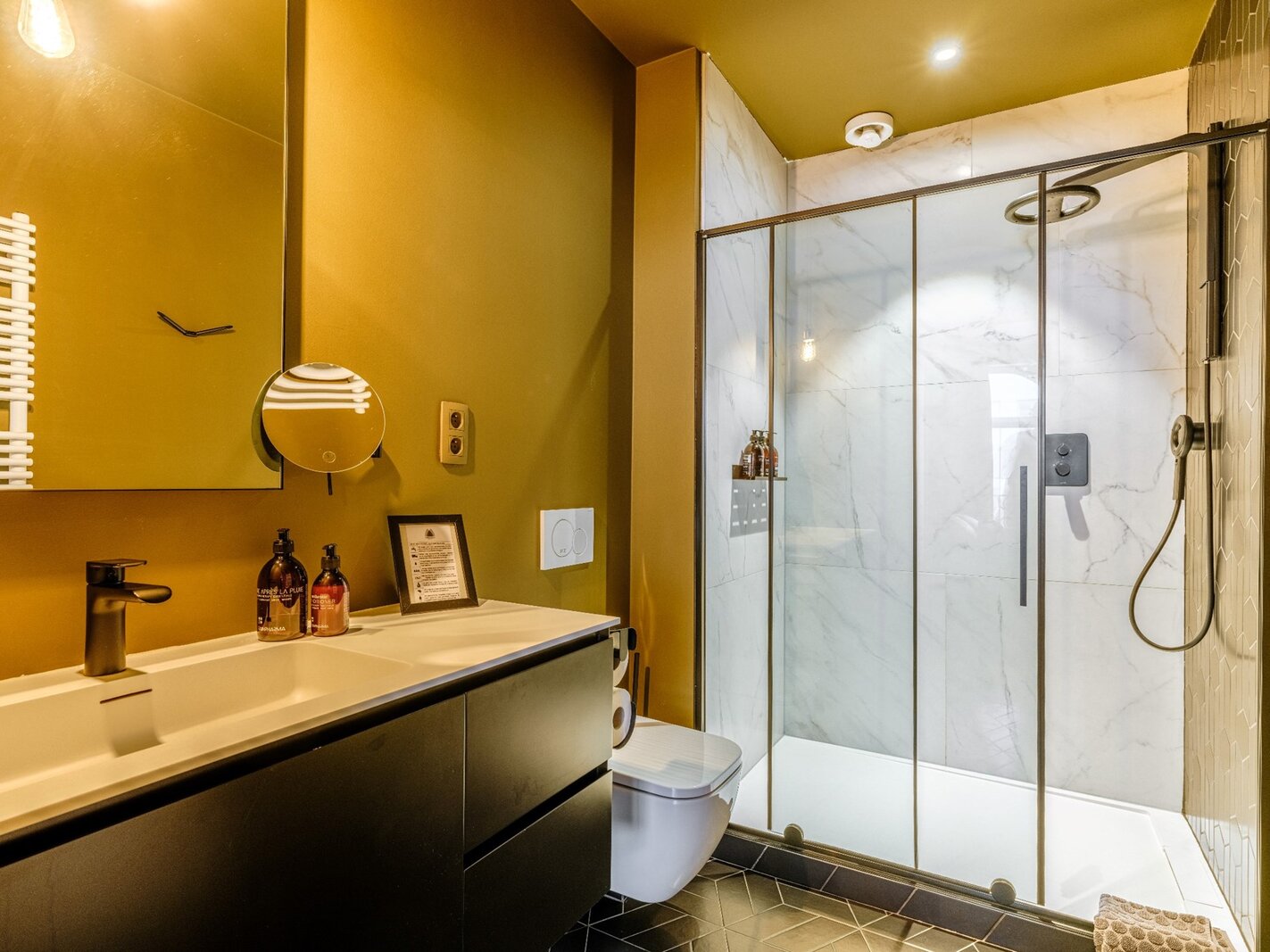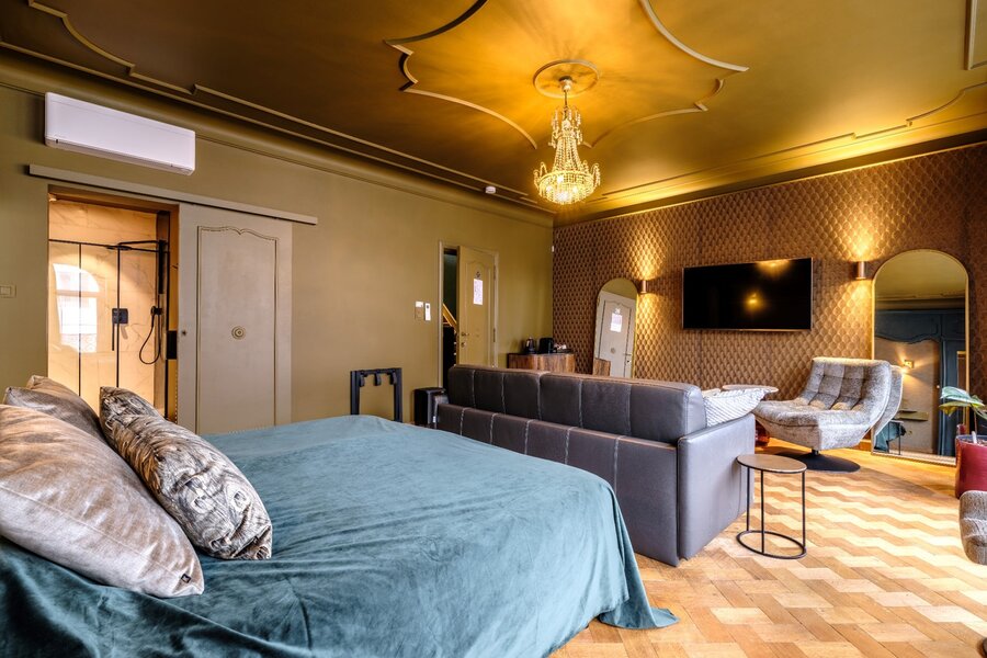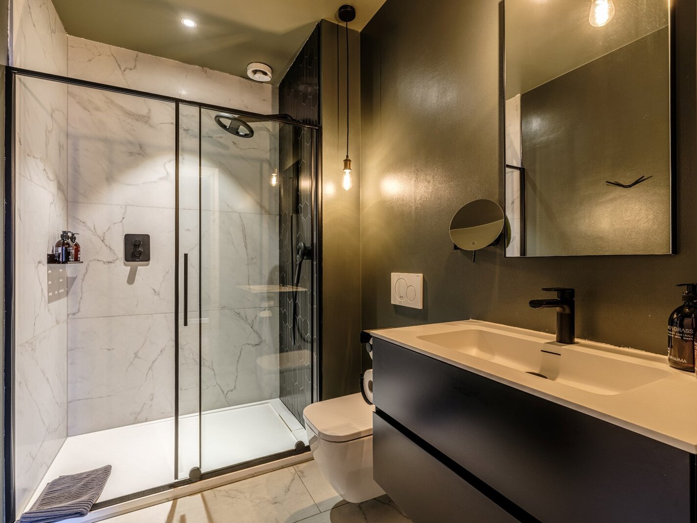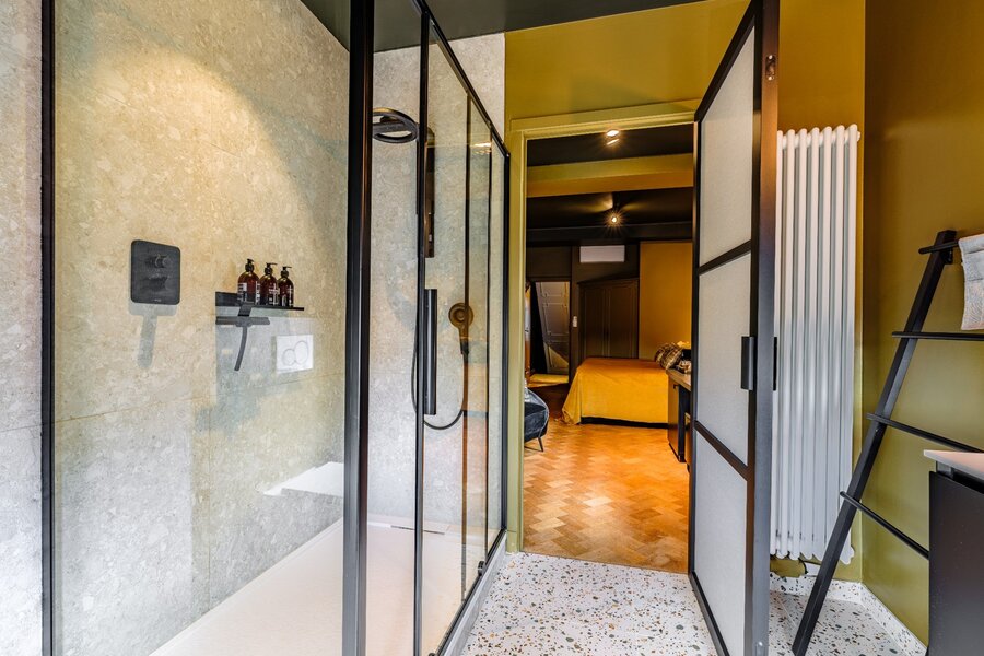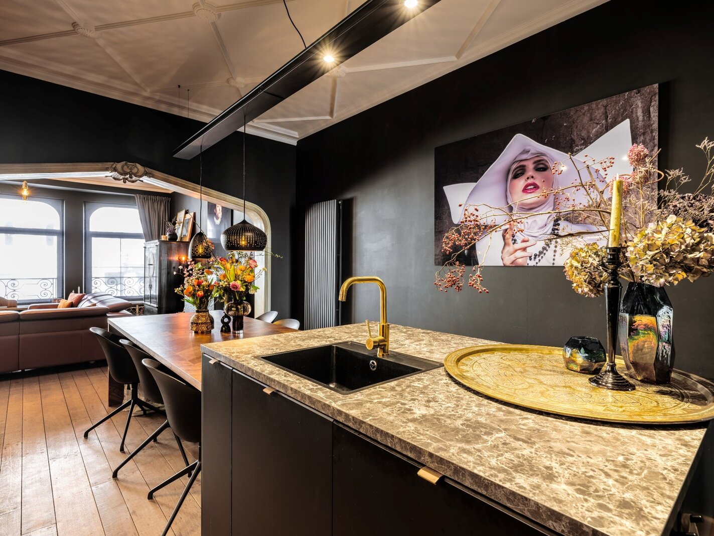 Via de majestueuze trap bereik je de eerste verdieping, waar een ruim woongedeelte met open keuken zich bevindt. Aansluitend vind je een royale slaapkamer met een terras en toegang tot de tuin, een ruime inloopdressing en een luxueuze badkamer.
