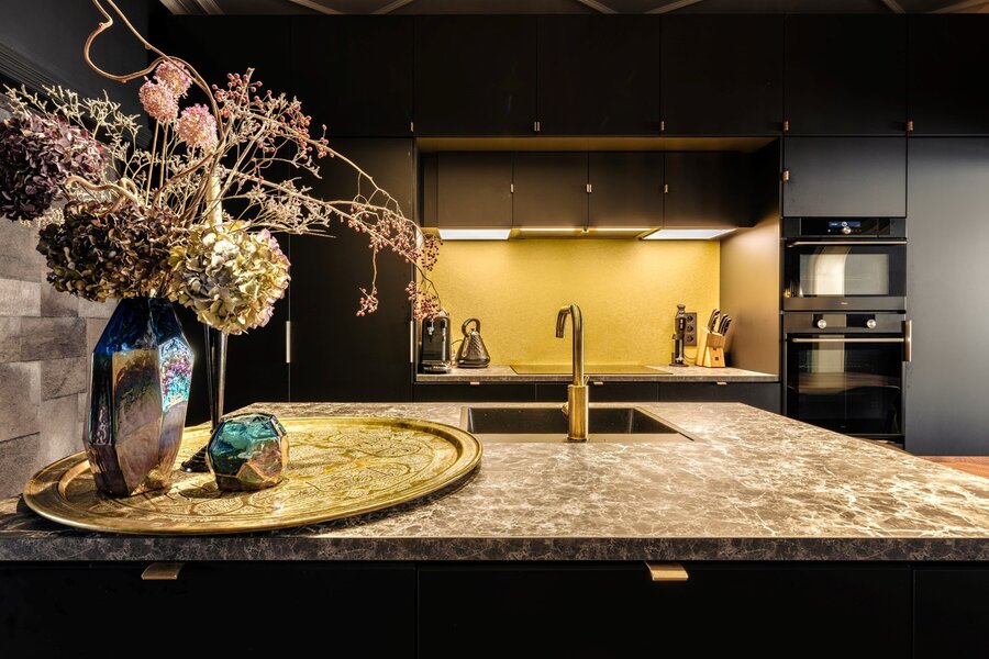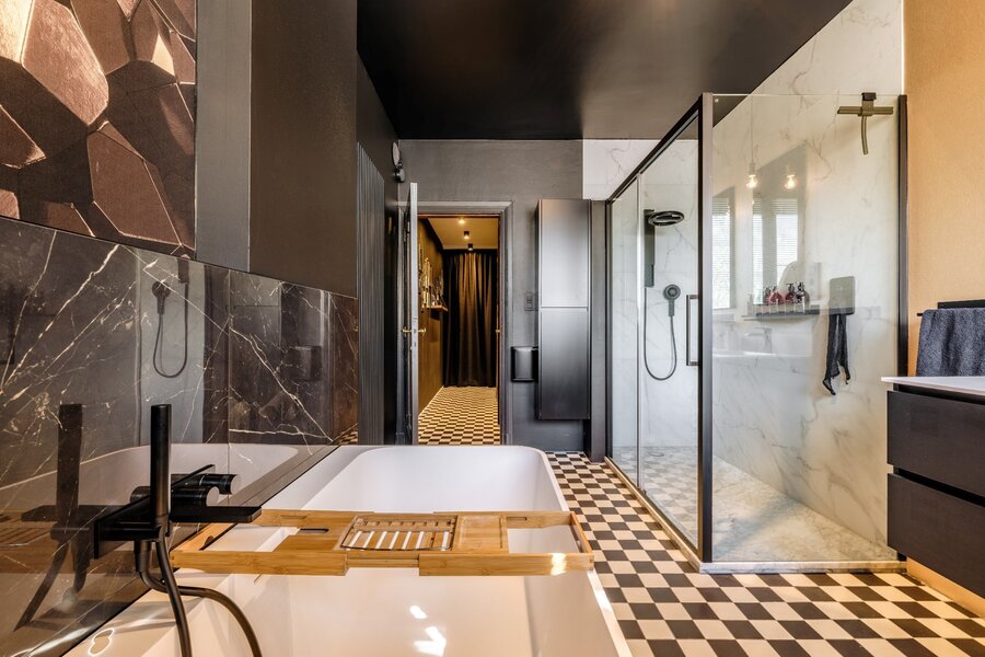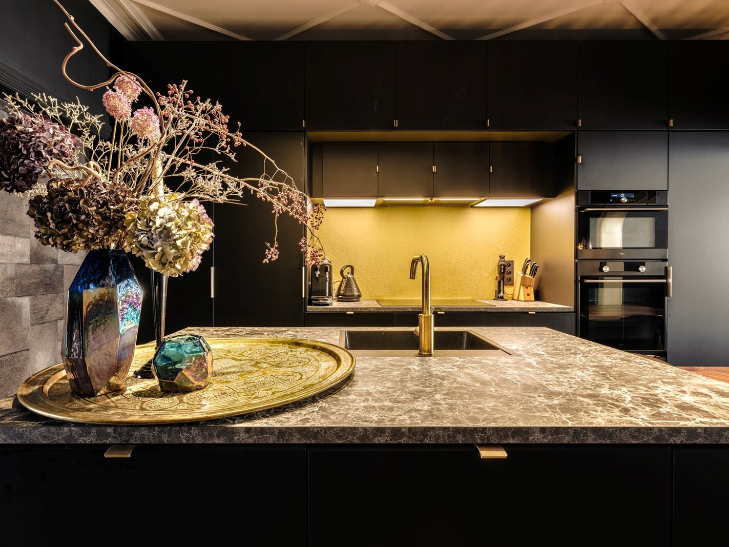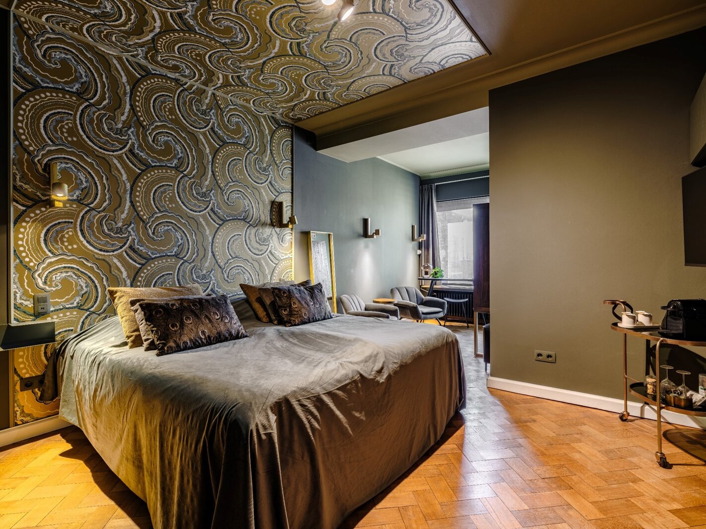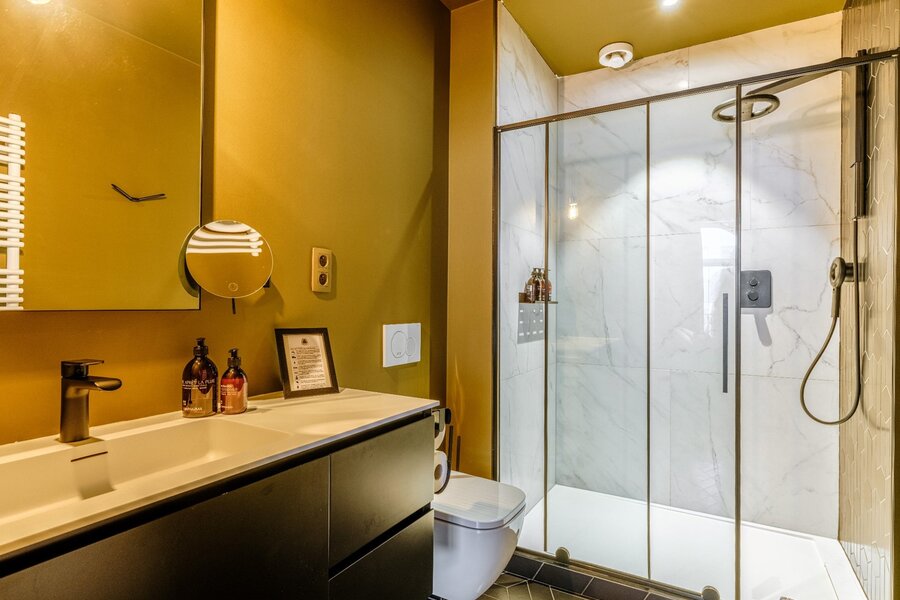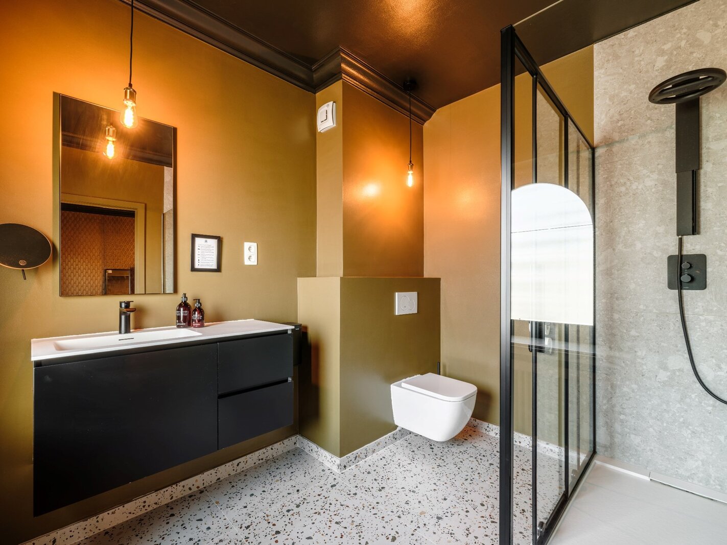 Via de majestueuze trap bereik je de eerste verdieping, waar een ruim woongedeelte met open keuken zich bevindt. Aansluitend vind je een royale slaapkamer met een terras en toegang tot de tuin, een ruime inloopdressing en een luxueuze badkamer.