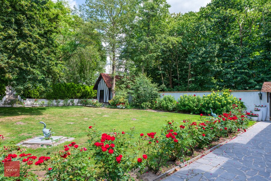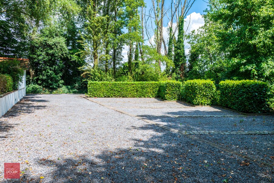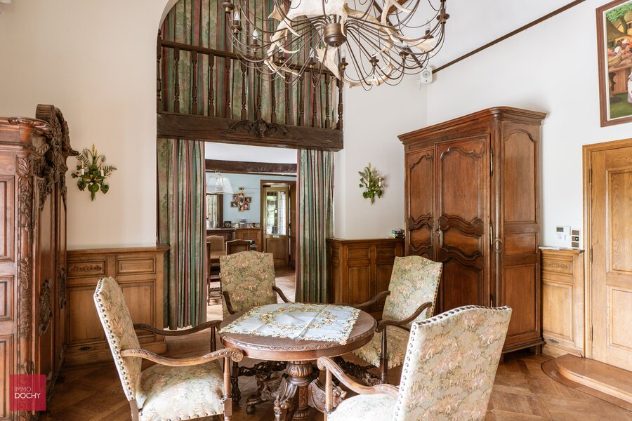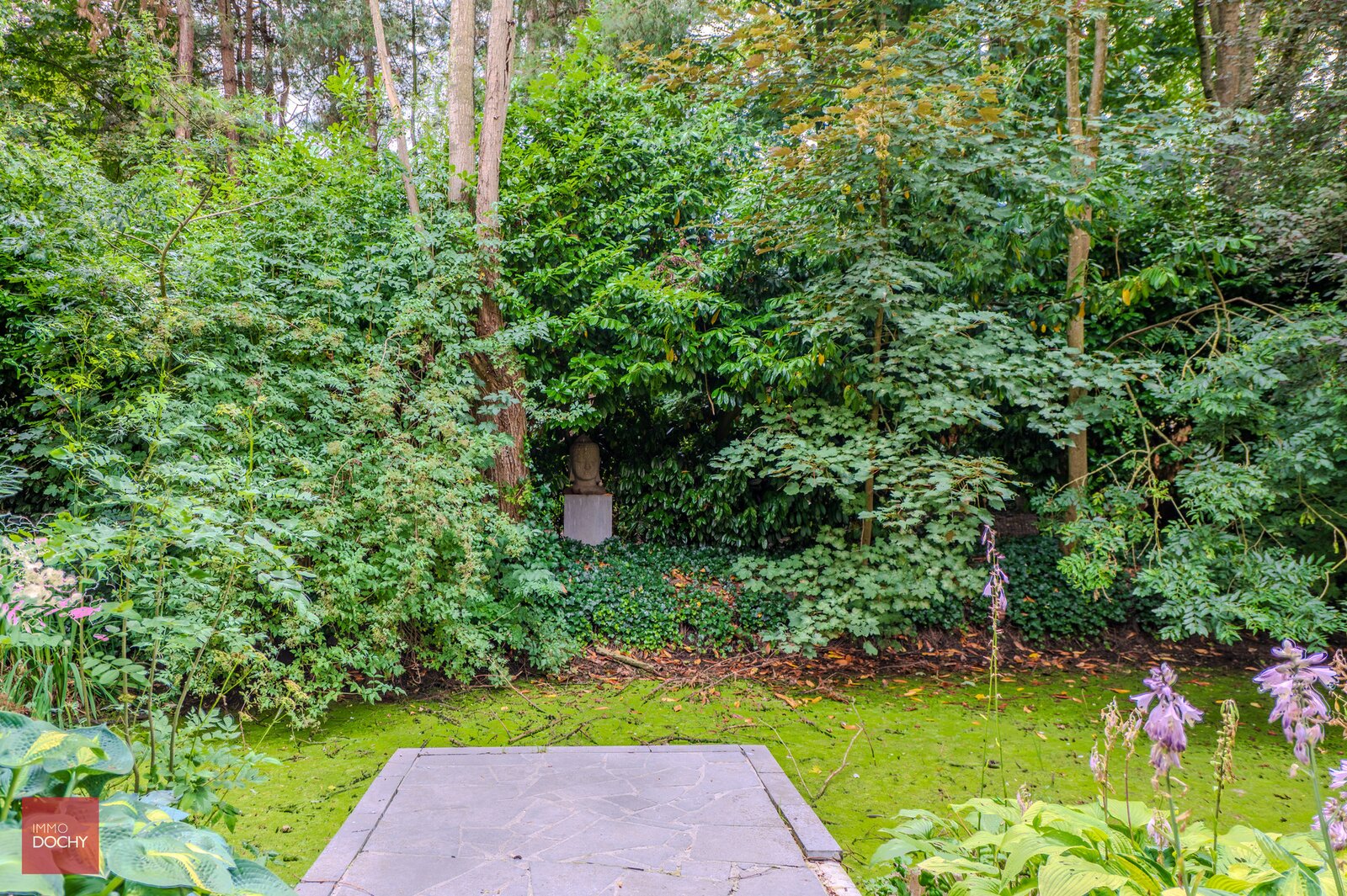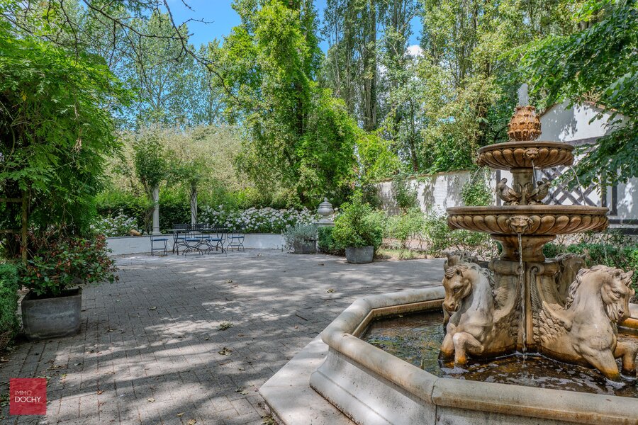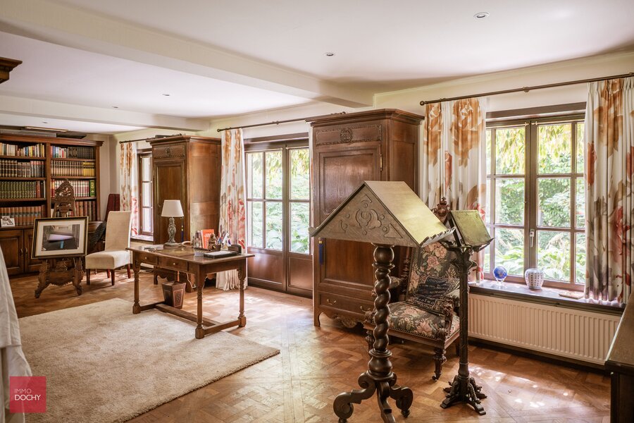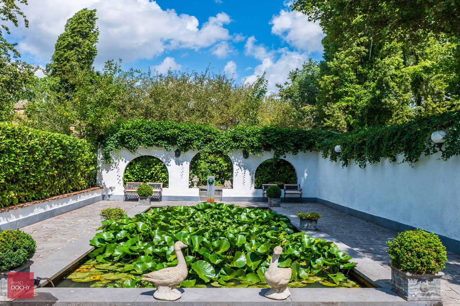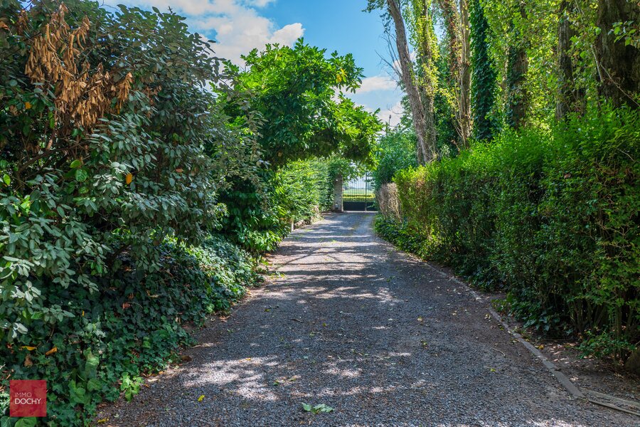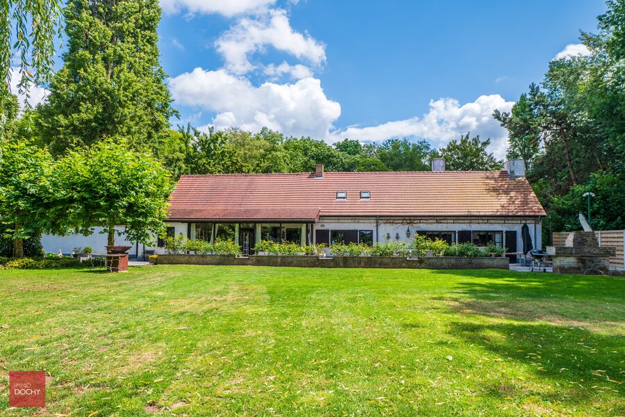 Zeer ruime eigendom bestaande uit inkomhal, grote living met open haard en eethoek, aparte eetplaats, keuken, bijkeuken, bureel (bibliotheek), 5 slaapkamers (bereikbaar via 2 aparte trappen), 5 badkamers, orangerie, kelder, zolder, dubbele garage en enkele garage (berging), tuin met wal, vijver en terrassen op ca. 7.800m².