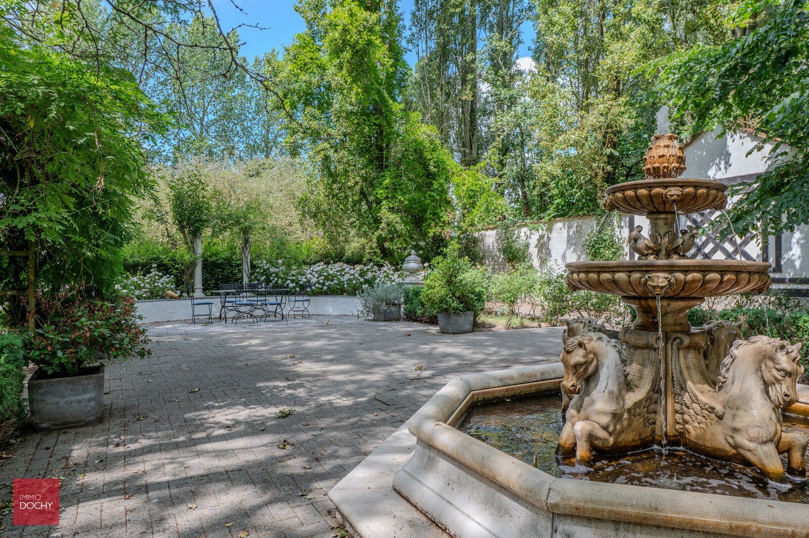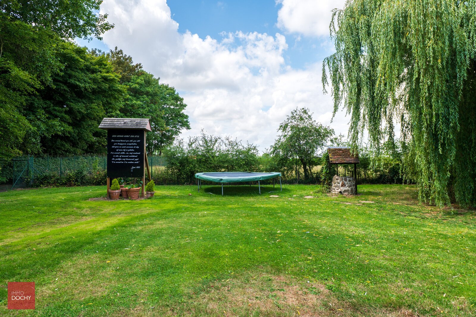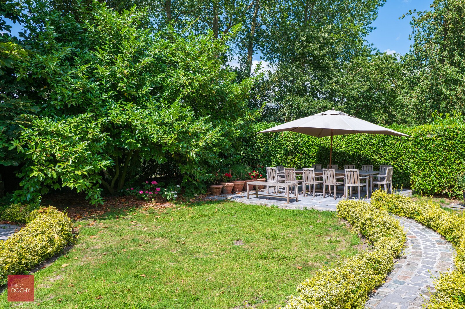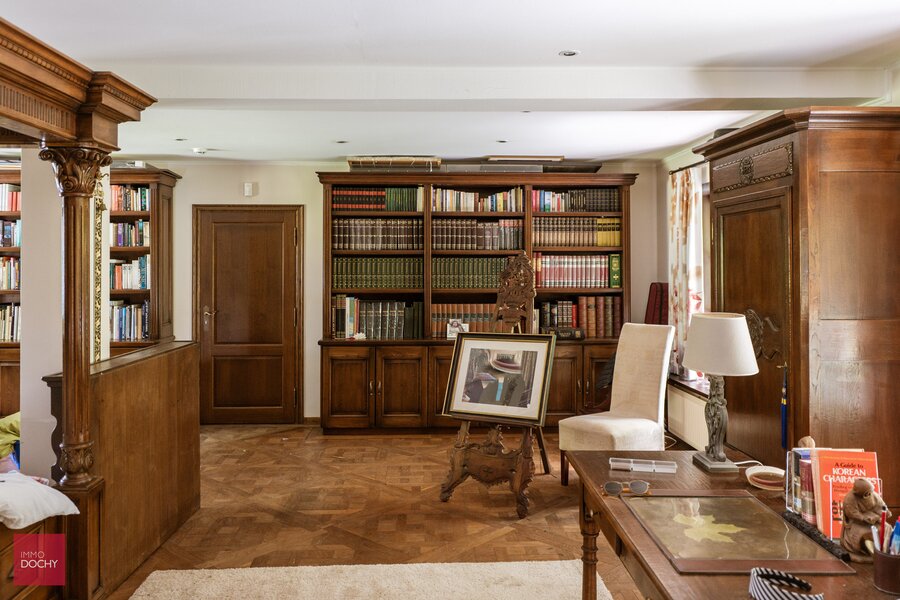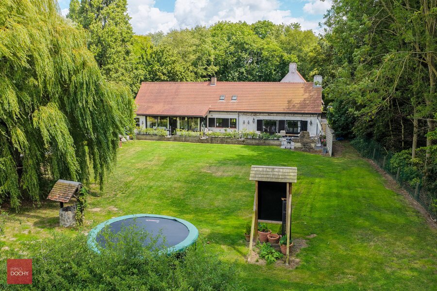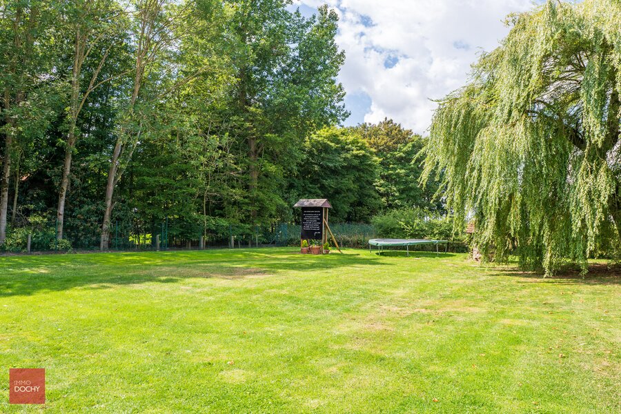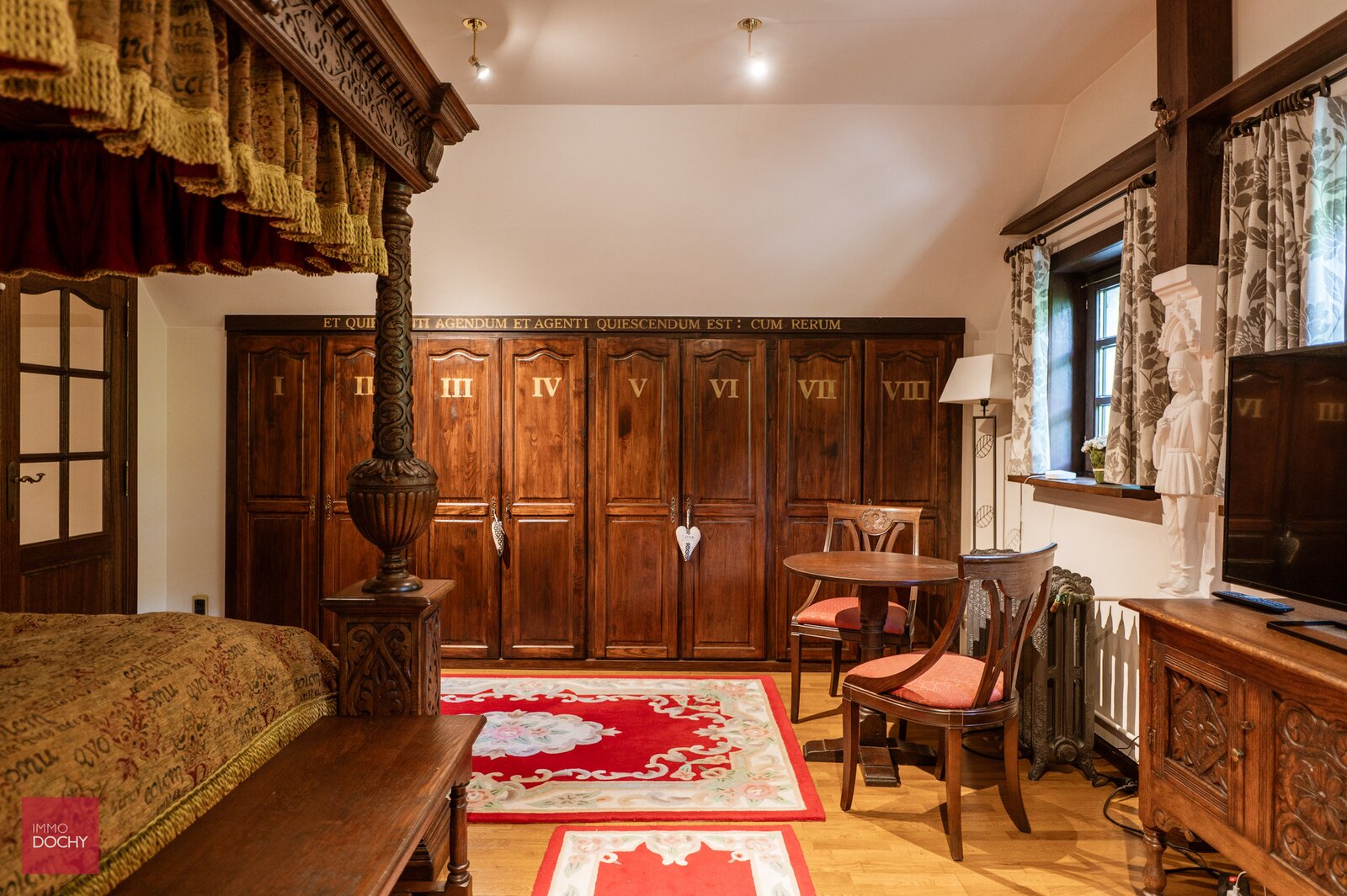 Zeer ruime eigendom bestaande uit inkomhal, grote living met open haard en eethoek, aparte eetplaats, keuken, bijkeuken, bureel (bibliotheek), 5 slaapkamers (bereikbaar via 2 aparte trappen), 5 badkamers, orangerie, kelder, zolder, dubbele garage en enkele garage (berging), tuin met wal, vijver en terrassen op ca. 7.800m².