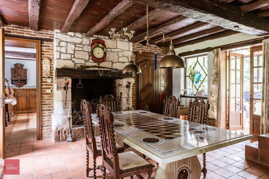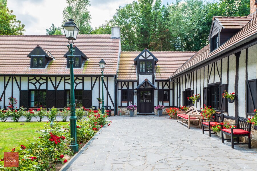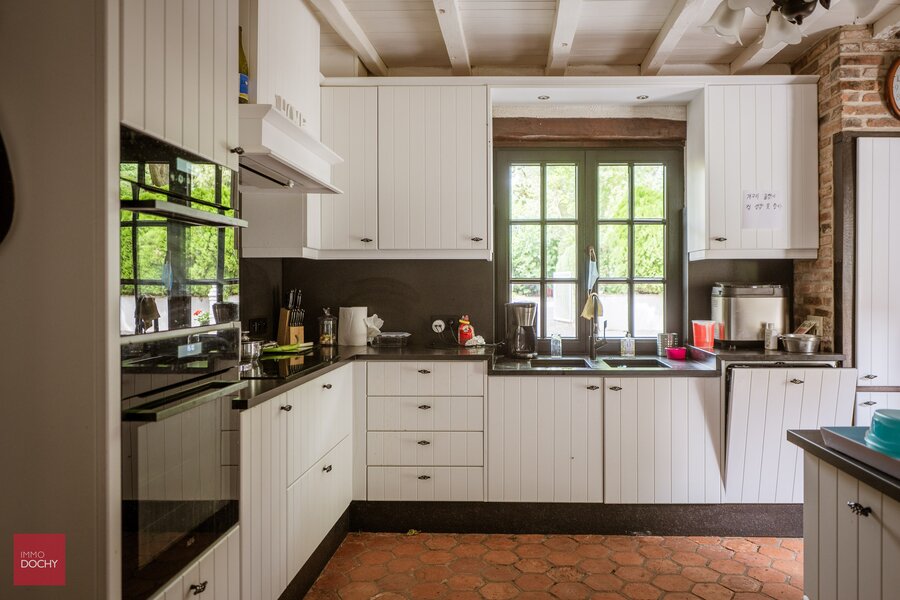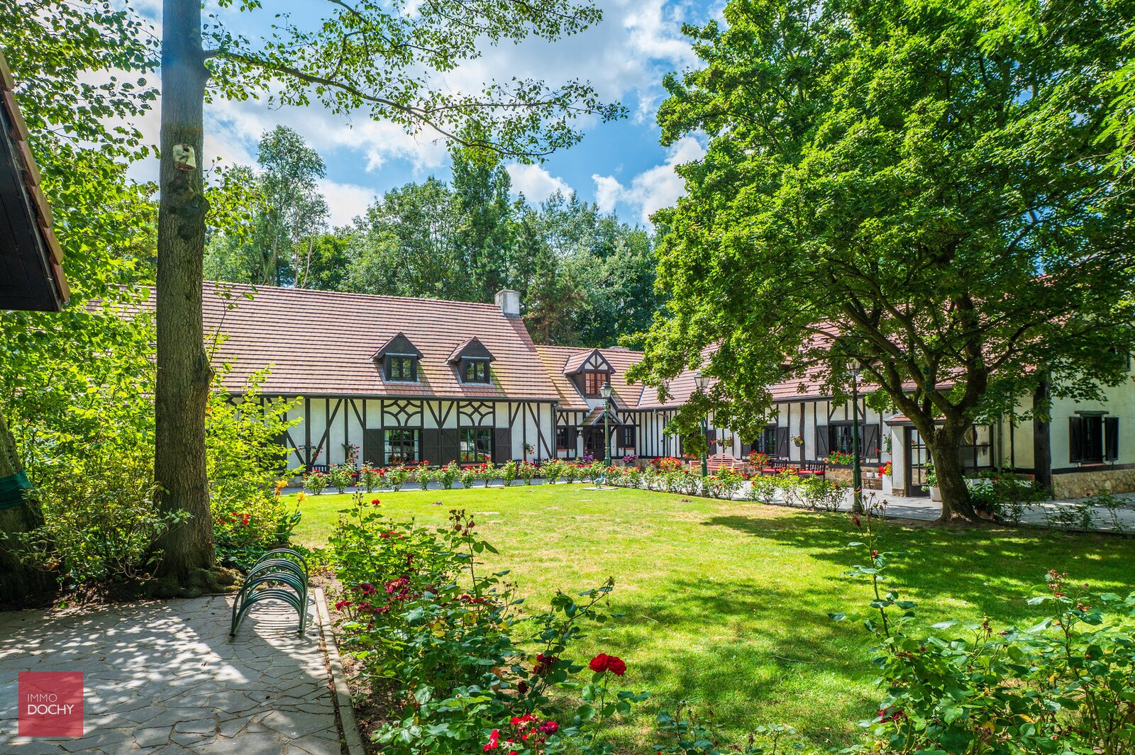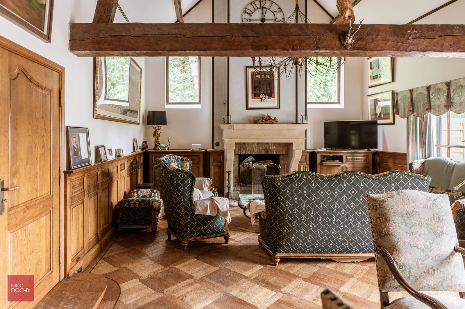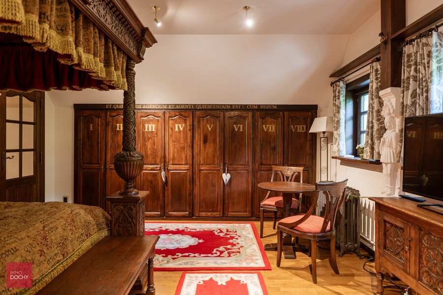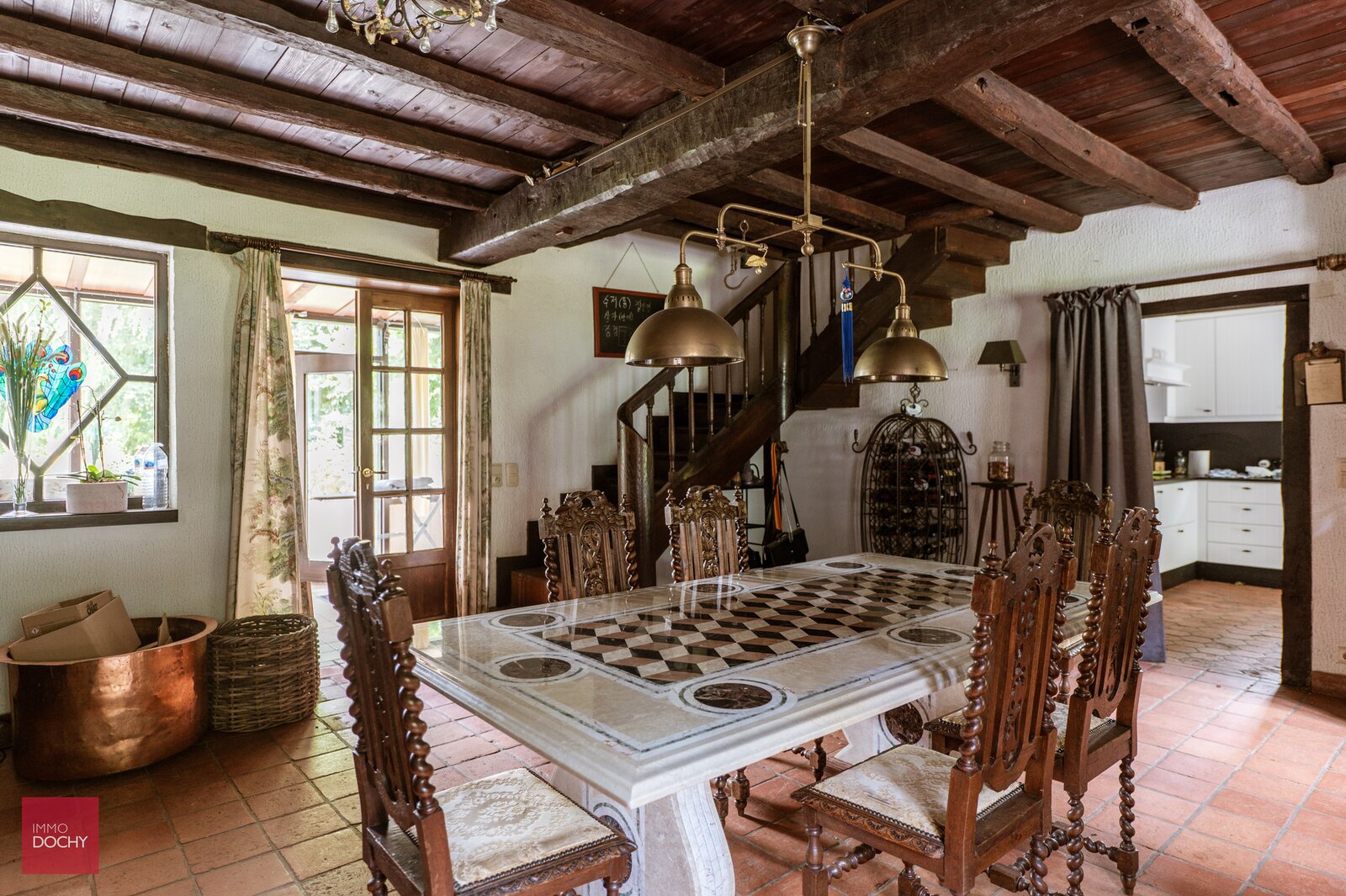 Zeer ruime eigendom bestaande uit inkomhal, grote living met open haard en eethoek, aparte eetplaats, keuken, bijkeuken, bureel (bibliotheek), 5 slaapkamers (bereikbaar via 2 aparte trappen), 5 badkamers, orangerie, kelder, zolder, dubbele garage en enkele garage (berging), tuin met wal, vijver en terrassen op ca. 7.800m².