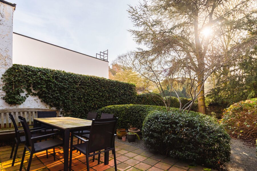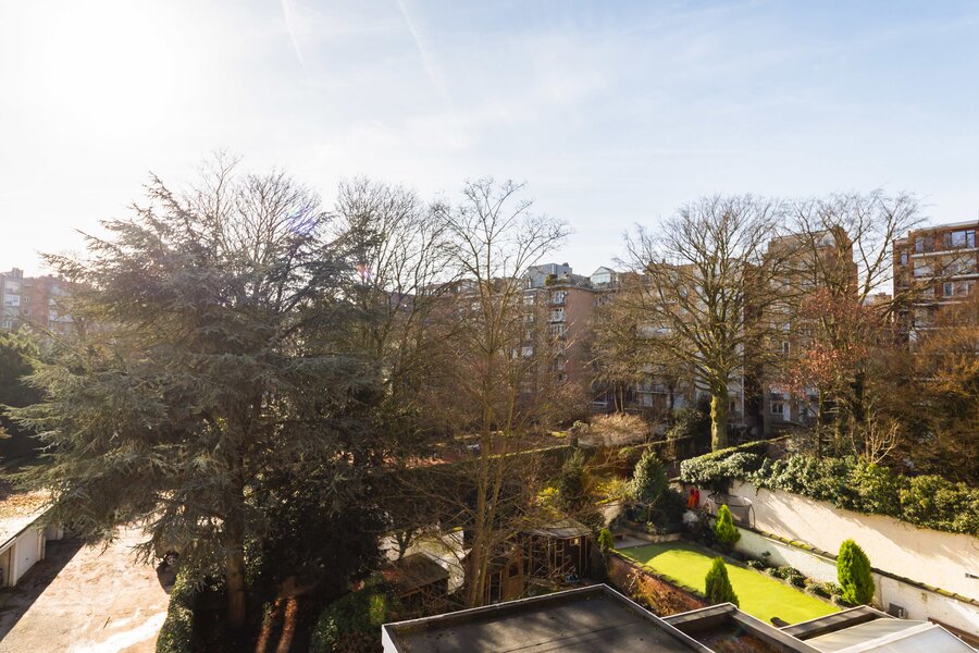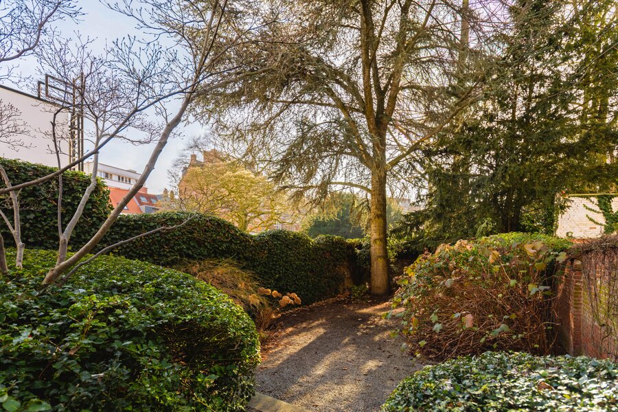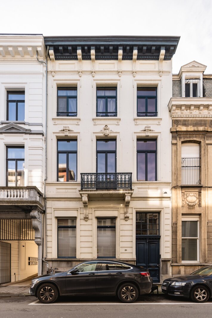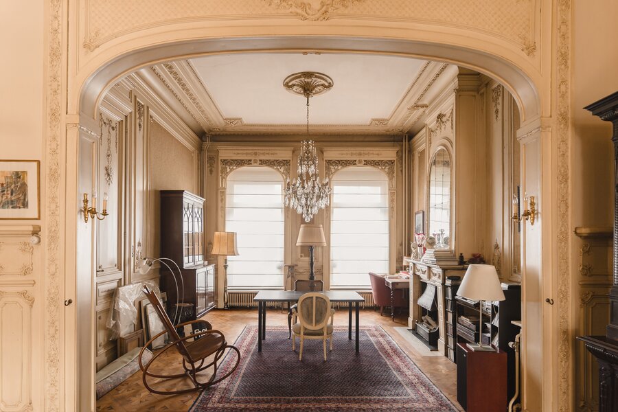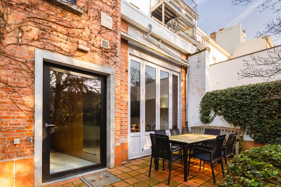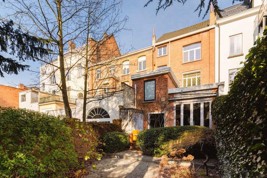 What immediately strikes you about this magnificent, south-facing town house with its impressive 7.5-metre-wide façade is the beautiful light that floods in. The ground floor has a traditional layout: several interconnected salons or sitting rooms with beautifully preserved, rich mouldings and panelling – just as it was when this house was built in 1886 at the request of glazier and “doreur-encadreur” Henri Everaerts. At the rear, you will find a wide terrace with a deep, green city garden.