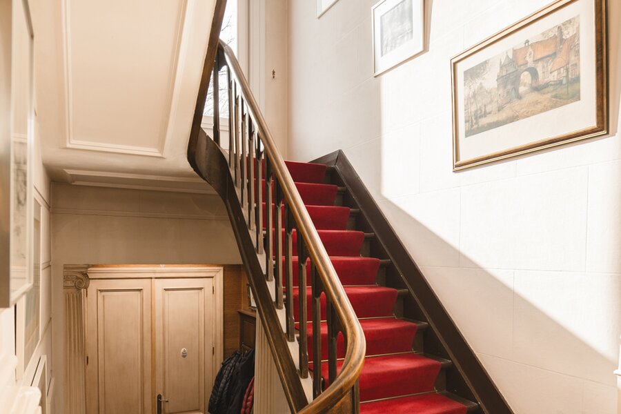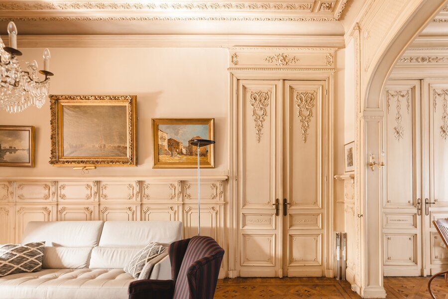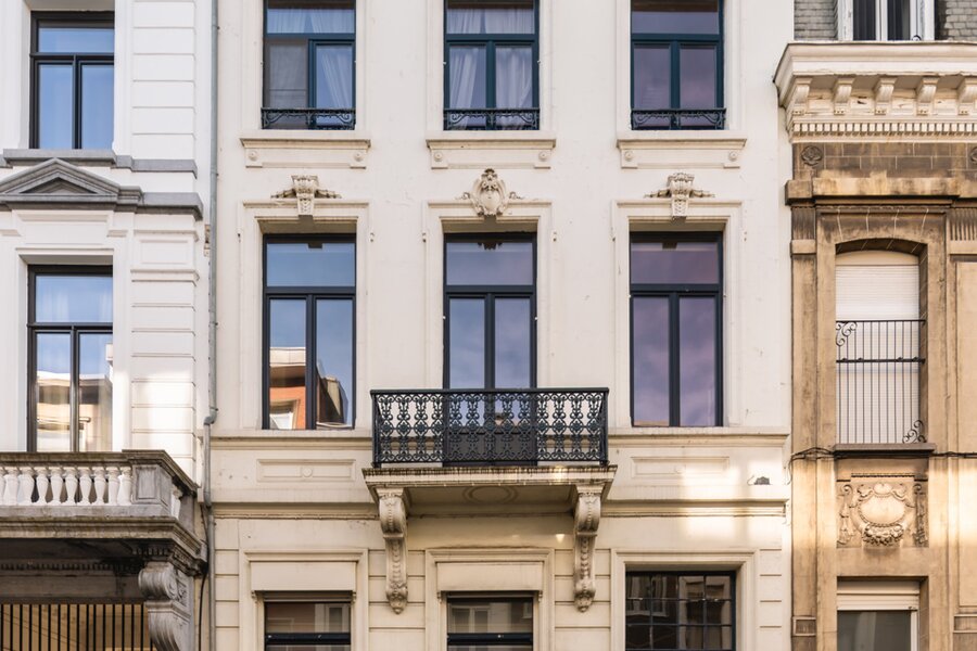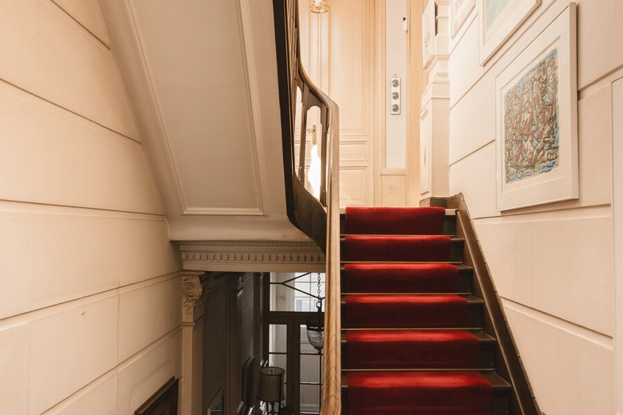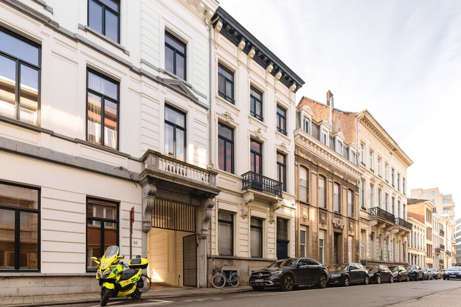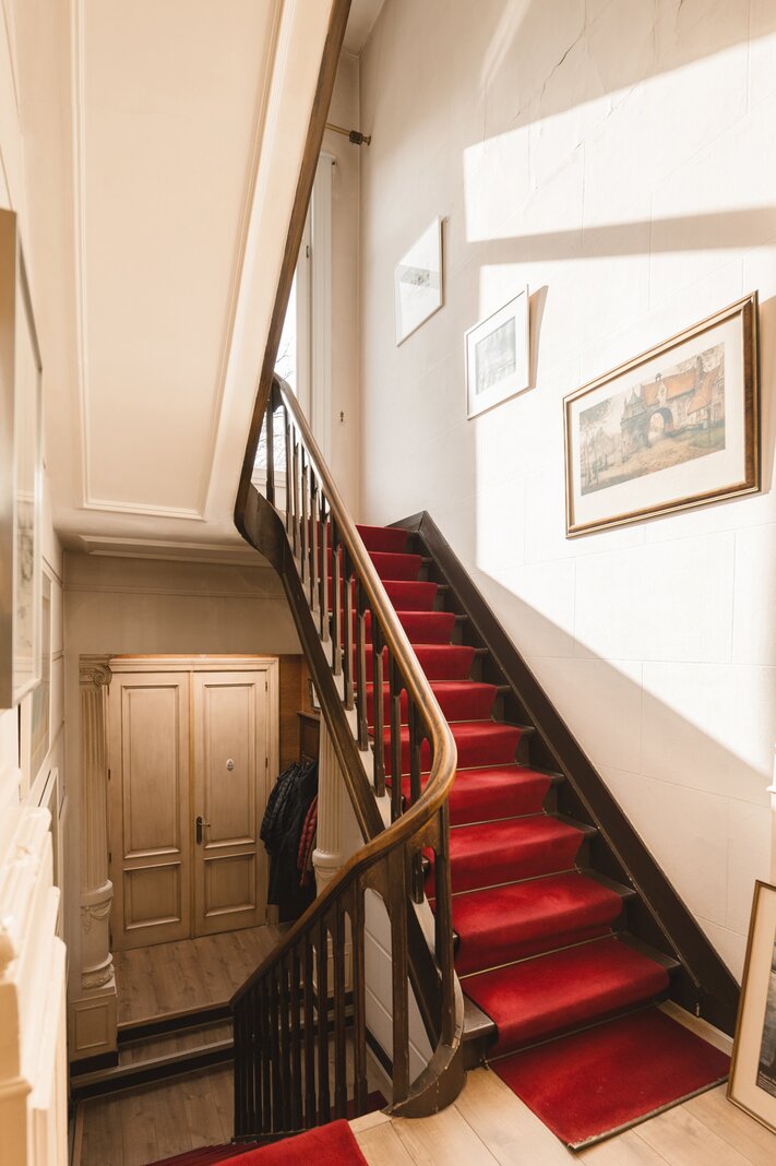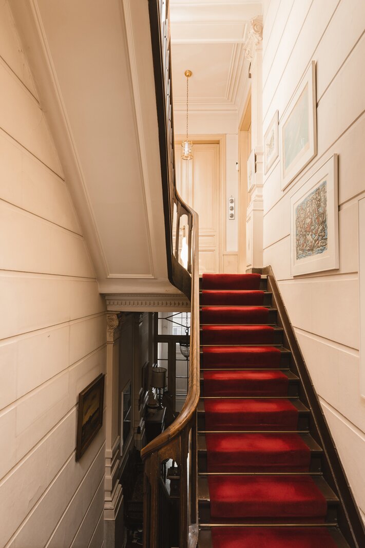 What immediately strikes you about this magnificent, south-facing town house with its impressive 7.5-metre-wide façade is the beautiful light that floods in. The ground floor has a traditional layout: several interconnected salons or sitting rooms with beautifully preserved, rich mouldings and panelling – just as it was when this house was built in 1886 at the request of glazier and “doreur-encadreur” Henri Everaerts. At the rear, you will find a wide terrace with a deep, green city garden.