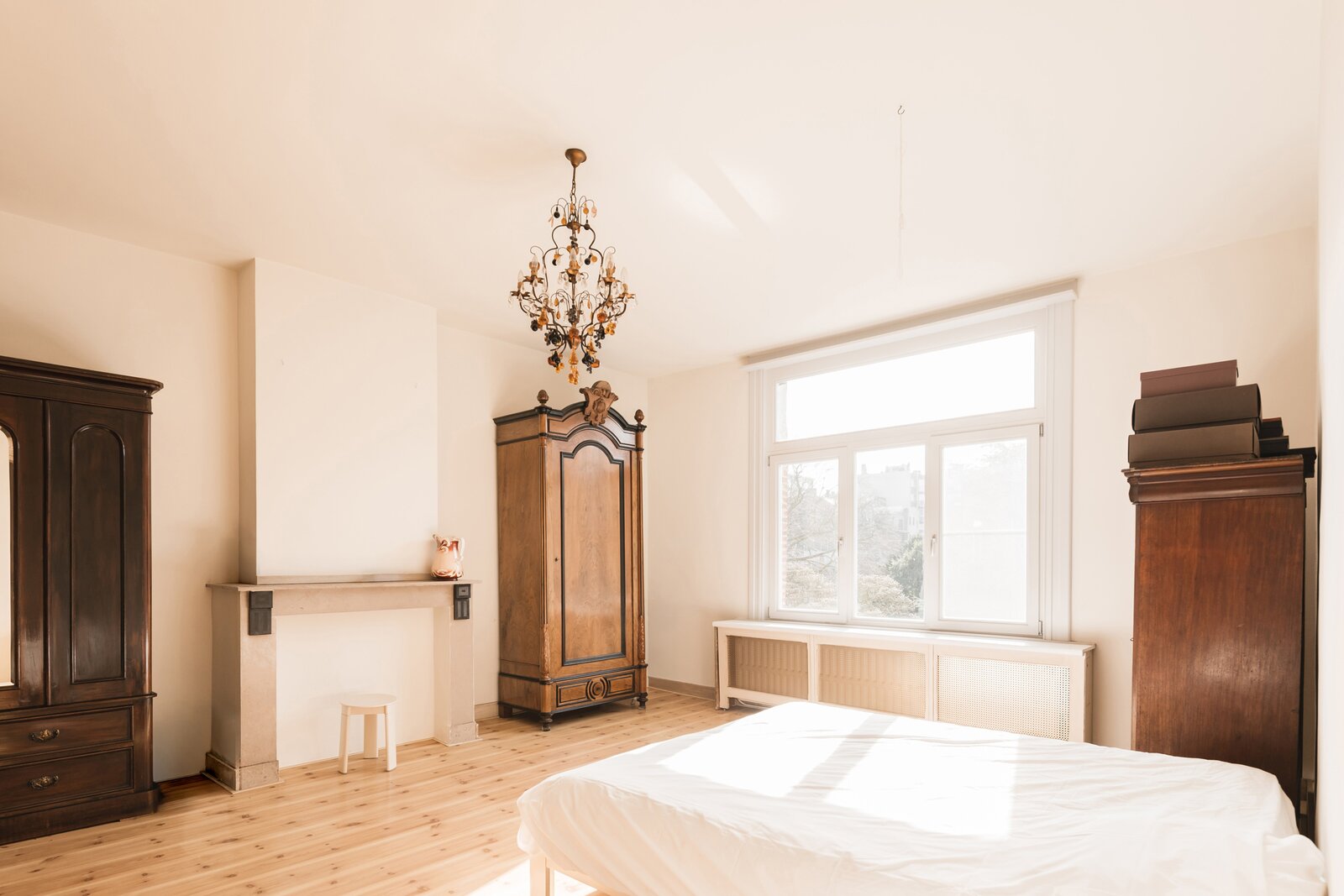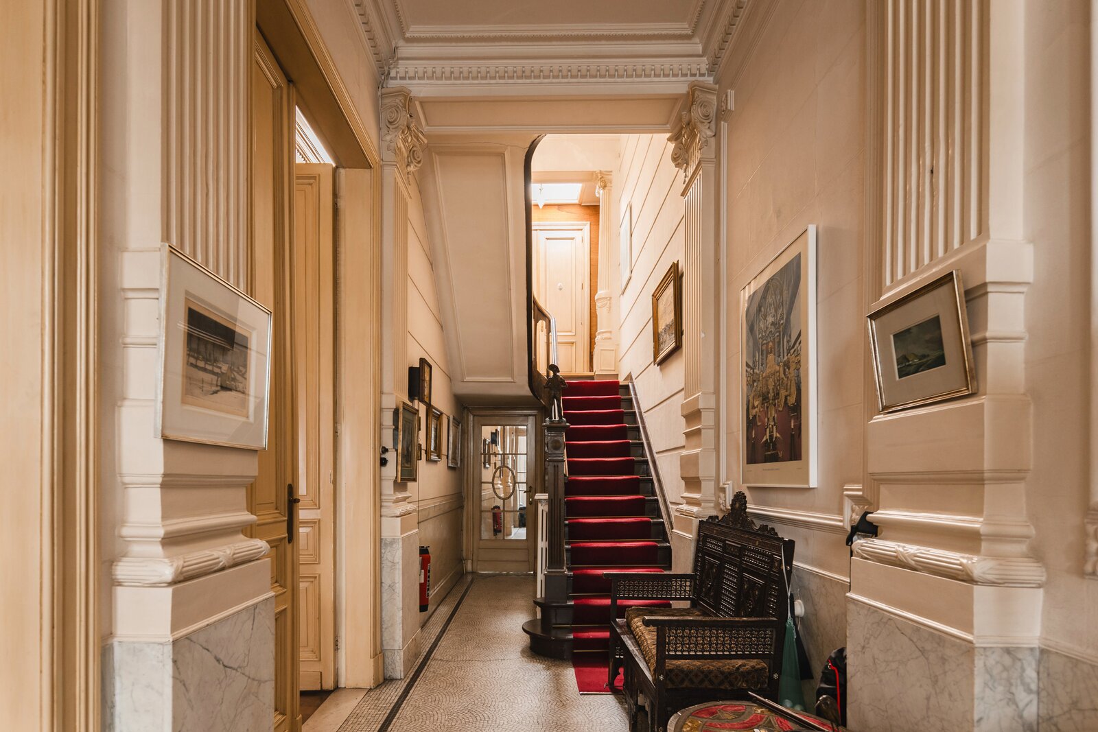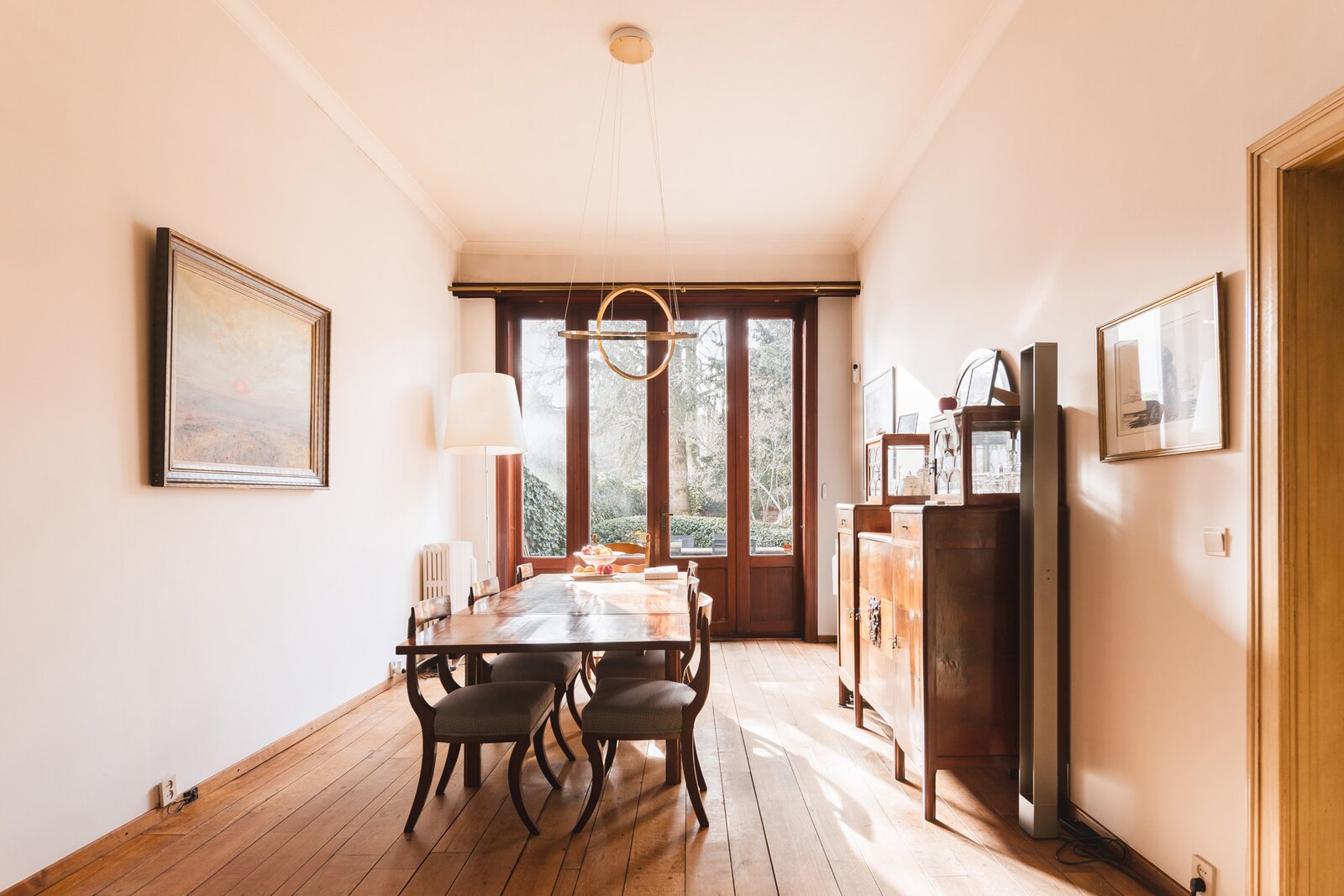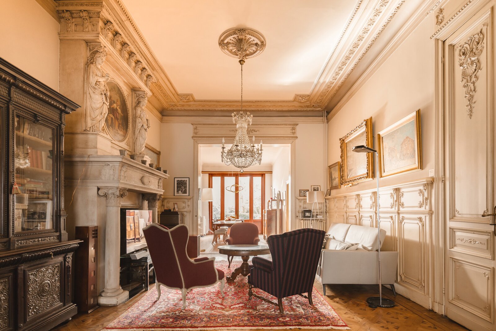What immediately strikes you about this magnificent, south-facing town house with its impressive 7.5-metre-wide façade is the beautiful light that floods in. The ground floor has a traditional layout: several interconnected salons or sitting rooms with beautifully preserved, rich mouldings and panelling – just as it was when this house was built in 1886 at the request of glazier and “doreur-encadreur” Henri Everaerts. At the rear, you will find a wide terrace with a deep, green city garden.