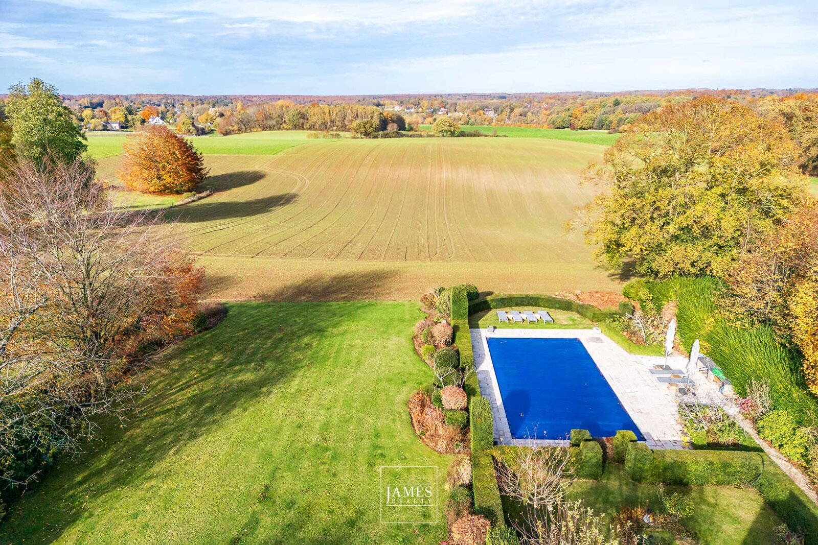 The 14 m × 7 m swimming pool, surrounded by approximately 100 m² of decking, enjoys an exceptional unobstructed view of the fields. Landscape lighting showcases the flower beds after dark.