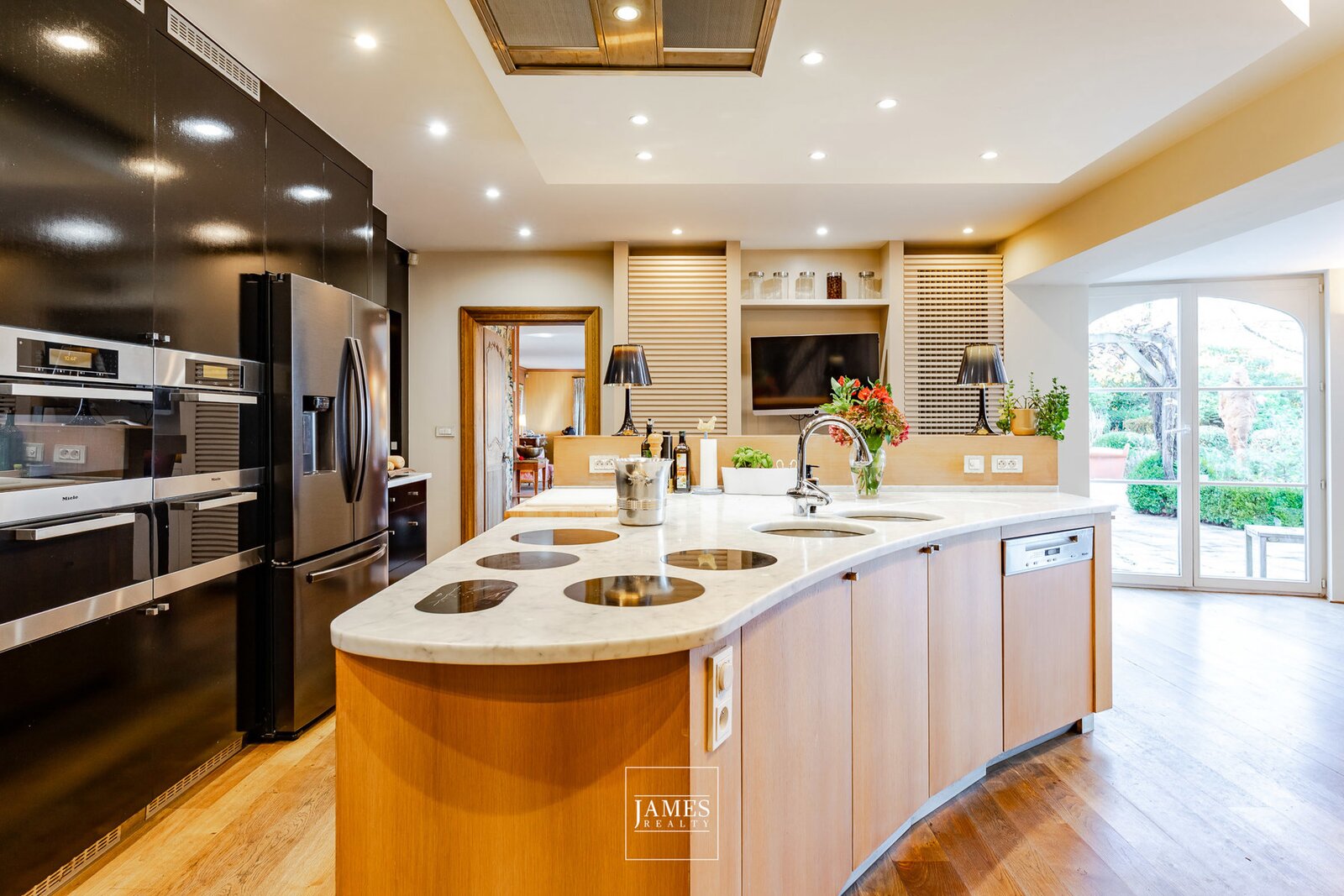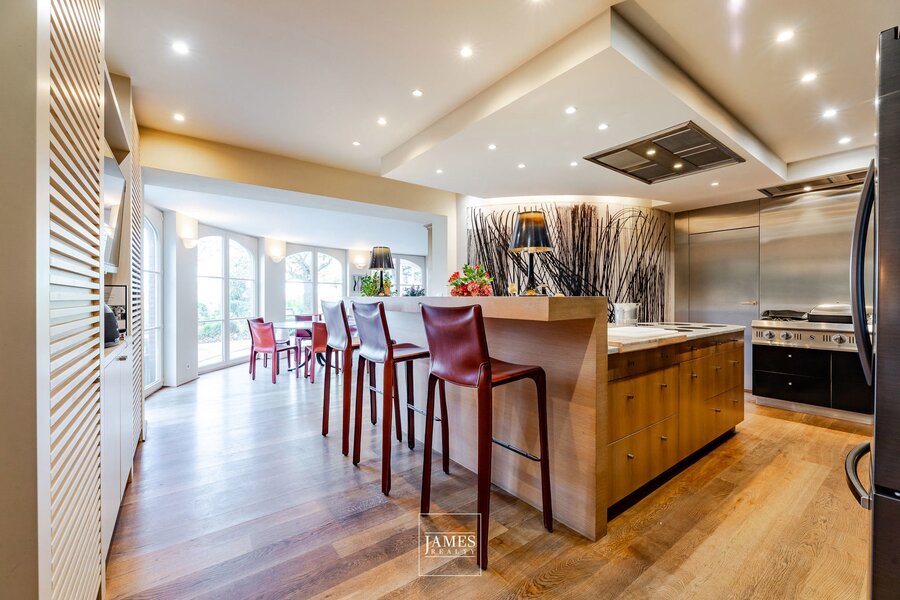 The ± 52 m² semi-professional kitchen is organized around a large central island with a bar counter and a rotunda dining area opening onto the garden. It is equipped with 2 hoods, 6 induction hobs, a 5-zone gas stove, and Miele appliances. An adjoining, discreetly integrated laundry room completes this space.