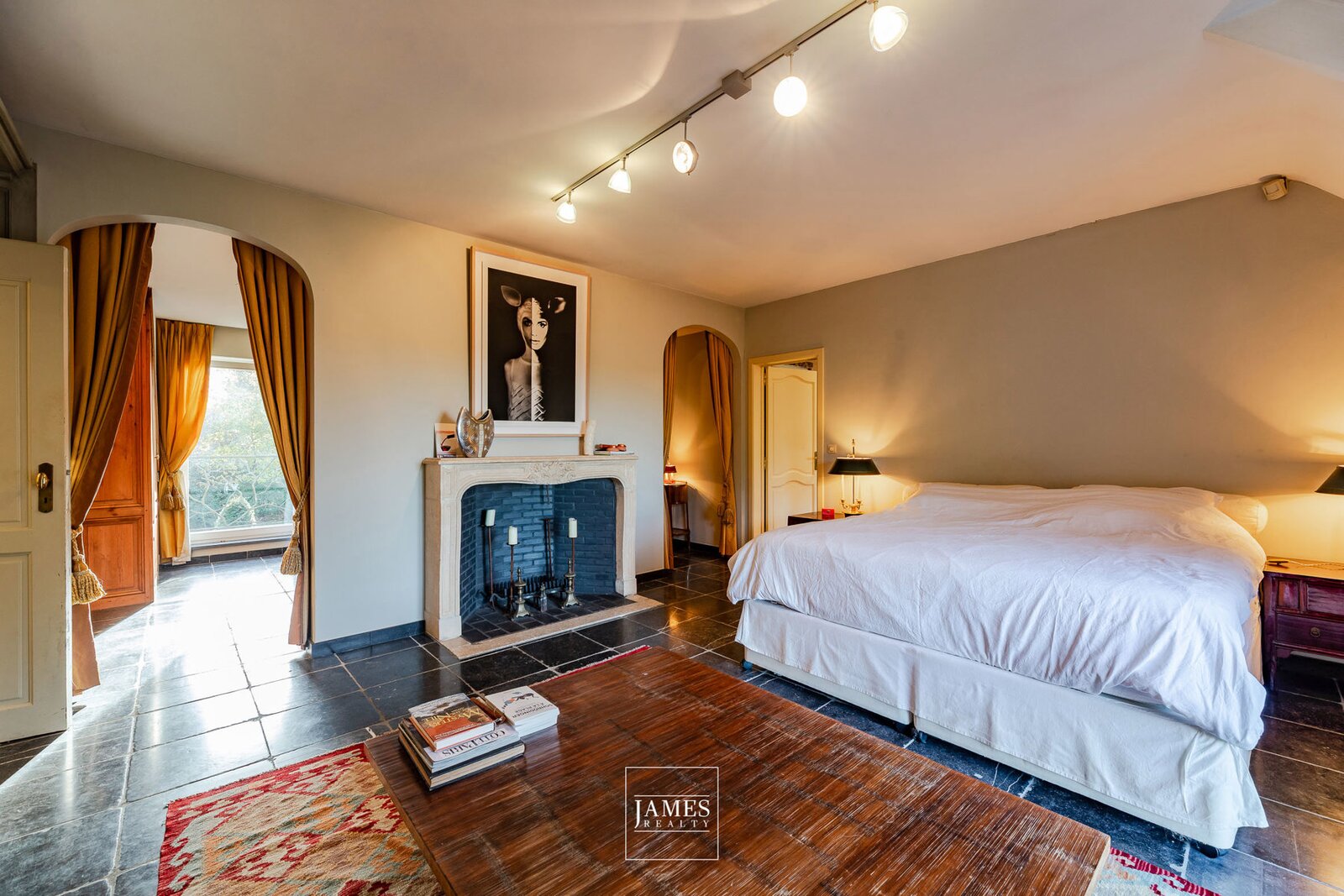 – The first faces the garden and features custom oak paneling and an 18th-century Regency bioethanol fireplace (existing flue), bathed in light and opening onto the terrace.
