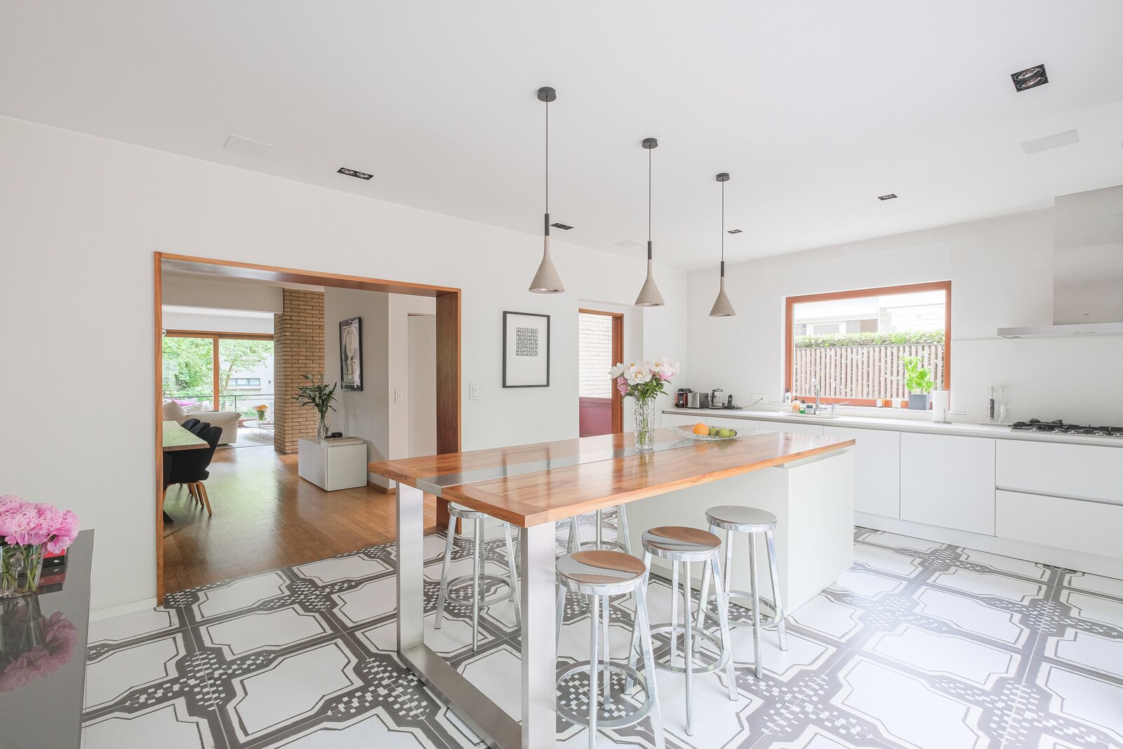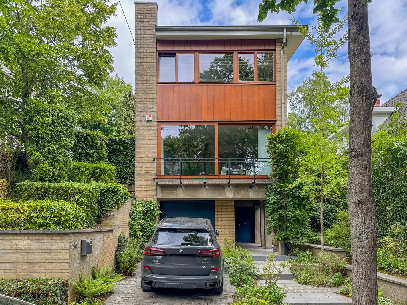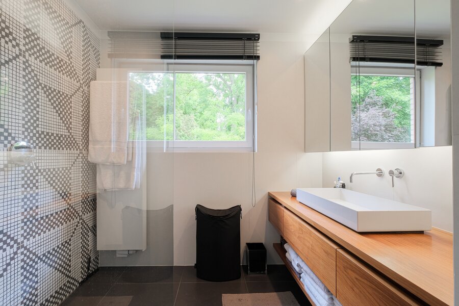 Close to the French Lycée and Dieweg, elegant modernist villa with a total gross surface area of ± 280 m², featuring a landscaped garden on a plot of nearly ± 460 m². It is composed as follows: Ground floor: entrance hall, garage, cloakroom, separate guest toilet, laundry room, boiler room, cellar space. 1st floor: living room / dining room of ± 58 m², fully equipped eat-in kitchen of ± 28 m². 2nd floor: night hall, master bedroom of ± 20 m² with adjoining shower room, 2 bedrooms of ± 11 and 11 m², bathroom, separate toilet, bedroom of ± 24 m² with adjoining shower room (WC). Also: double glazing, compliant electrical installation, air conditioning in all bedrooms, gas condensing boiler, insulated roof, quality materials, water softener, automatic lighting and irrigation in the garden, functional fireplace, house in excellent condition. EPC E. To be discovered without delay!