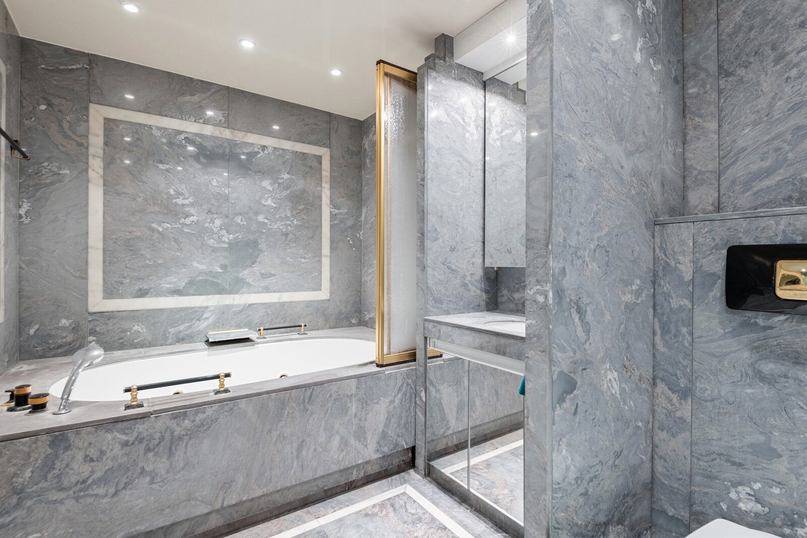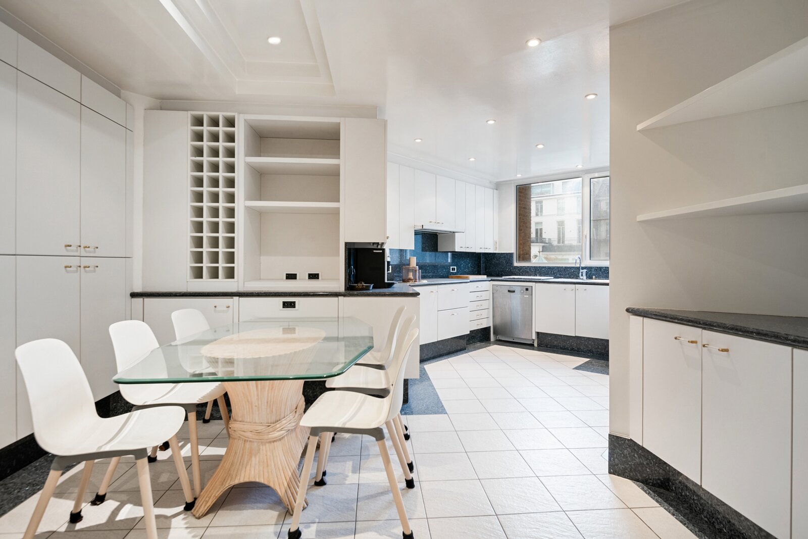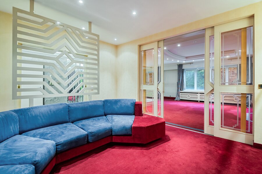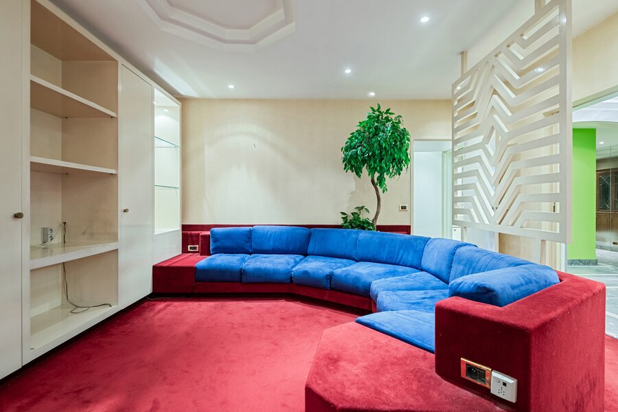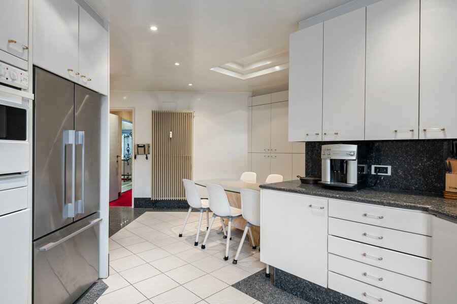 The spacious living and dining area are bathed in natural light thanks to the large windows at the front, with a beautiful view of the greenery. The finishing with colorful rugs adds a rich, warm atmosphere to the living spaces, while the marble floors ensure a timeless and durable finish.