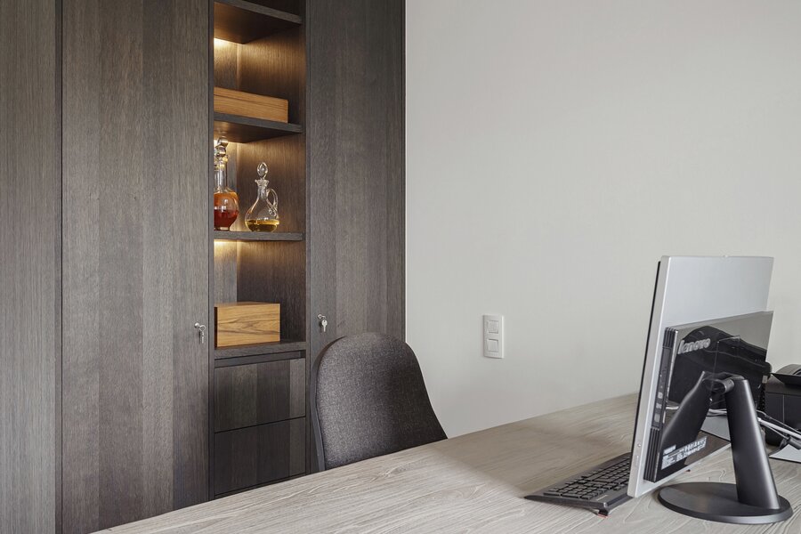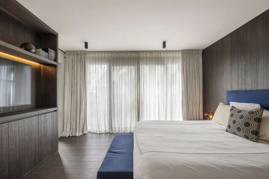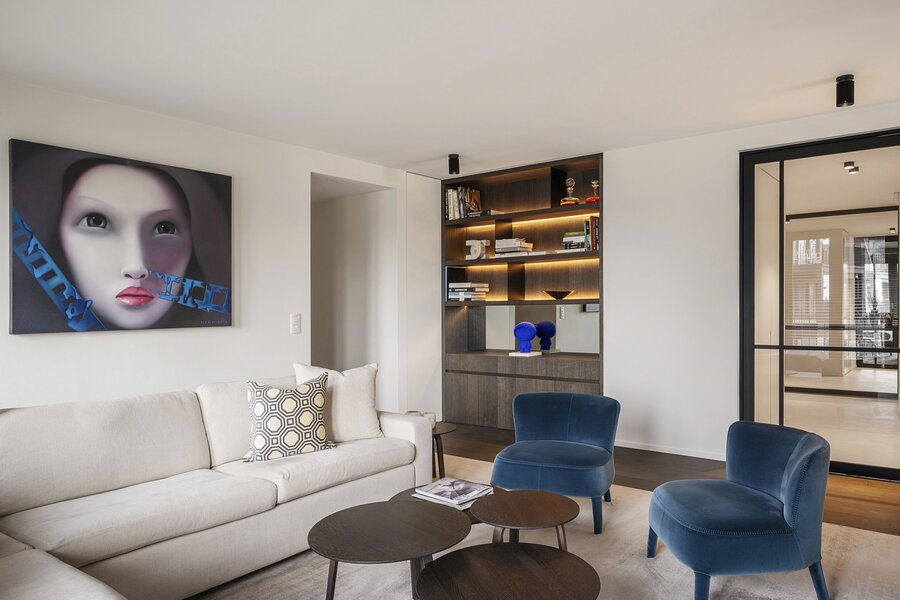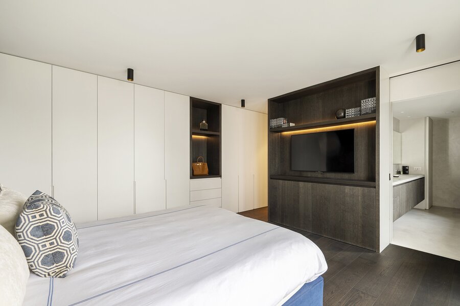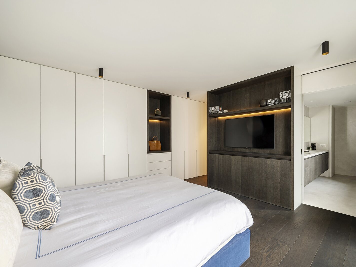 The apartment has a spacious entrance hall with cloakroom and guest toilet. The living room with attractive fireplace (double-sided) has several seating areas and a dining area, followed by a south- and west-facing terrace with a beautiful frontal view of the lake. A luxuriously equipped kitchen with cooking island. Adjacent to this is a spacious laundry/storage room. The night hall leads to three bedrooms. A master suite with dressing room, en-suite bathroom (bath and shower), separate toilet and a private terrace. Separate toilet. In addition, two spacious bedrooms with custom-made wardrobes, each with an en-suite shower room and a terrace.