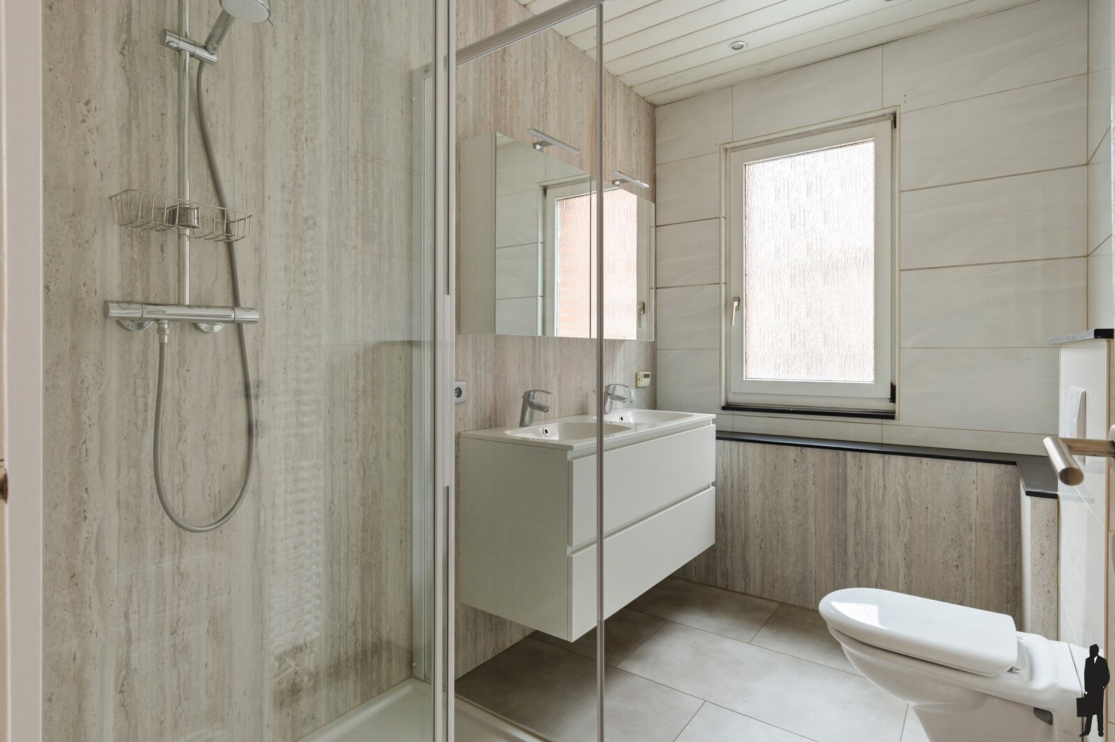 Indeling: De inkomhal leidt naar een lichtrijke woon- en eetruimte met parket en sierschouw. Aansluitend een volledig uitgeruste keuken met toegang tot terras en stadstuin. Apart gastentoilet.