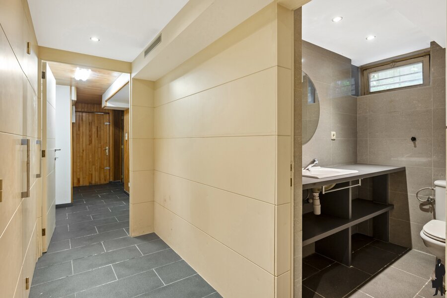 De kelderverdieping biedt een polyvalente ruimte (bureau/hobbykamer), berging, wasplaats, technische ruimte en extra toilet, met toegang tot de tuin.