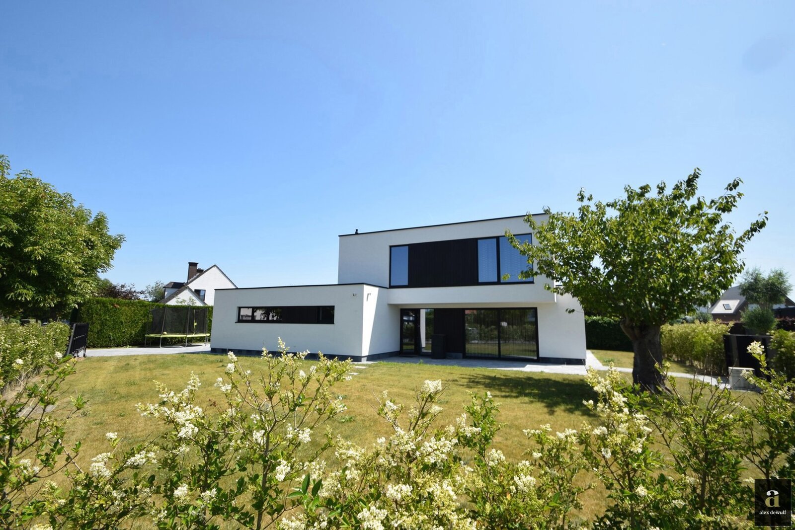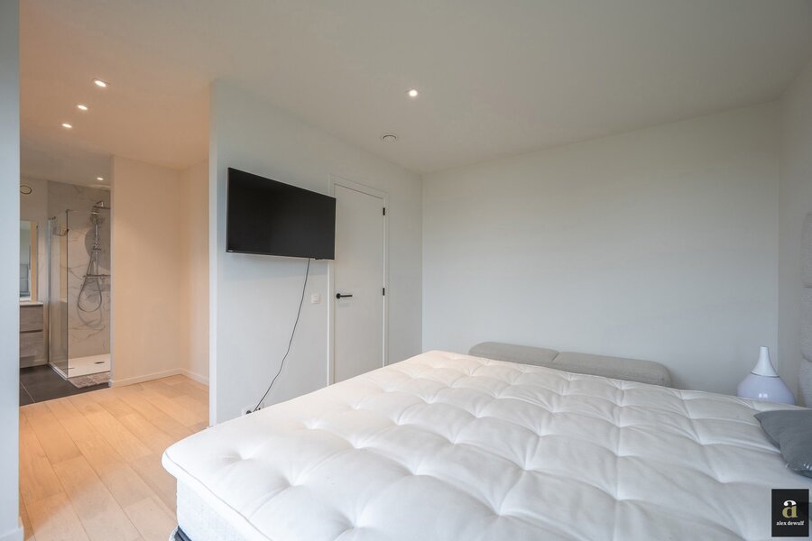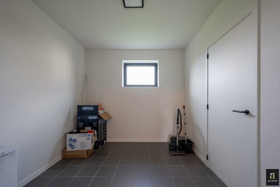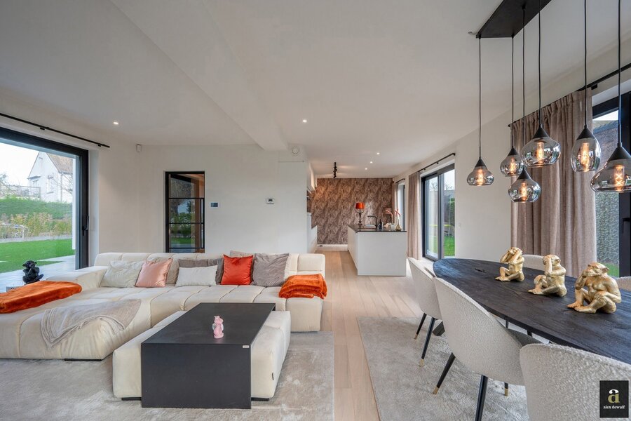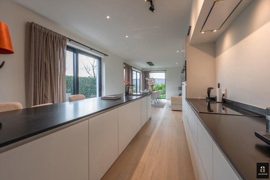 Exclusively for sale: stunning modern detached villa set on a 813 m² plot, located in a quiet residential environment. Layout: spacious entrance hall with cloakroom and guest toilet. Bright living and dining area with direct access to the sunny garden. Fully equipped open-plan kitchen with all appliances. First bedroom with adjoining dressing room and bathroom (washbasin and walk-in shower). Spacious laundry room.